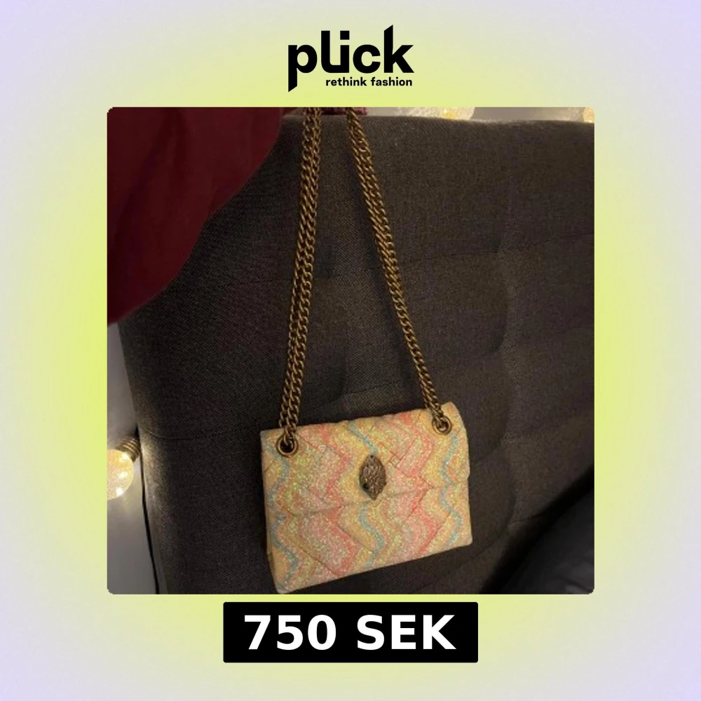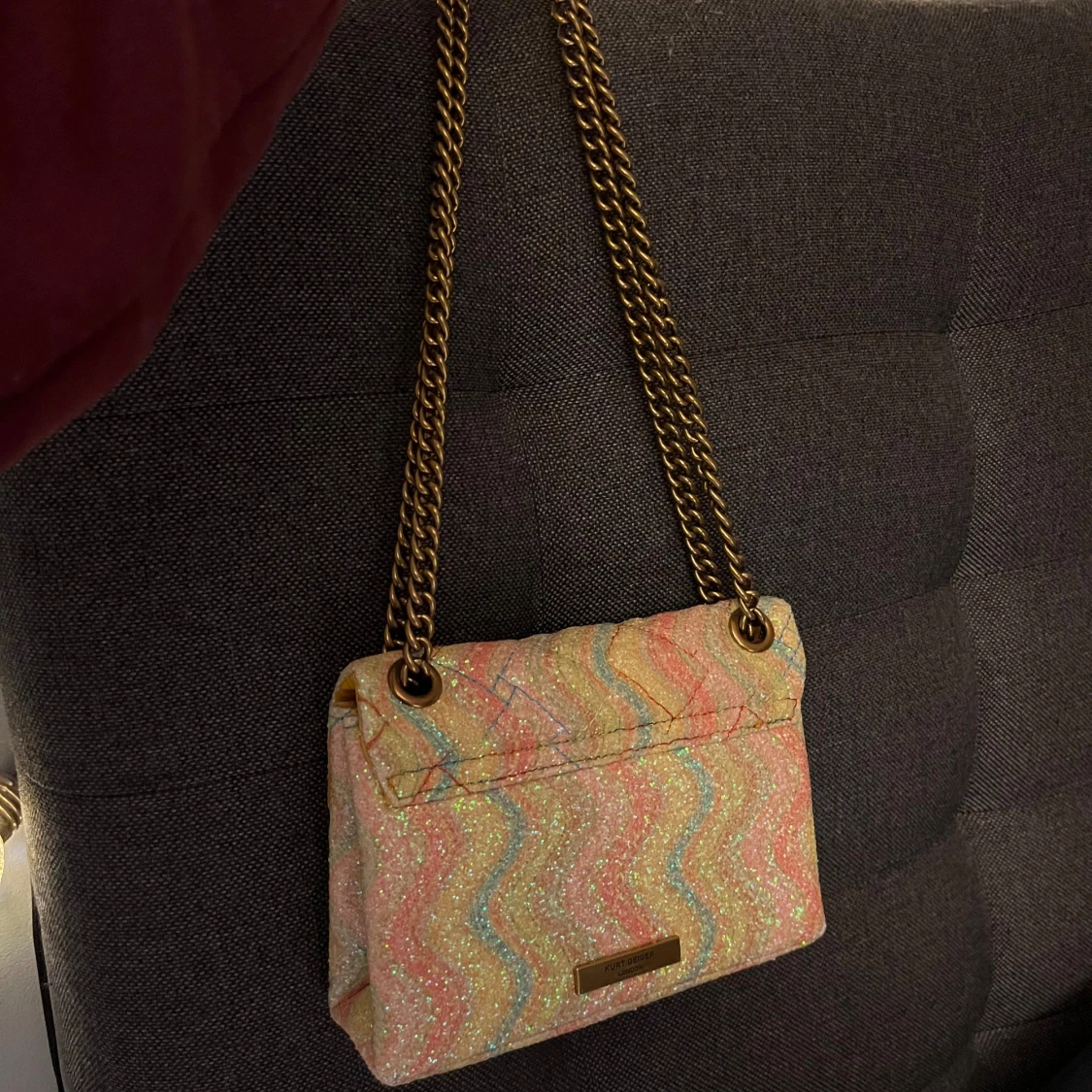 Färgglad axelväska från Kurt Geiger med glittrigt vågmönster i rosa, gult, blått och beige. Väskan har kedjerem i guld, quiltad framsida och ikoniskt lås. Sparsamt använd så i nyskick. Köpt för närmre 3000 💕 är i den mindre modellen på väska