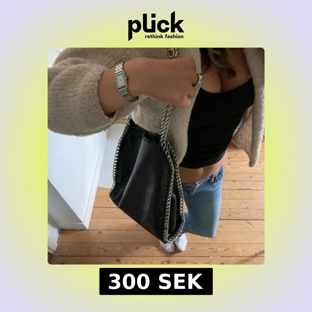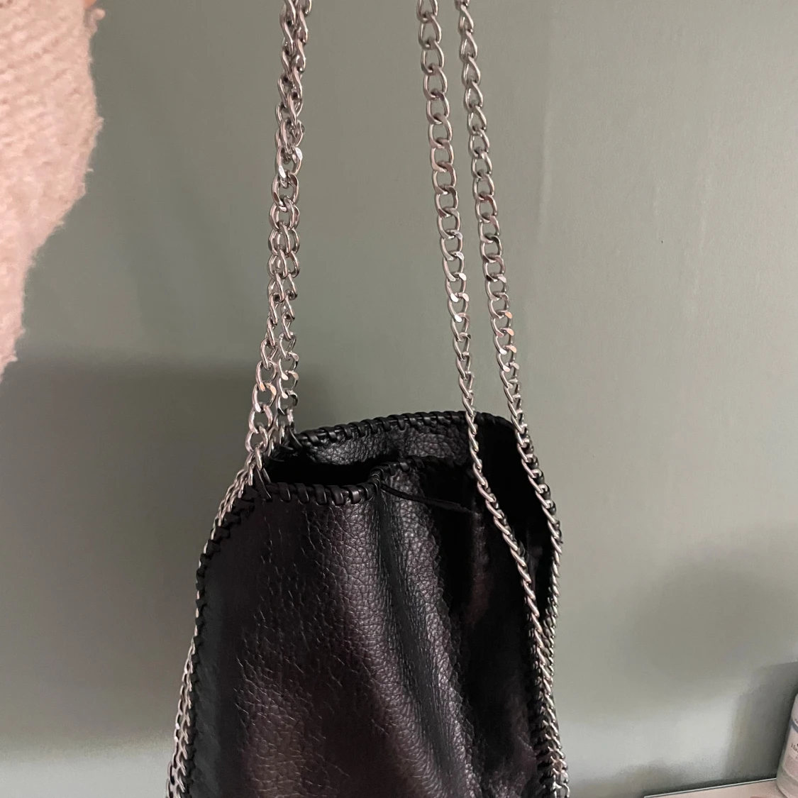 Snygg svart axelväska från Tiamo i skinnimitation med grova silverfärgade kedjor som axelrem och dekor runt kanterna. Väskan har en cool, lite slouchy form och stängs med dragkedja. Perfekt för dig som gillar en edgy och trendig look. Liten defekt (se bild 4) men märks knappt av