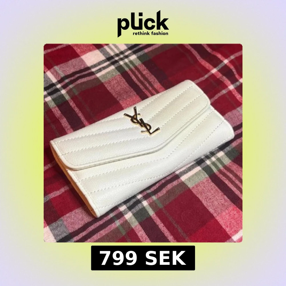 Snygg vit plånbok från YSL i äkta skinn med guldigt YSL-logo framtill. Plånboken har quiltad design, flera fack och dragkedja inuti för mynt. Perfekt för dig som vill ha en lyxig och stilren accessoar.