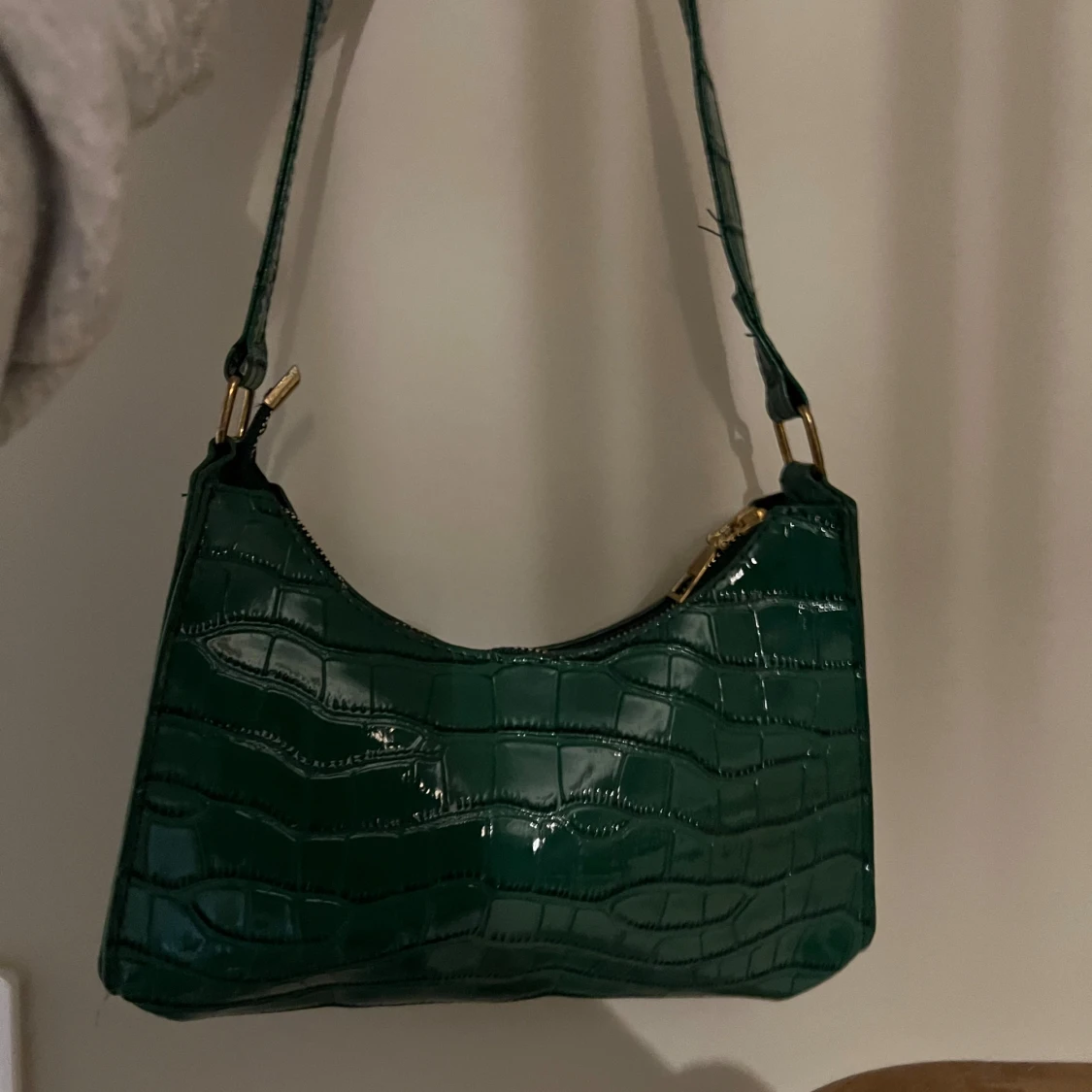 Säljer en snygg grön axelväska med krokodilmönster. Väskan är i syntetmaterial och har en dragkedja upptill. Perfekt för att ge en färgklick till din outfit!