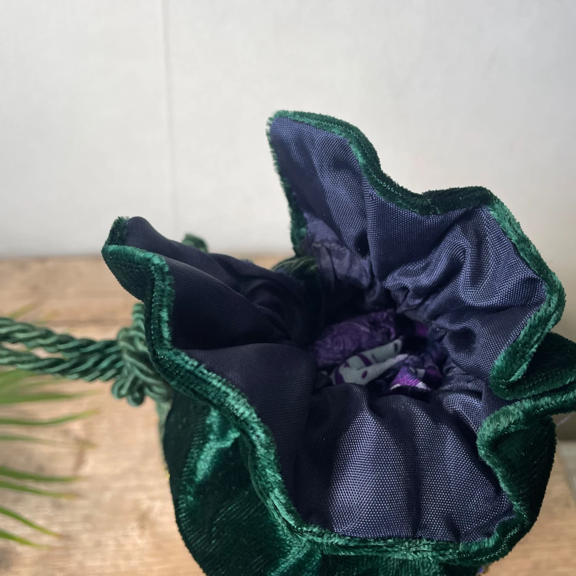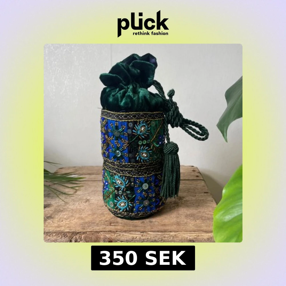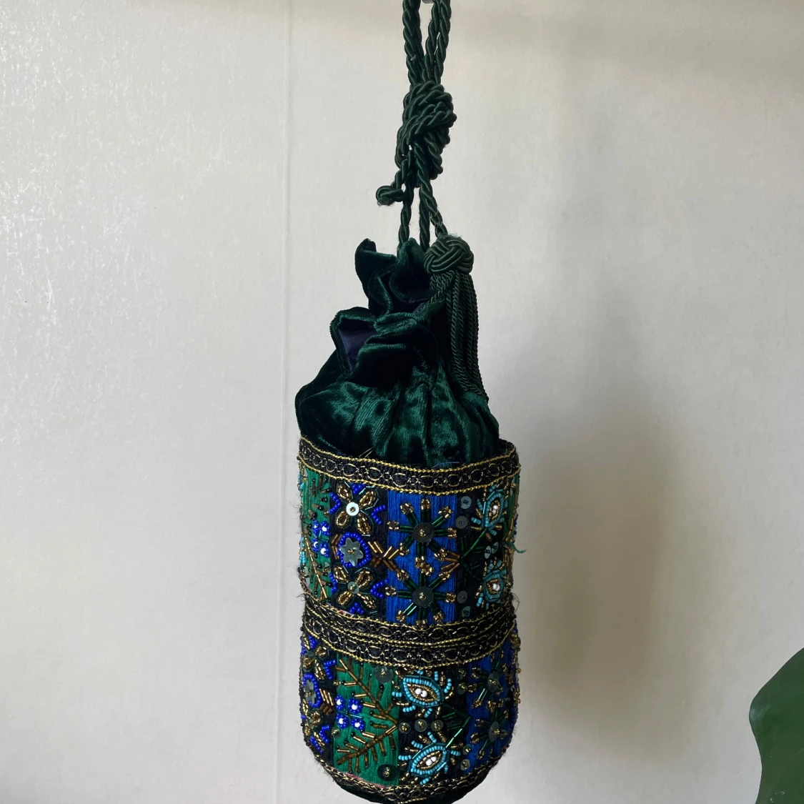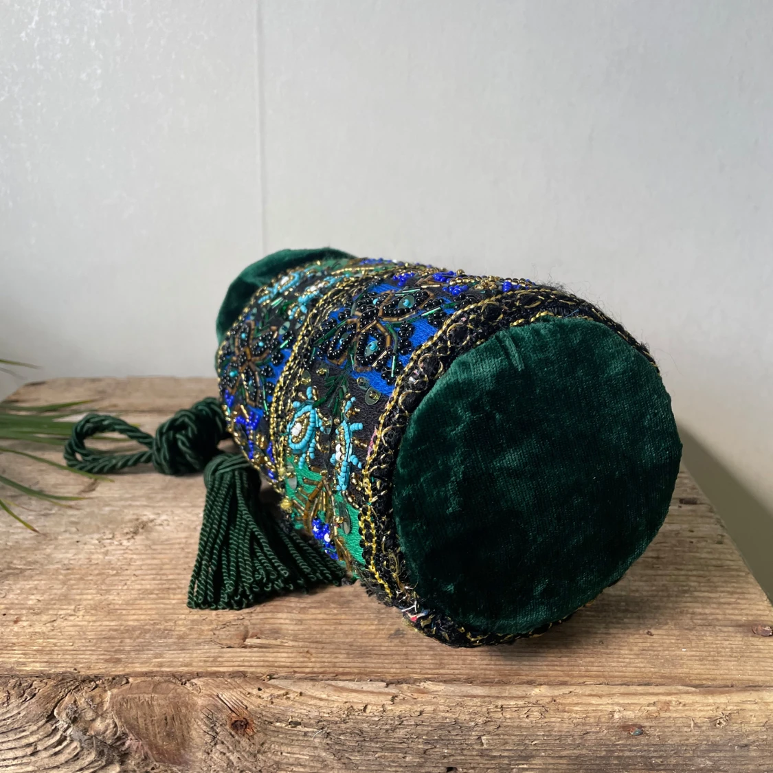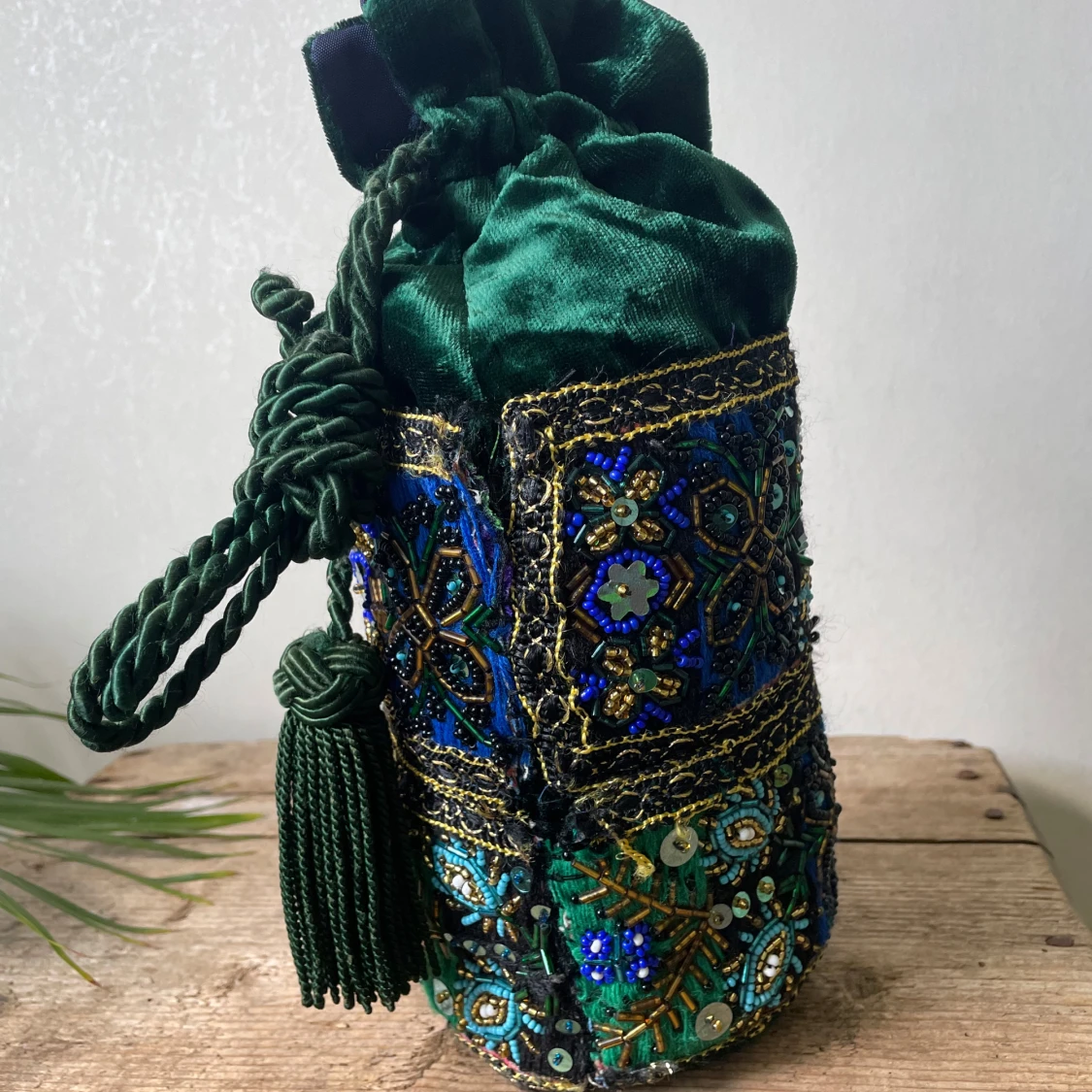 Unik handgjord grön väska i sammet med broderade detaljer, pärlor och paljetter i blått och guld. Väskan har dragsko upptill och dekorativ tofs. Perfekt för dig som vill sticka ut med en färgstark accessoar. Oanvänd men några snören sticker ut från banden.