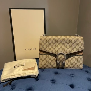 En Dionysus i perfekt skick! Slutsåld och finns inte längre att få tag på i medium storlek. Använd med försiktighet och alltid väl omhändertagen. Förvarad i dustbag när den inte har använts. Nypris ca 25.000kr. Mått: Bredd: 30cm Höjd: 21cm Djup: 10cm Länk till väskan: https://www.gucci.com/se/en_gb/pr/women/handbags/shoulder-bags-for-women/dionysus-medium-gg-shoulder-bag-p-403348KHNRN8642 Väskan kommer med: kvitto, dustbag och box. Fler bilder kan självklart skickas vid intresse.