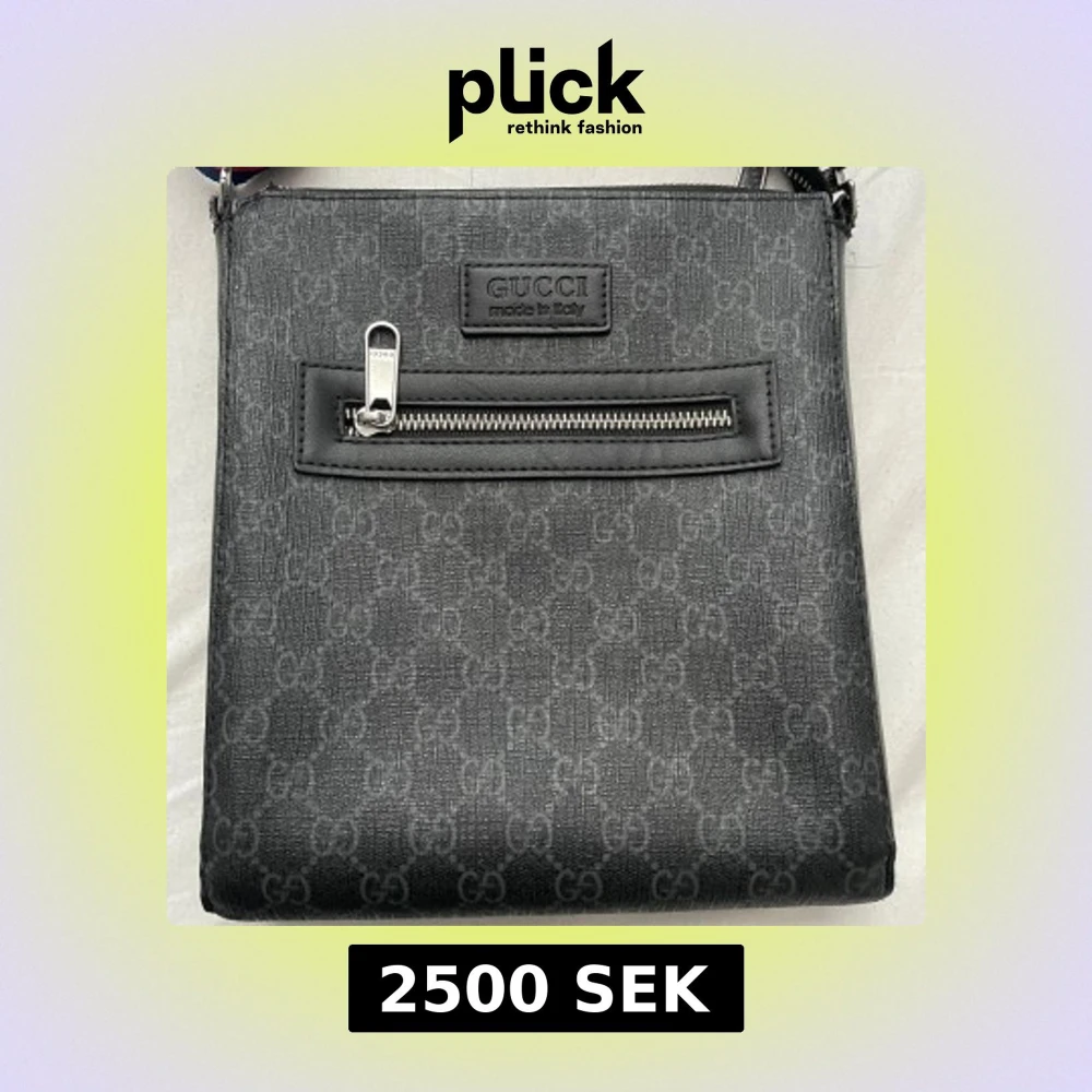 Snygg svart axelväska från Gucci med diskret GG-mönster. Väskan har en praktisk dragkedja framtill och en justerbar axelrem i blått och rött. Perfekt för att bära dina dagliga nödvändigheter med stil.