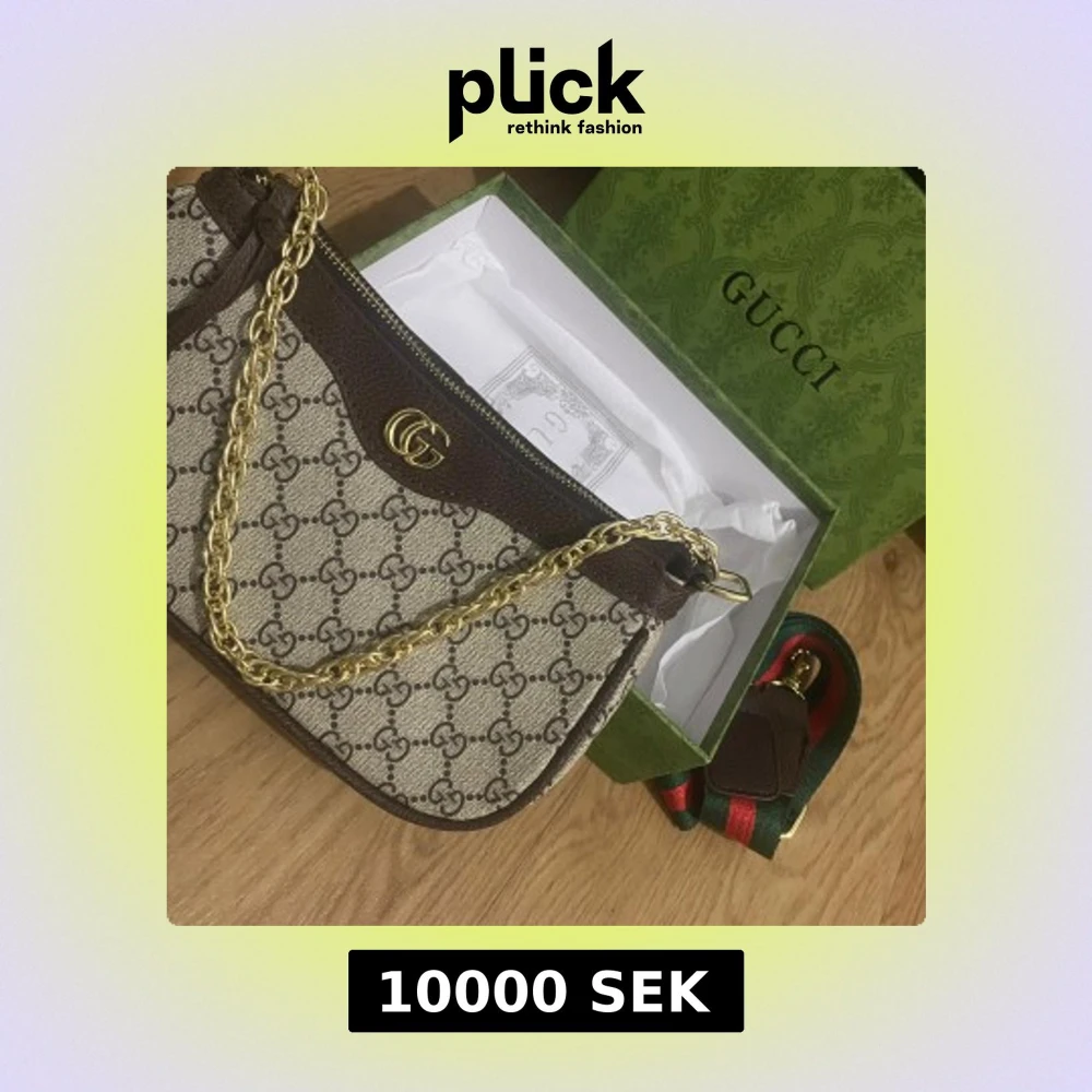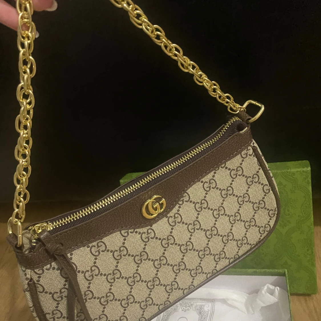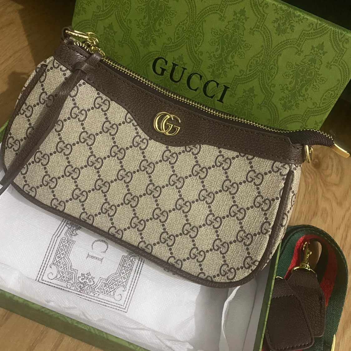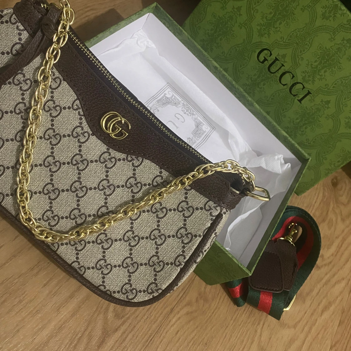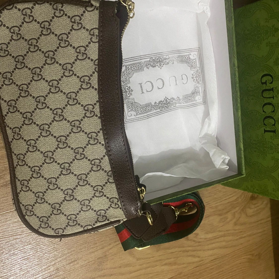 Snygg axelväska från Gucci i klassisk GG Supreme-mönster. Beige och brunt tyg med bruna skinn-detaljer, guldfärgad kedja och GG-logo framtill. Väskan har dragkedja och medföljande grön-röd axelrem. Perfekt för dig som vill ha en ikonisk designerlook🩷