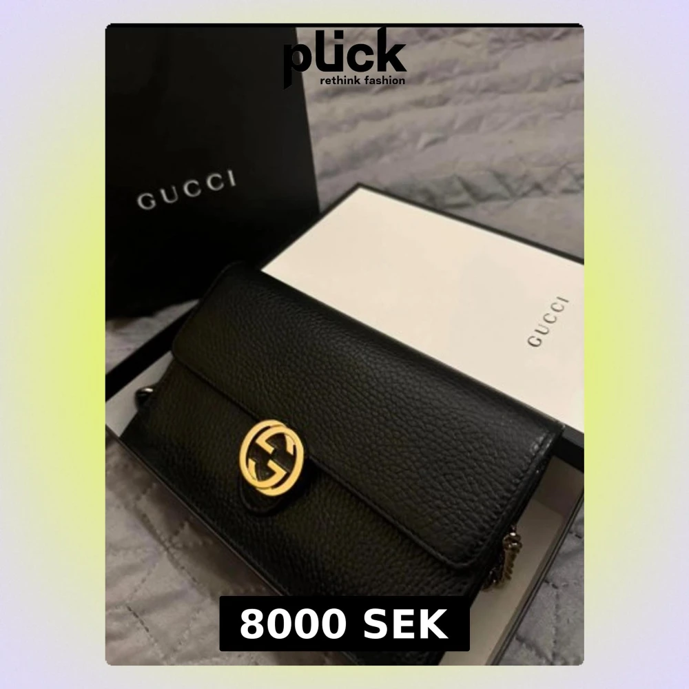Snygg svart axelväska från Gucci i äkta skinn med guldfärgat GG-spänne framtill. Kedjerem i metall och stilren, rektangulär form. Perfekt för dig som vill ha en klassisk och lyxig väska med ikonisk design och exklusiva detaljer.