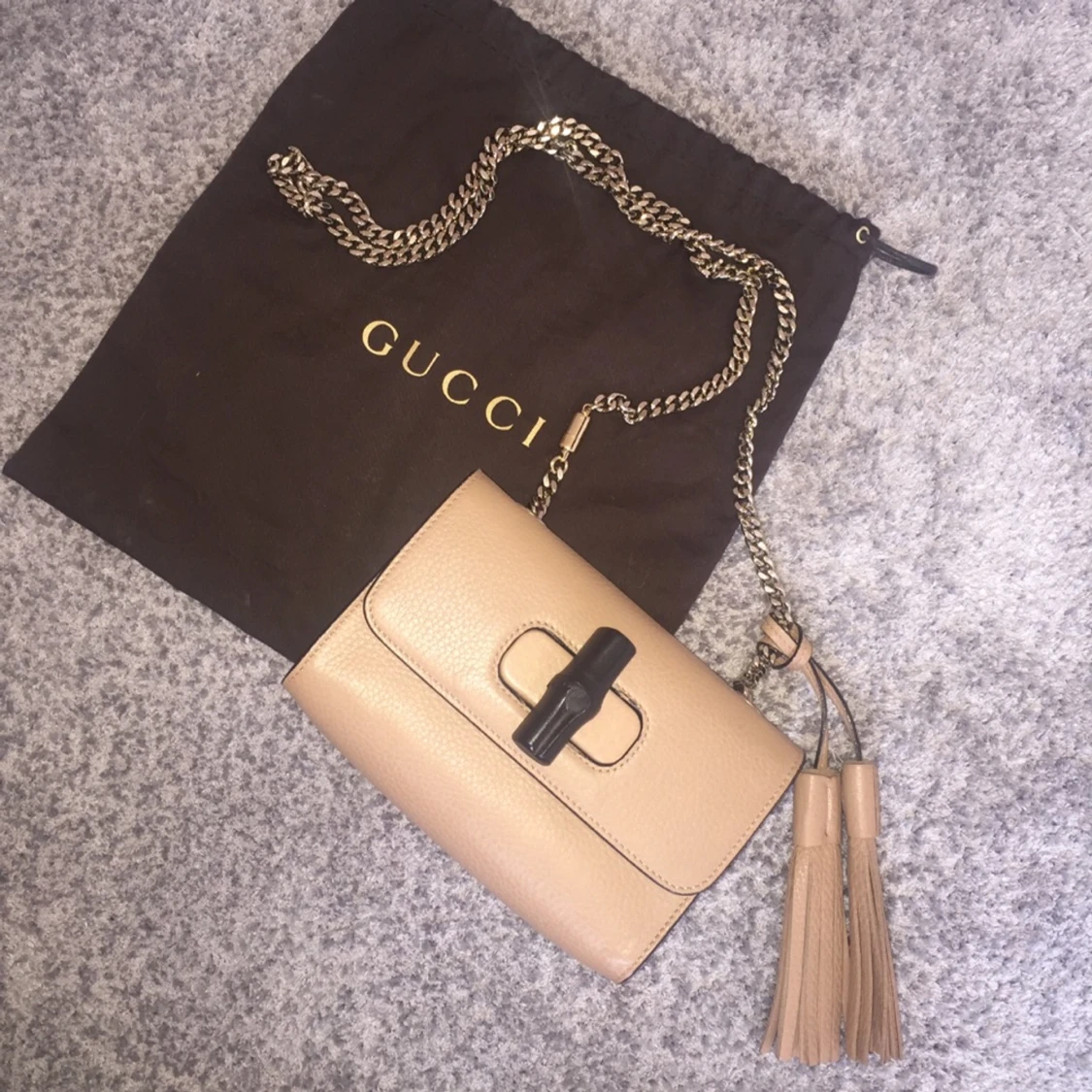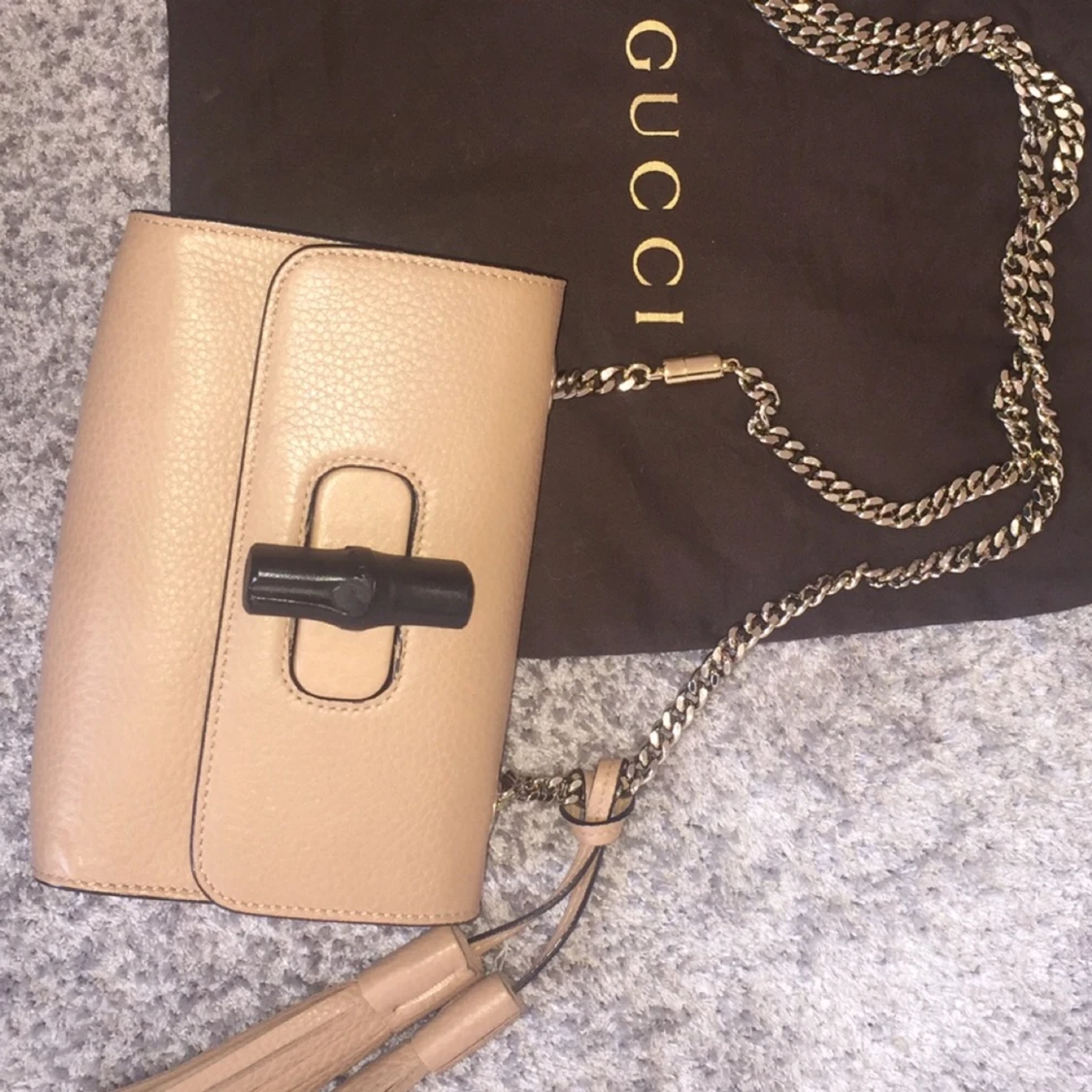 GUCCI Bamboo Bag i nudefärgat läder, guldkedja och den ikoniska bambuknäppningen. Perfekt skick, helt utan skavanker. Kommer med tillhörande dustbag. Nypris var ca 10.000kr på NK för drygt ett år sedan. Hör av dig om du önskar fler bilder eller har ytterligare frågor.