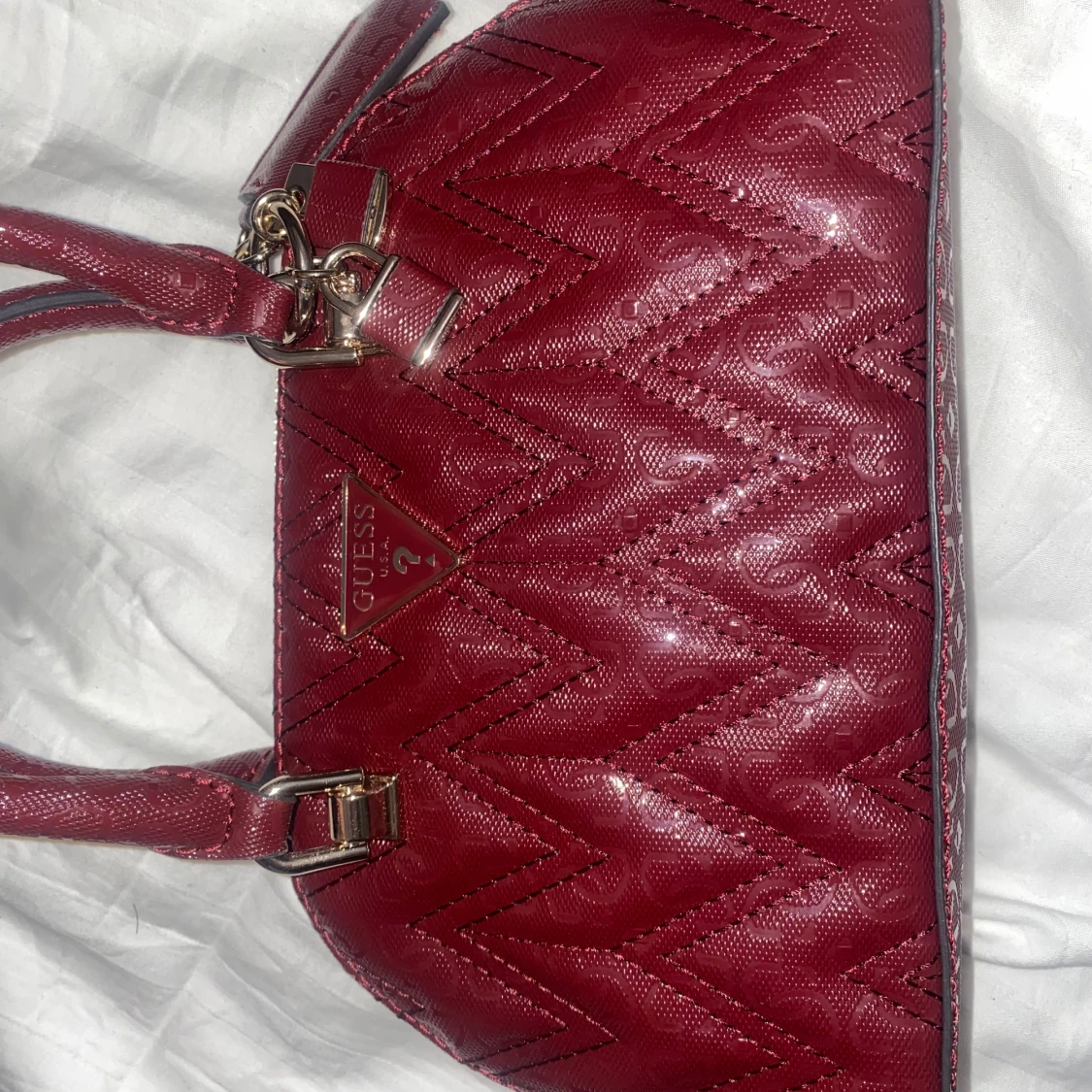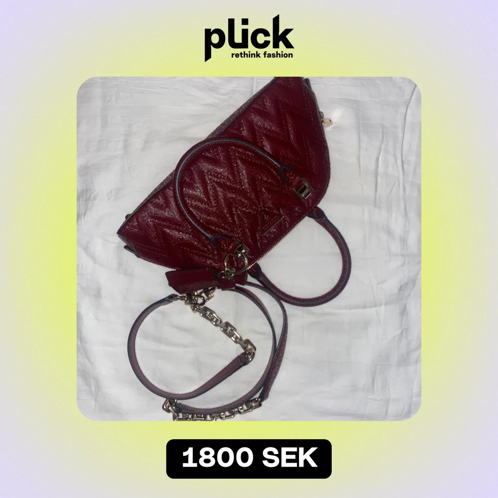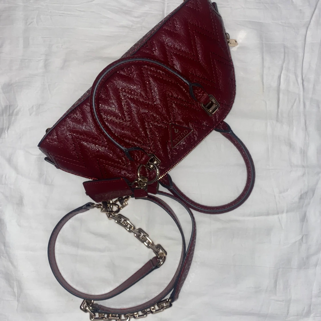 Snygg vinröd handväska i quiltat mönster med dragkedja och kedjedetaljer. Perfekt för höst och vinter, den har både handtag och en avtagbar axelrem. Väskan är i mycket bra skick och passar perfekt för både vardag och fest.