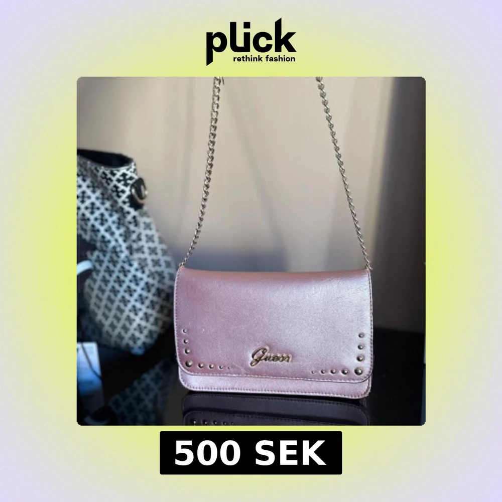 Snygg rosa axelväska från Guess med kedjerem och dekorativa nitar. Väskan har en elegant logotyp på framsidan och ett mönstrat foder inuti. Perfekt för att ge en touch av glamour till din outfit.