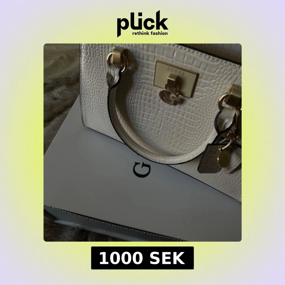 Snygg vit handväska från Guess med krokodilpräglat mönster och guldfärgade detaljer. Väskan har en praktisk dragkedja och dubbla handtag. Perfekt för att ge din outfit en lyxig touch. Helt oanvänd. Nypris 1800 kr.