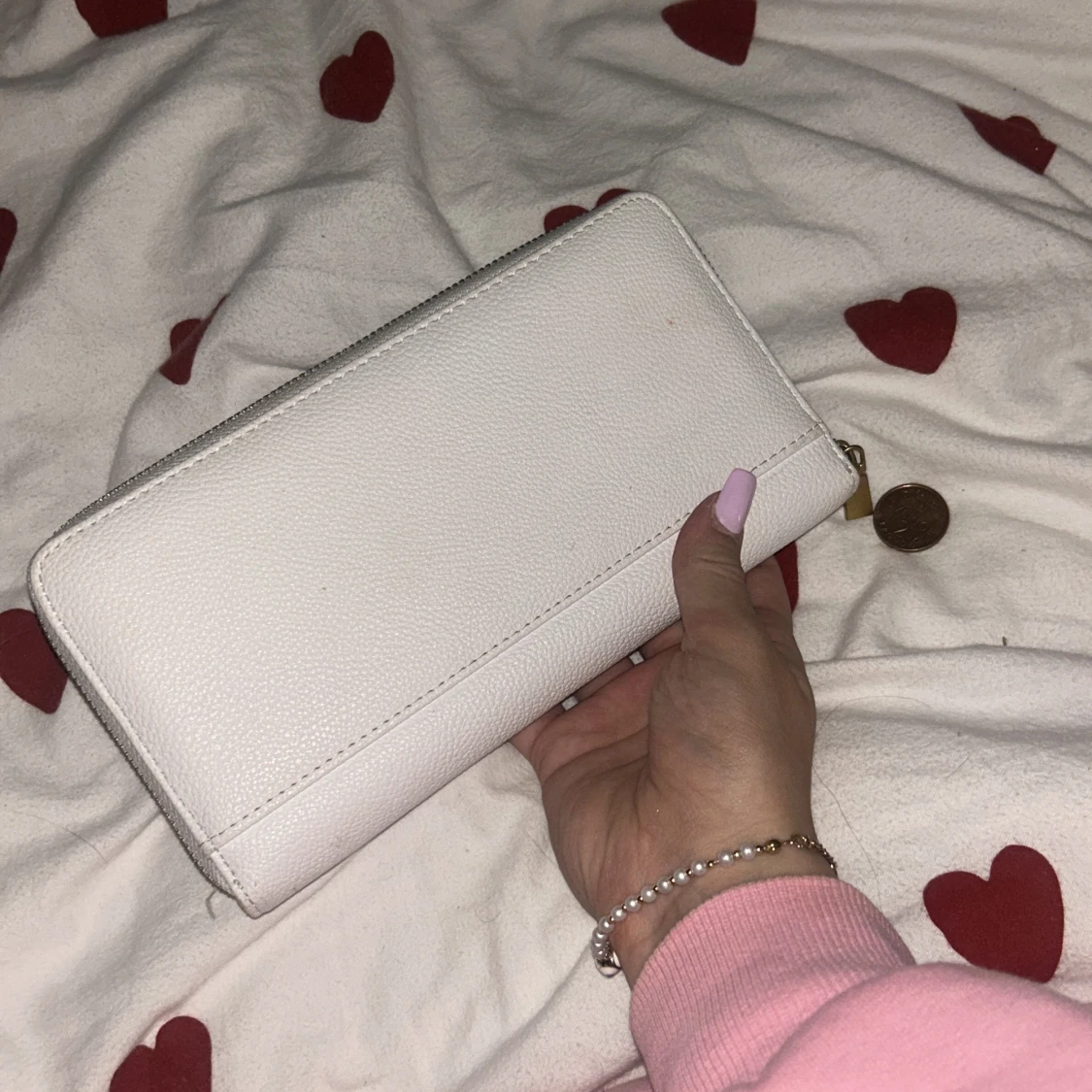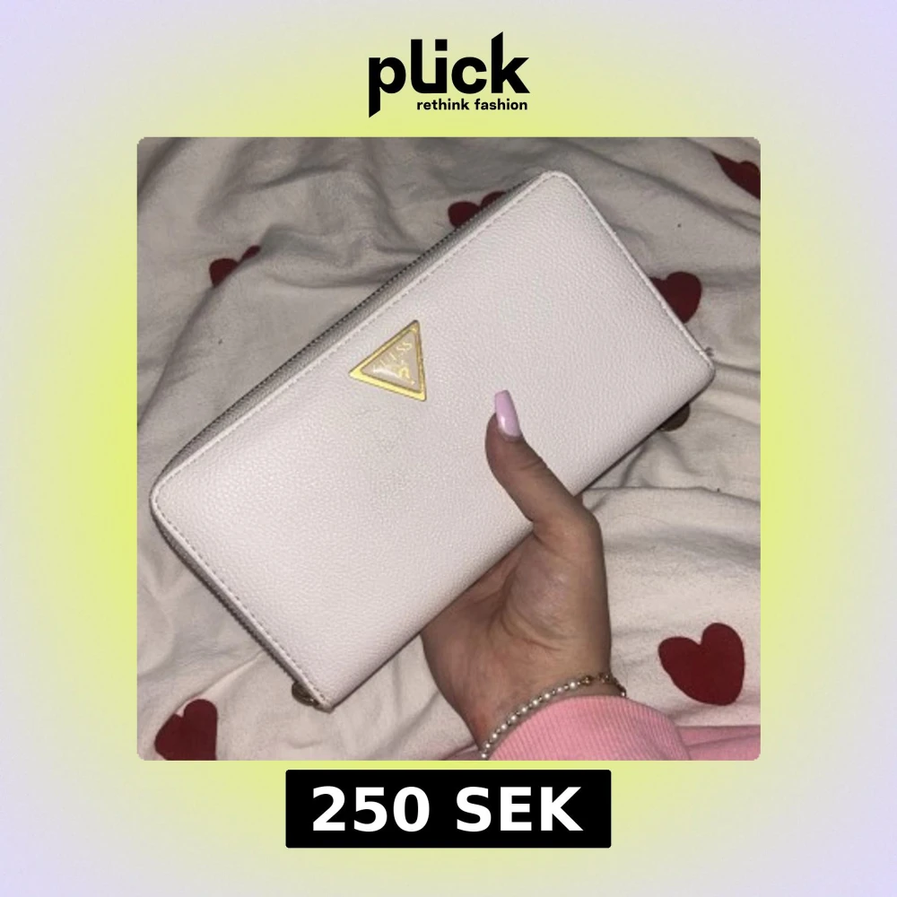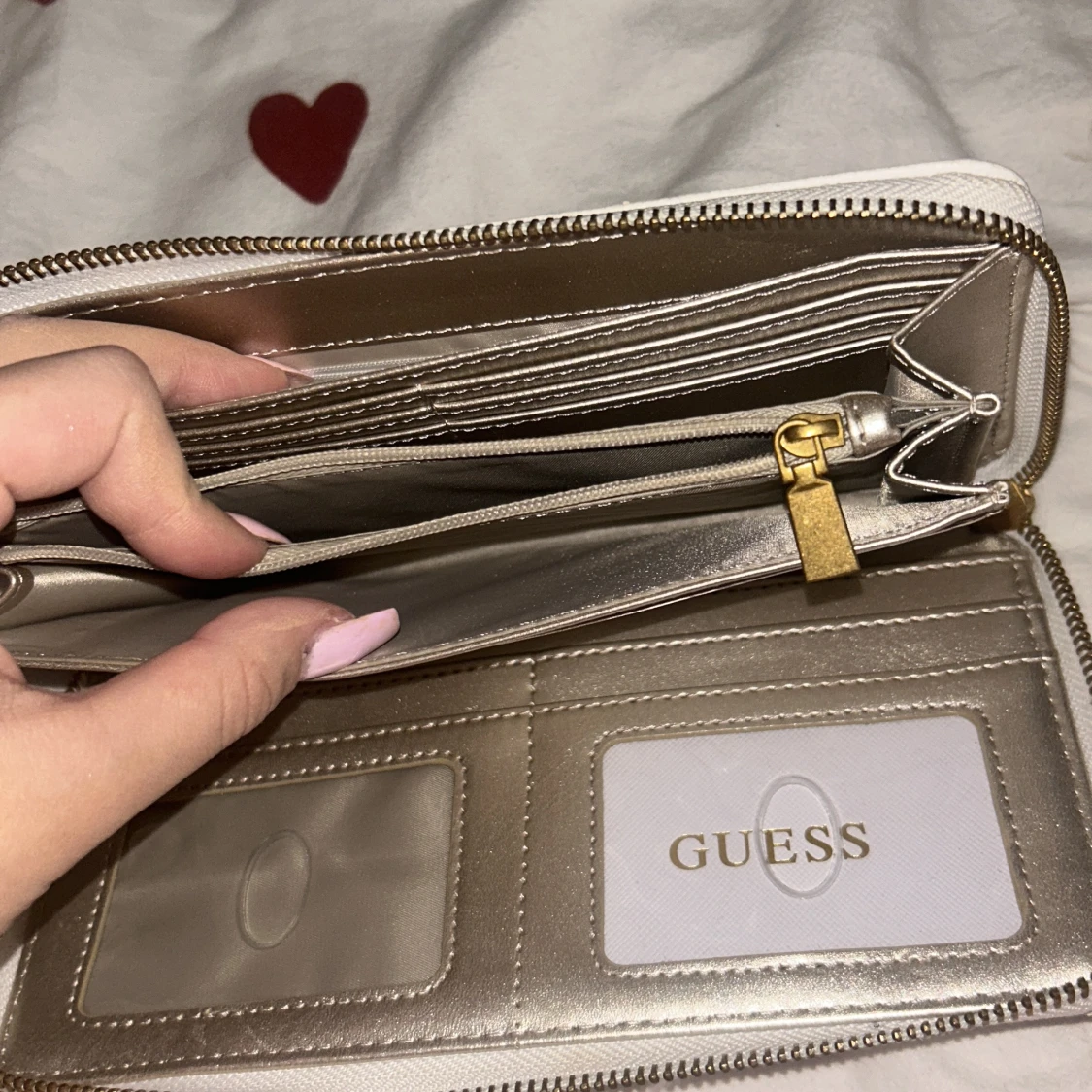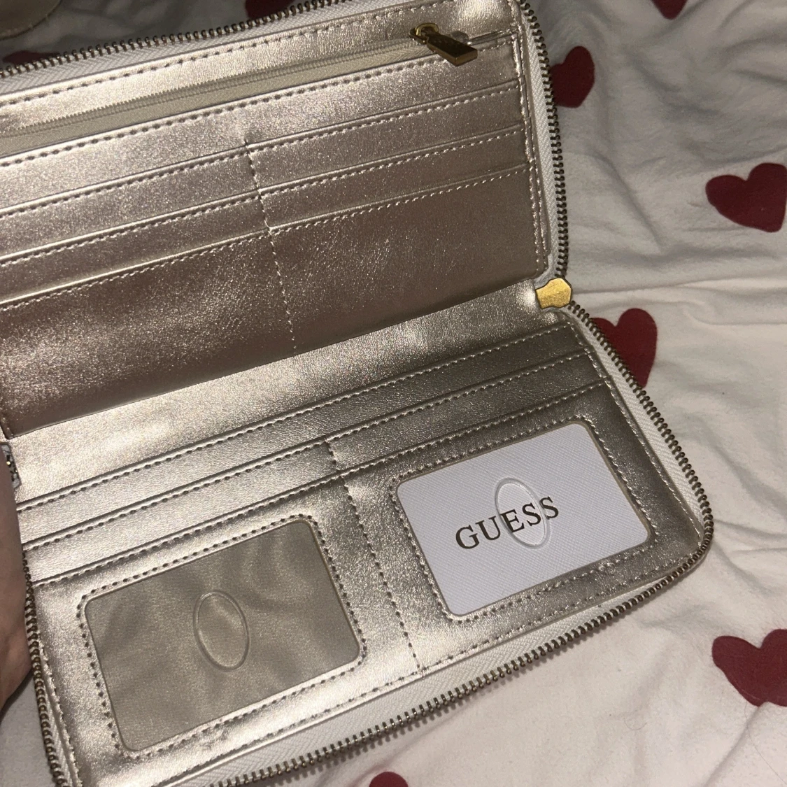 Säljer en stilren vit plånbok från Guess med guldfärgad dragkedja och logga. Plånboken har flera kortfack, myntfack med dragkedja och plats för sedlar. Insidan är metallic guld. Perfekt för att hålla ordning på dina kort och pengar.