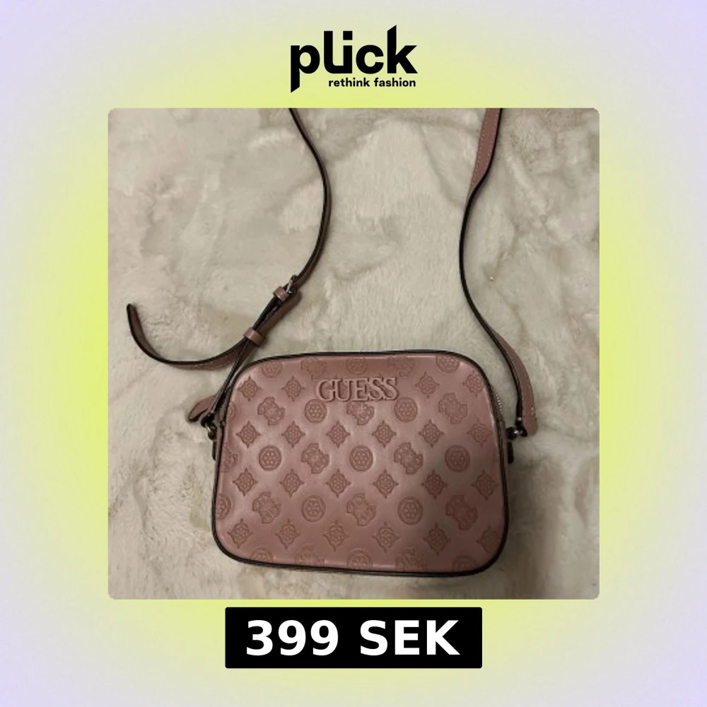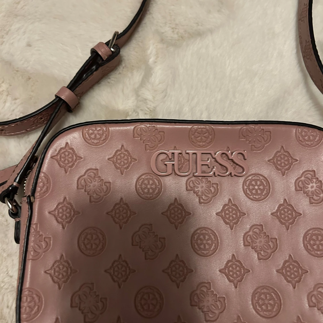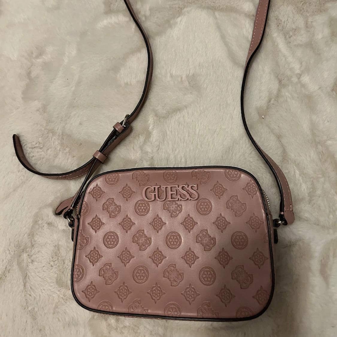 Snygg rosa axelväska från Guess i skinnimitation med präglat logomönster över hela väskan. Justerbar axelrem och dragkedja upptill. Insidan är ljus med Guess-logga och har ett innerfack med dragkedja. Perfekt storlek för det viktigaste.