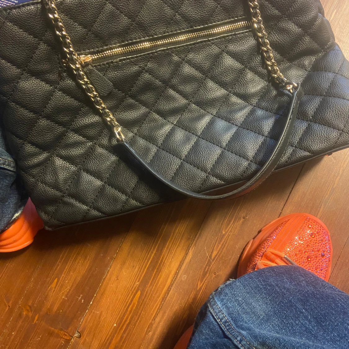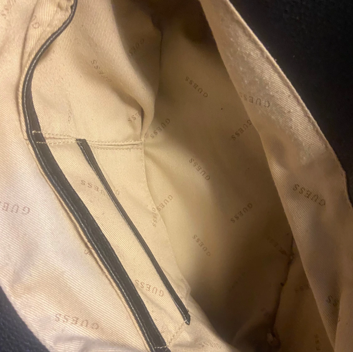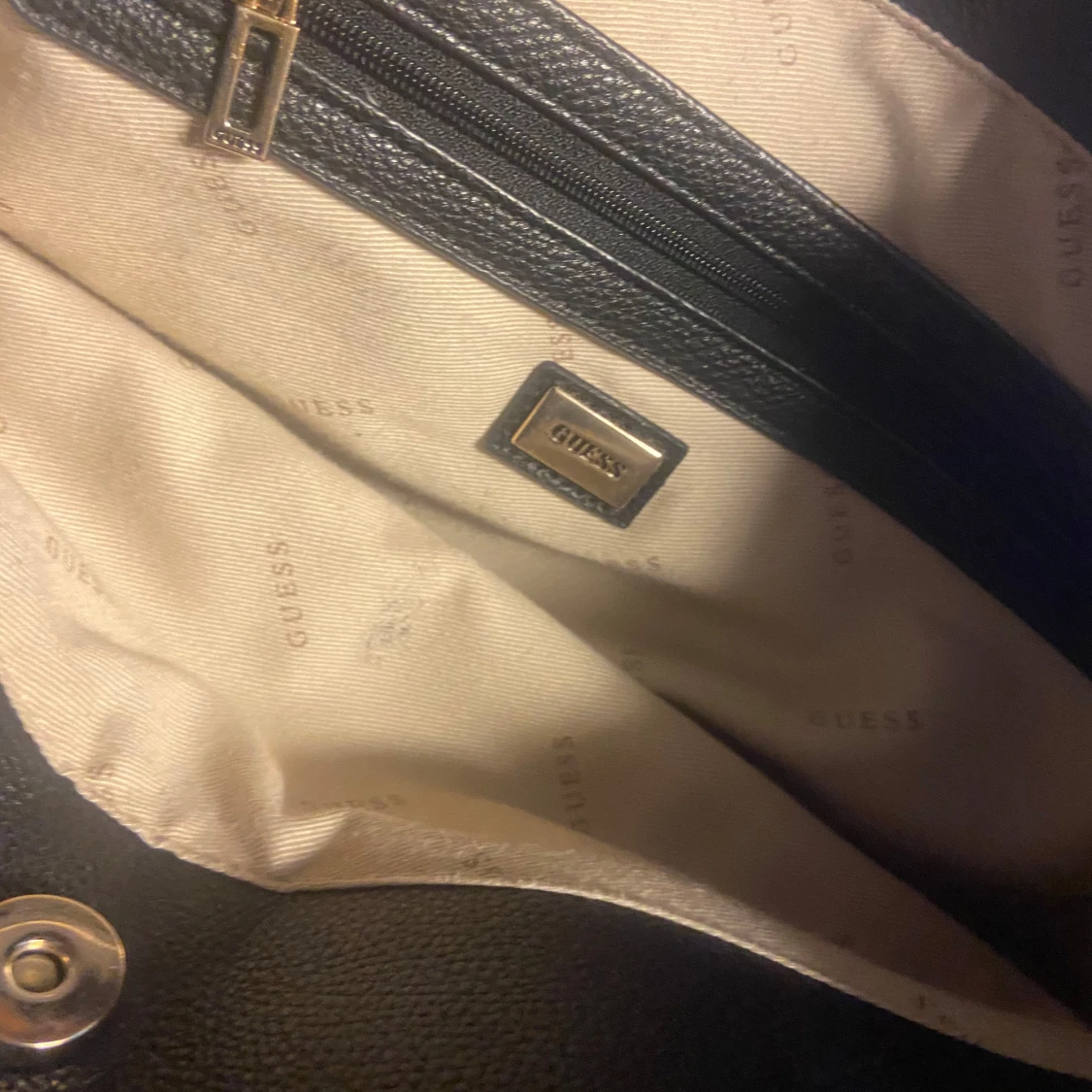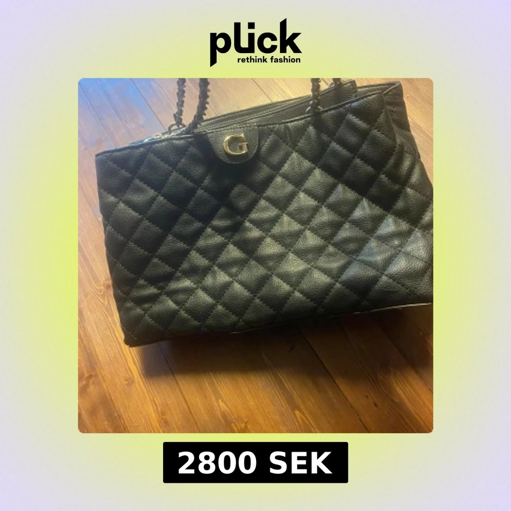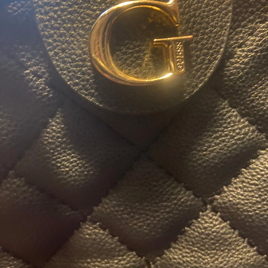 Säljer en svart quiltad handväska från Guess med kedjehandtag och guldfärgade detaljer. Väskan är tillverkad i skinnimitation och har dragkedja baktill samt ett stort G i metall framtill. Insidan är ljus med Guess-logga. Perfekt för dig som gillar stilrena accessoarer.