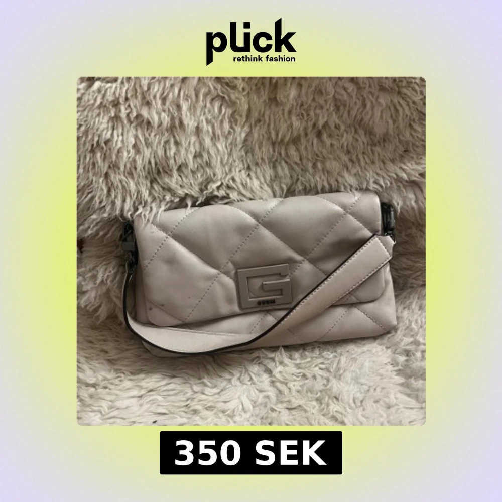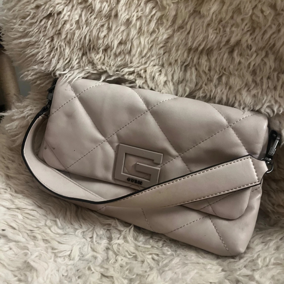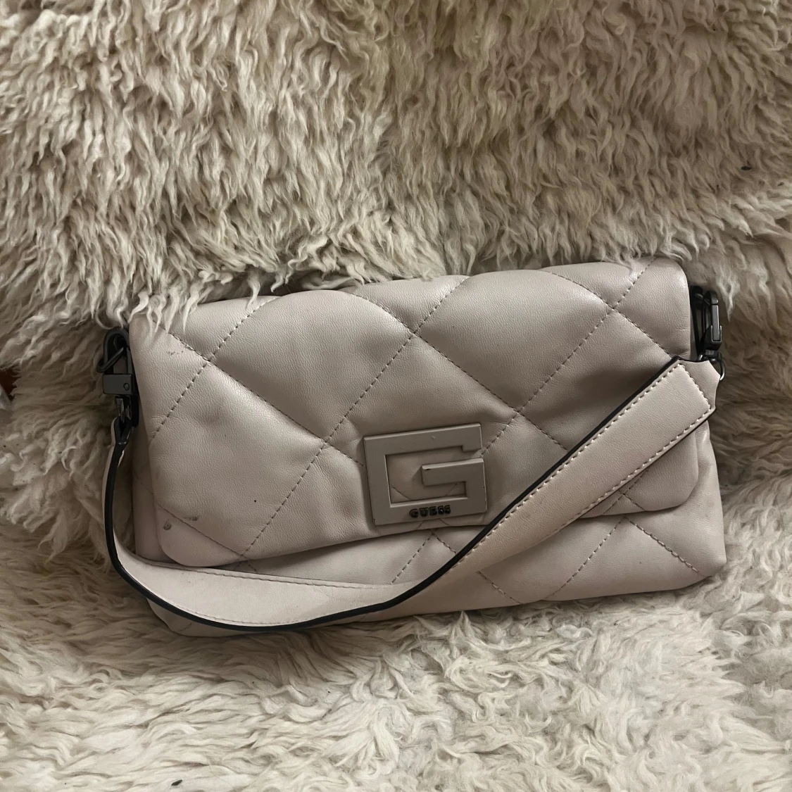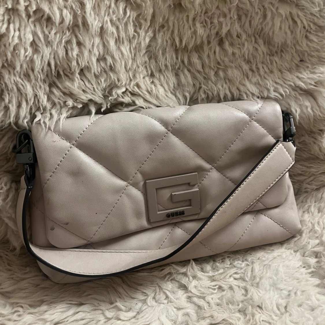 Snygg beige axelväska från Guess med quiltad design och ett stort G-emblem på framsidan. Väskan är perfekt för att bära dina nödvändigheter med stil.