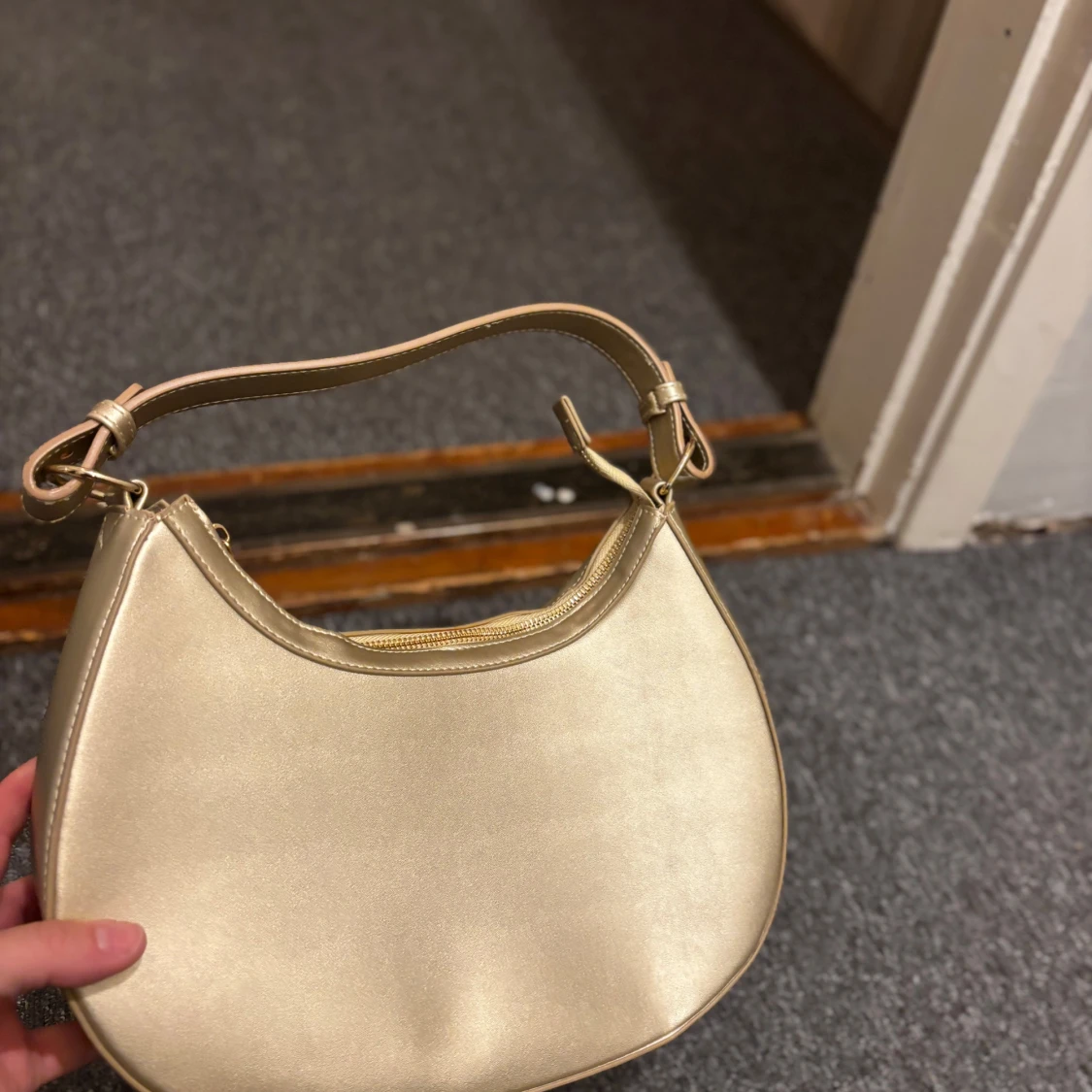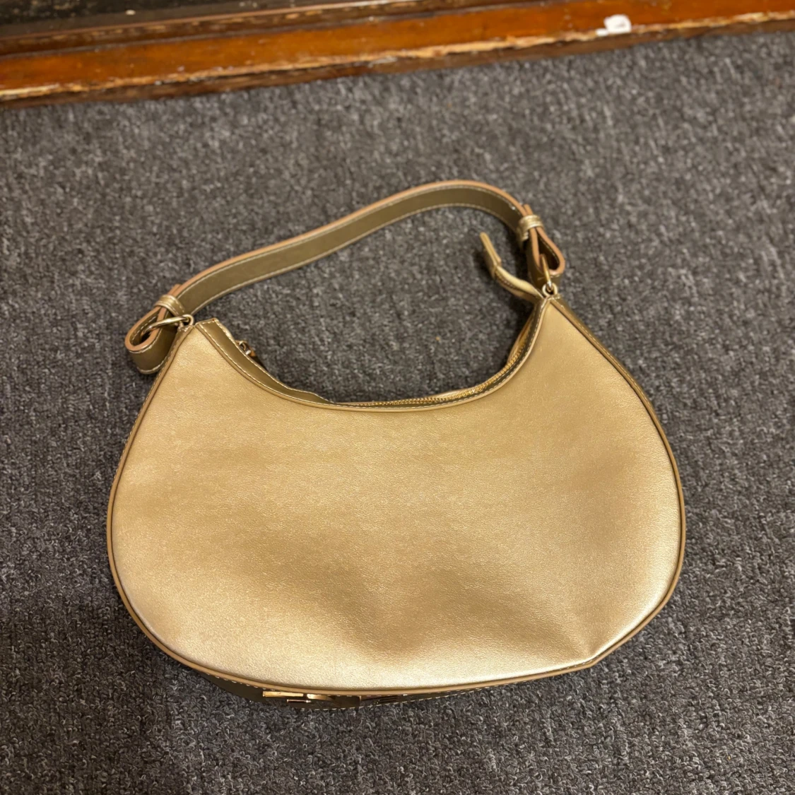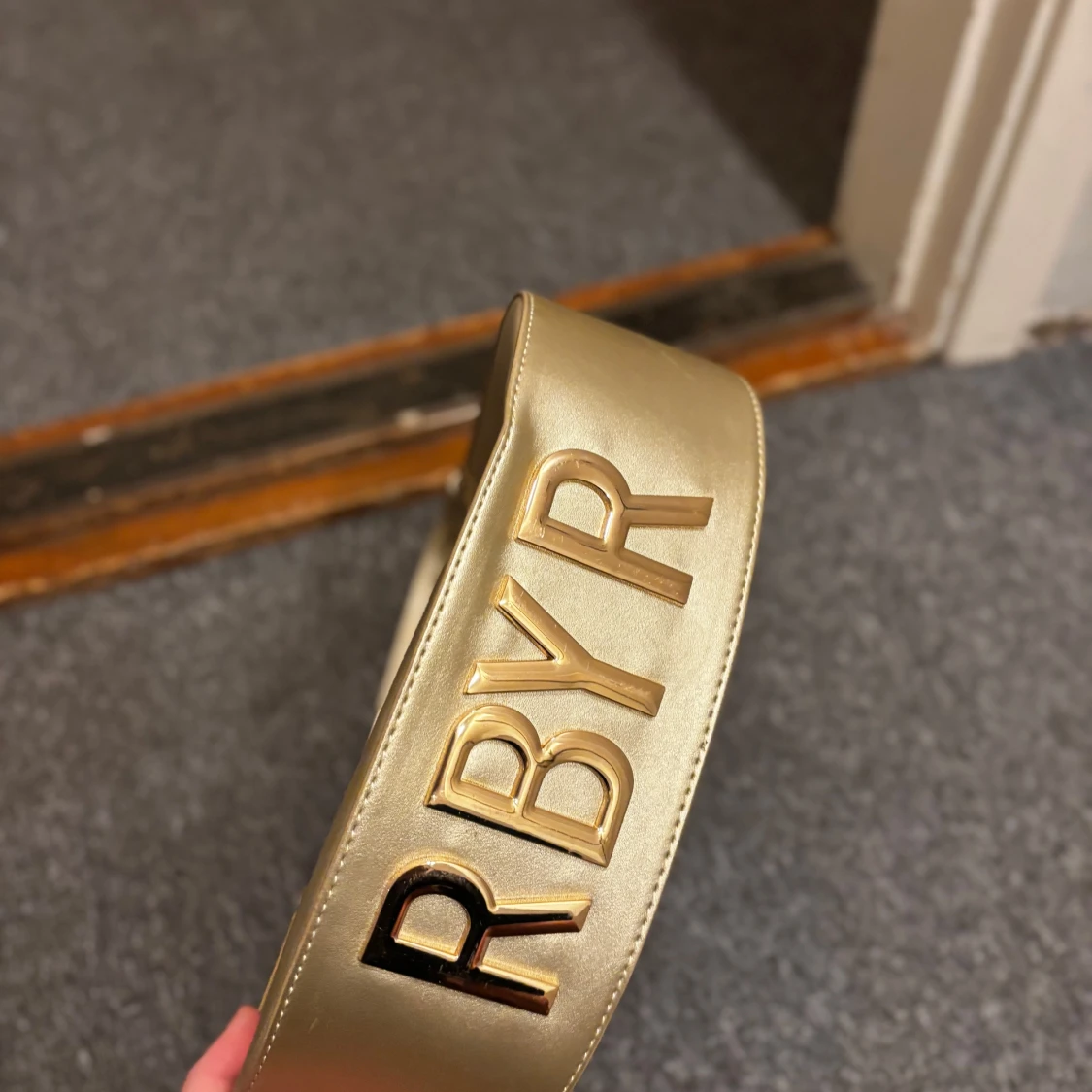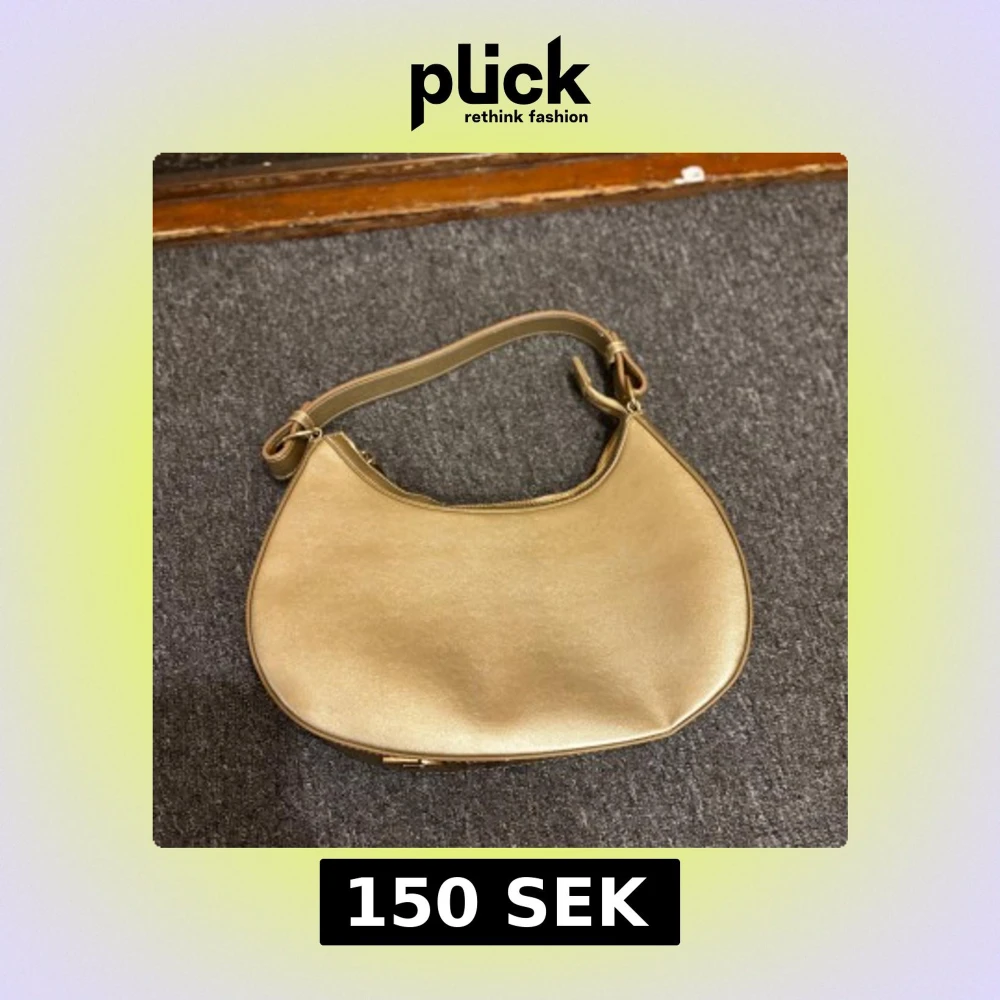Snygg axelväska i guldigt syntetmaterial med stilren bågform och bred axelrem med RBYR-logga i metallic. Väskan har dragkedja upptill och minimalistisk design som sticker ut. Perfekt för dig som vill ha en trendig accessoar med lite extra bling.