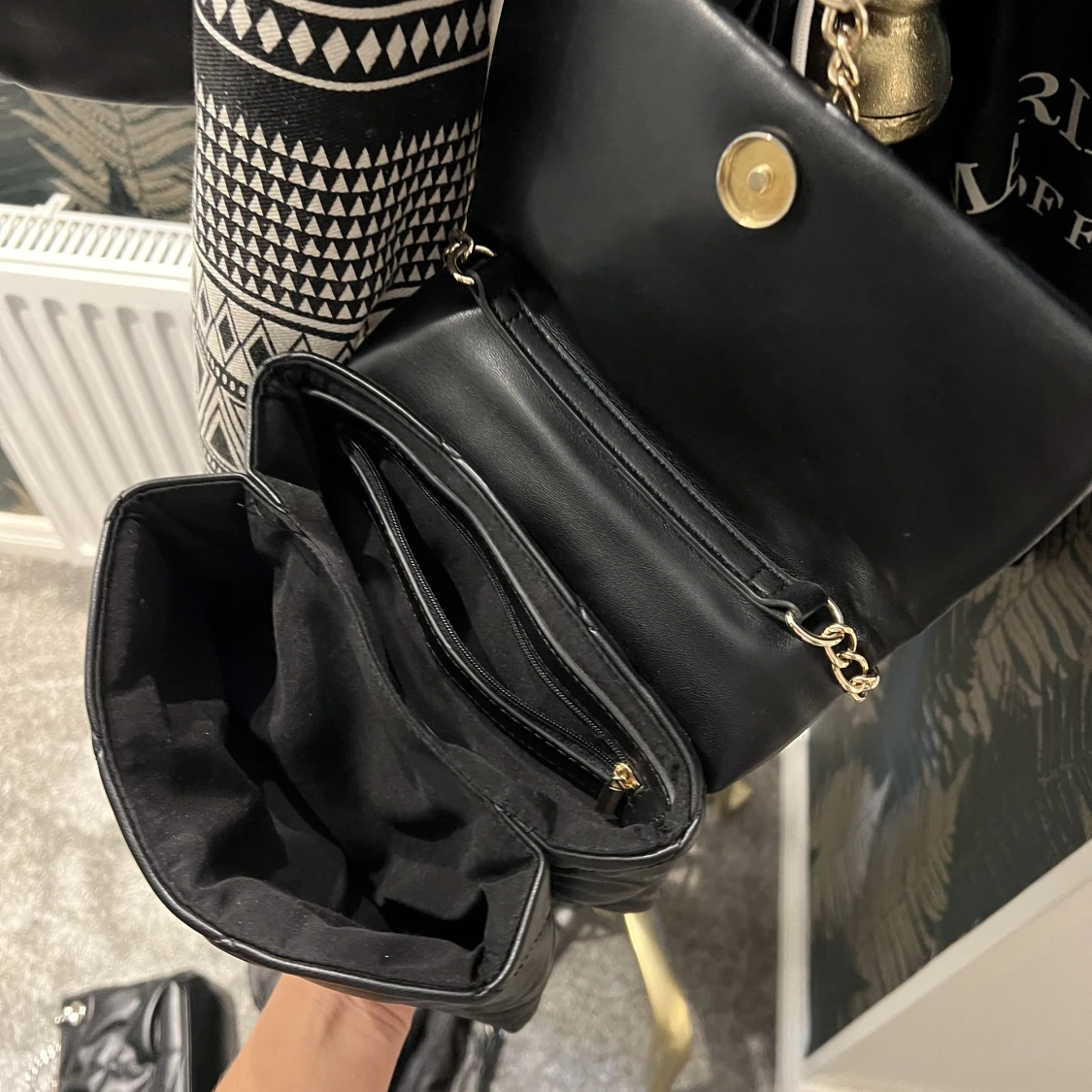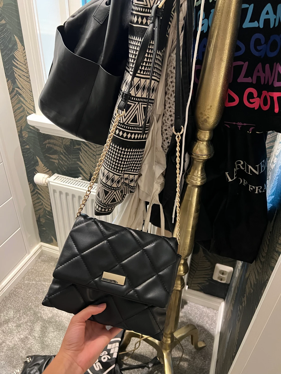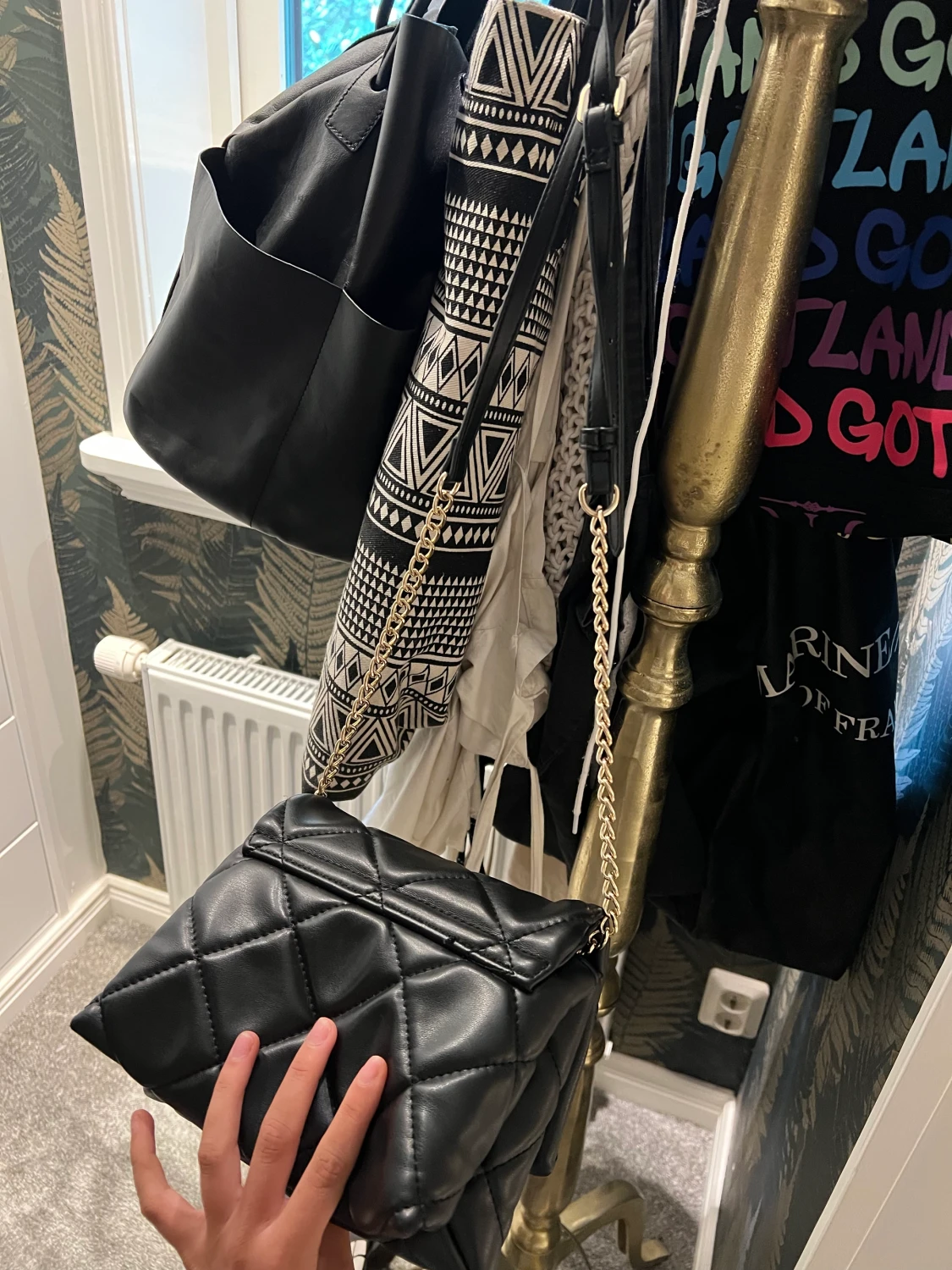 En svart handväksa som har guld ditaljer. Perfekt storlek enligt mig får plats med mycket 💕