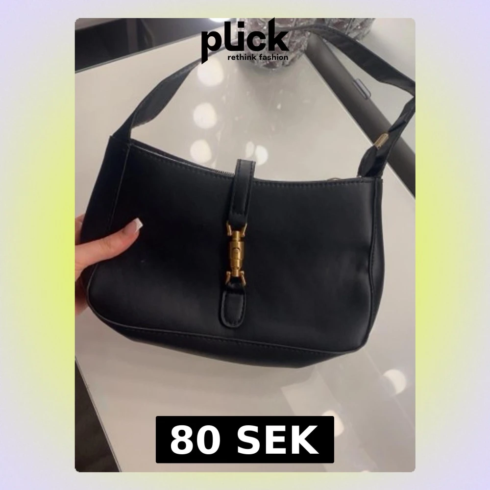 Snygg svart axelväska i skinn med stilren form och guldfärgad metallspänne framtill. Väskan har ett justerbart axelband och dragkedja upptill. Perfekt storlek för det viktigaste och passar till många olika outfits. 🖤