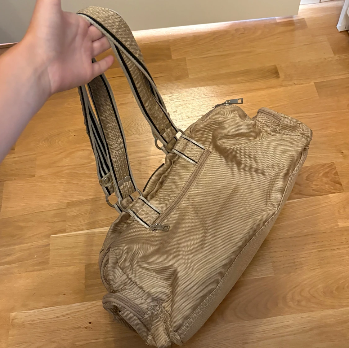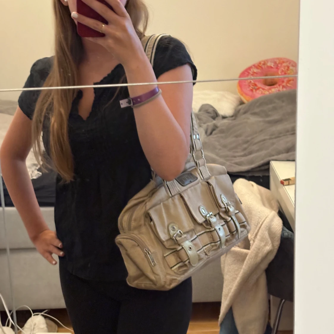 Axelväska som har mycket utrymme med två stora fack och mindre fack i dom. Dessutom finns förvaring utanpå väskan, köpt second hand. Y2K stil.