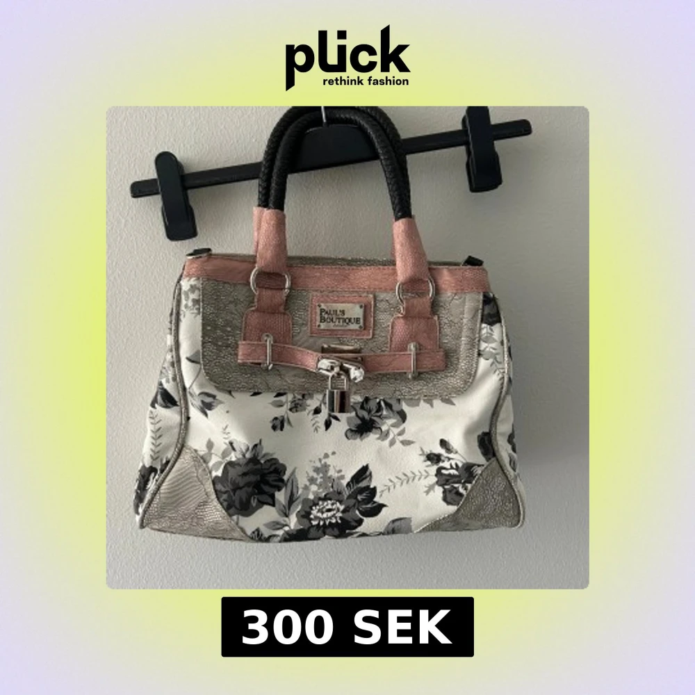 Snygg handväska med blommigt mönster i svart och grått på vit botten, detaljer i ljusrosa och grått skinn. Inte kommit till användning.