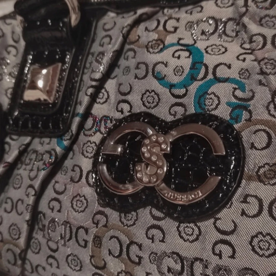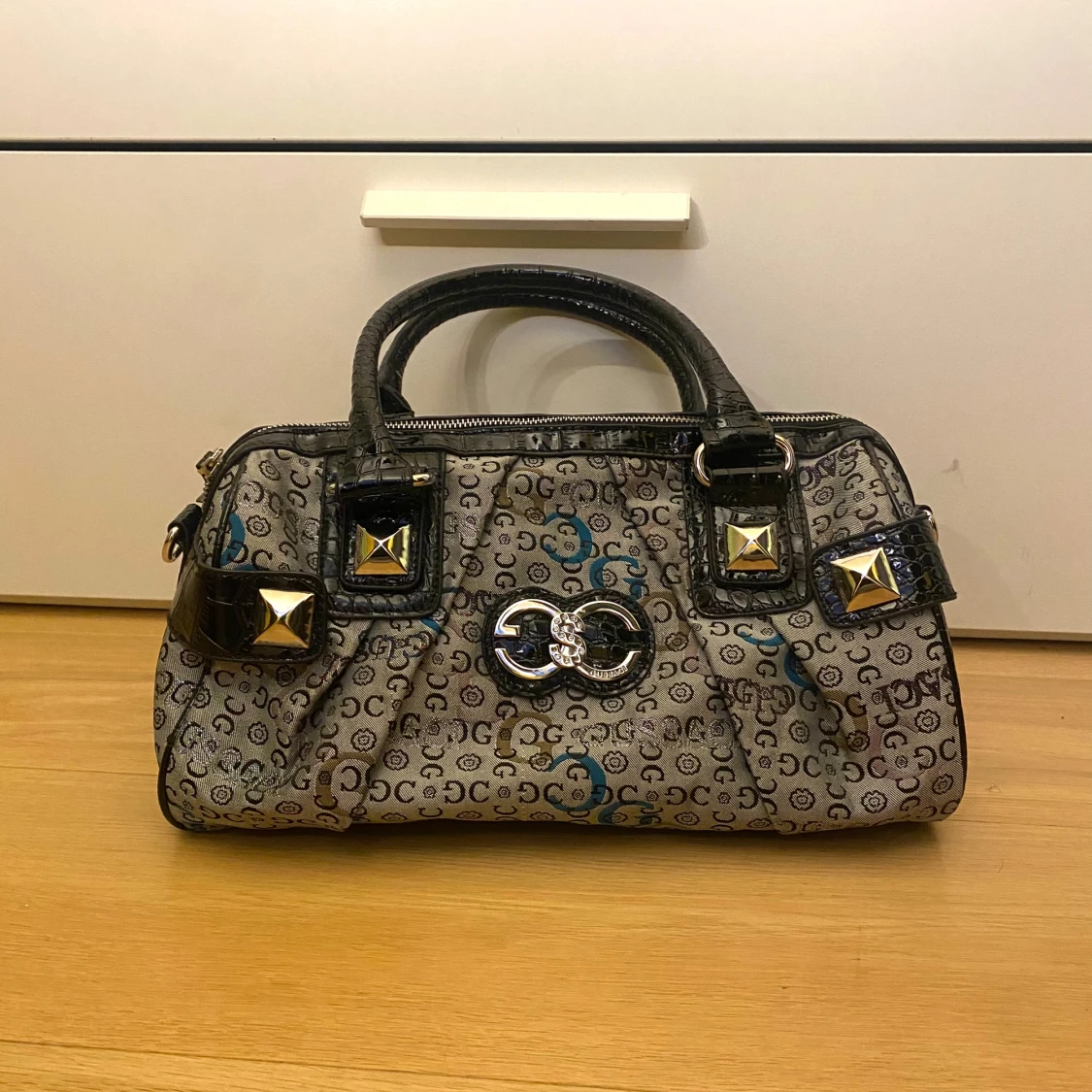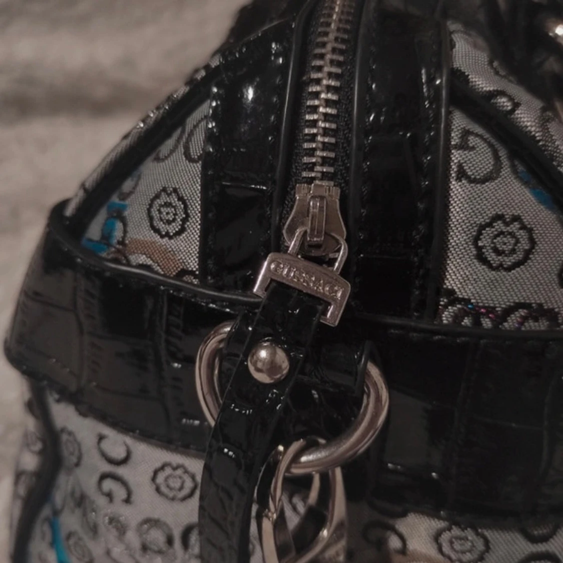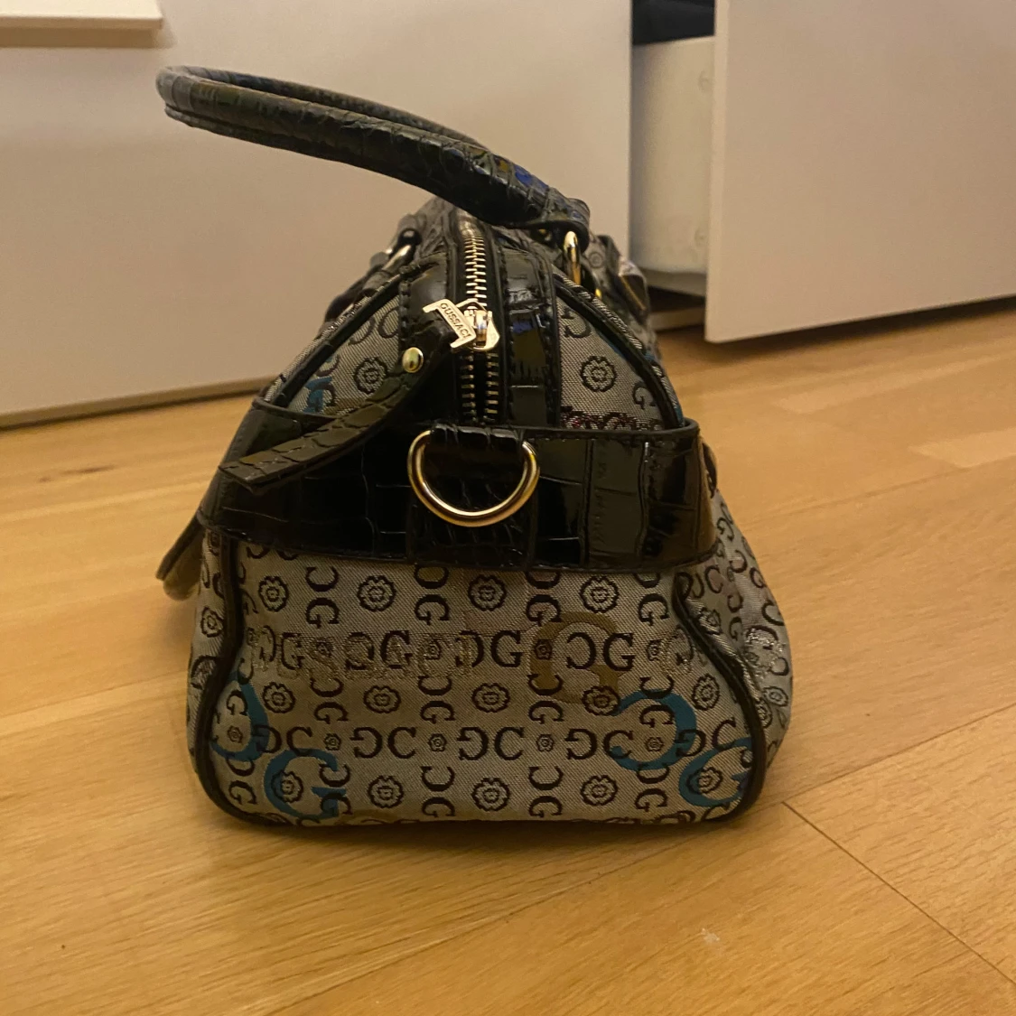 Snygg handväska från Guess med ett unikt mönster i svart och blått. Väskan har dekorativa nitar och en dragkedja upptill.