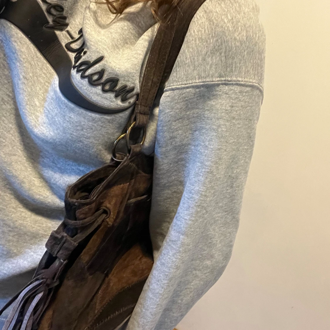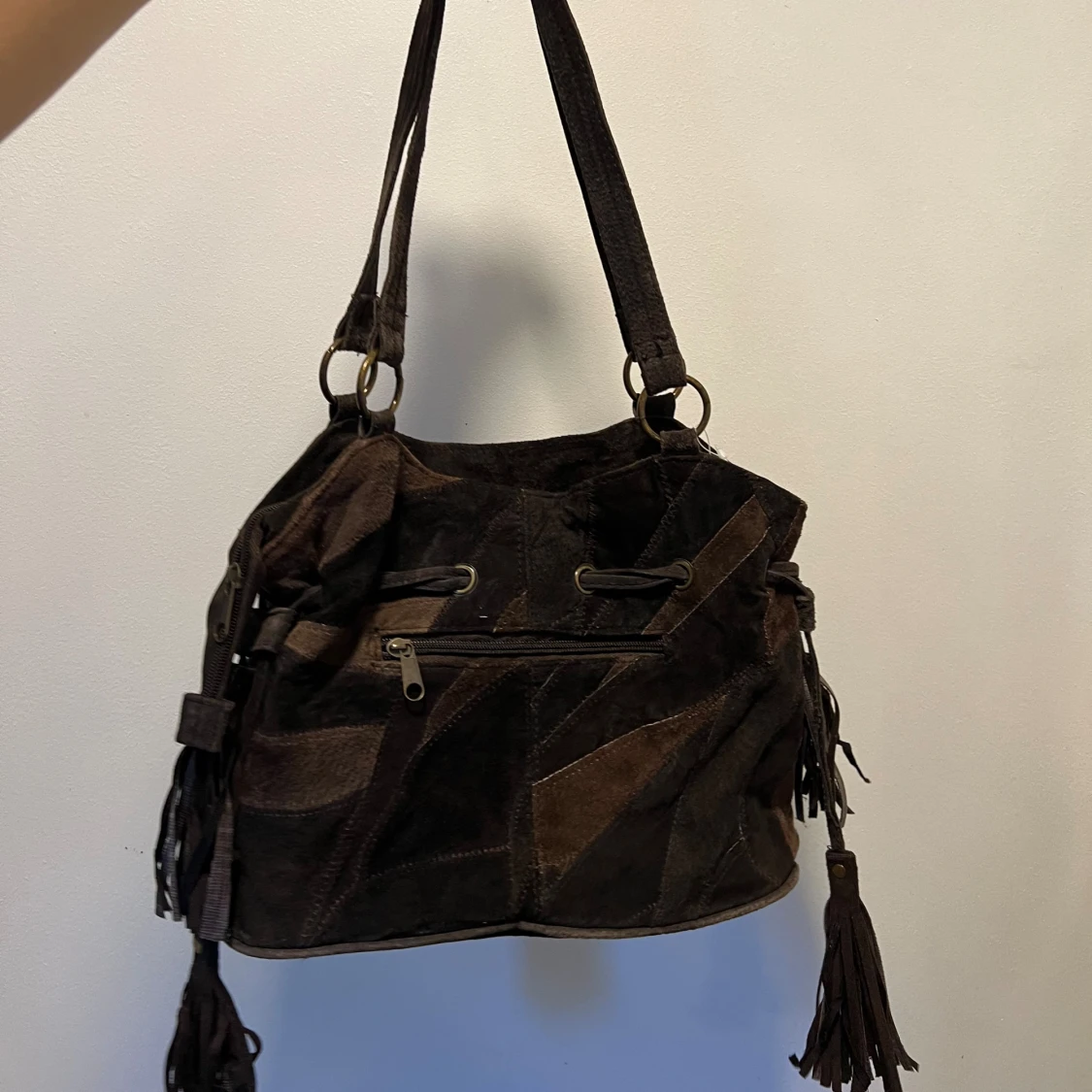 Säljer en brun patchwork axelväska i mjuk mocka med coola fransdetaljer på sidorna. Väskan har snörning upptill, dragkedjeficka på baksidan och rejäla axelband i samma material. Perfekt för dig som gillar en bohemisk och unik stil.