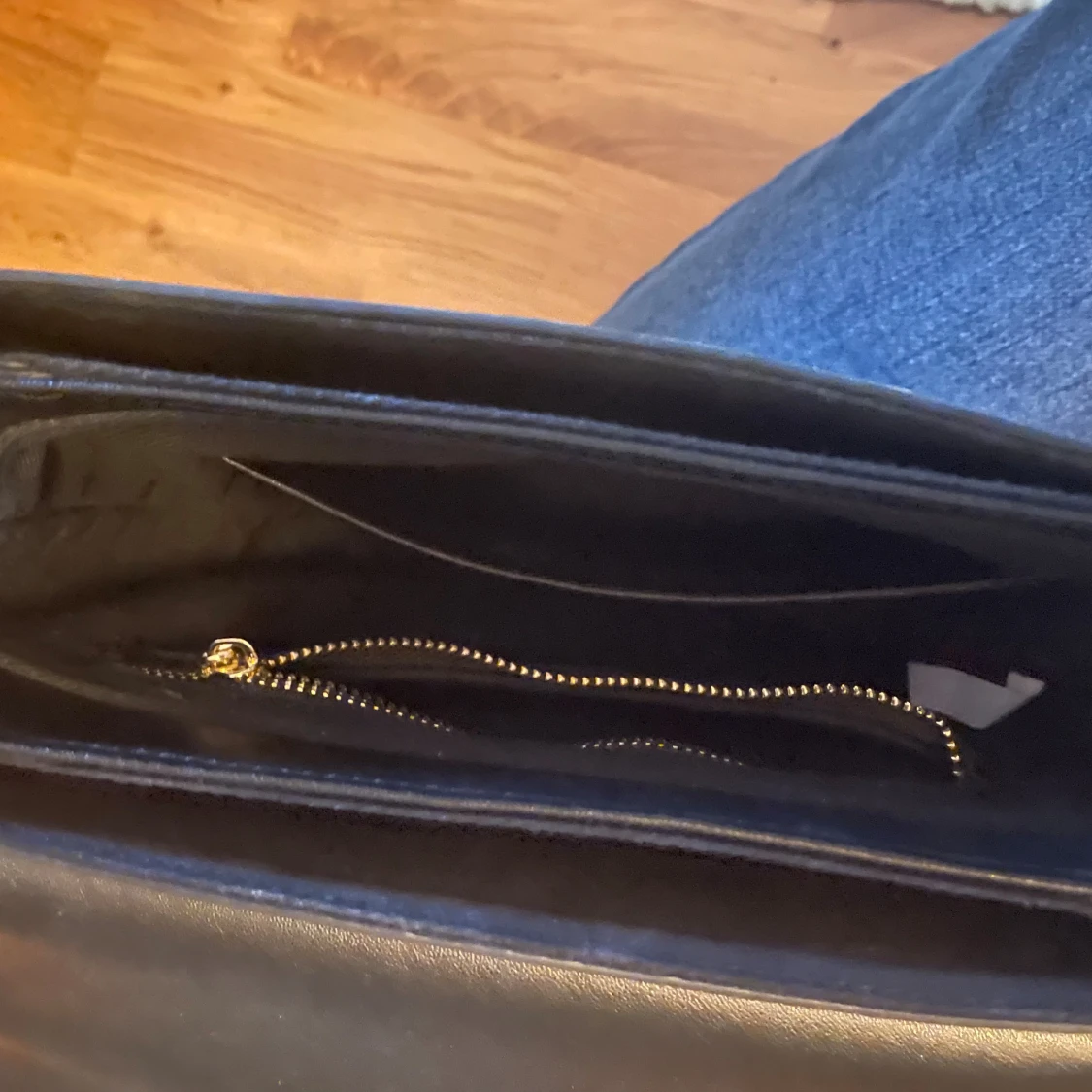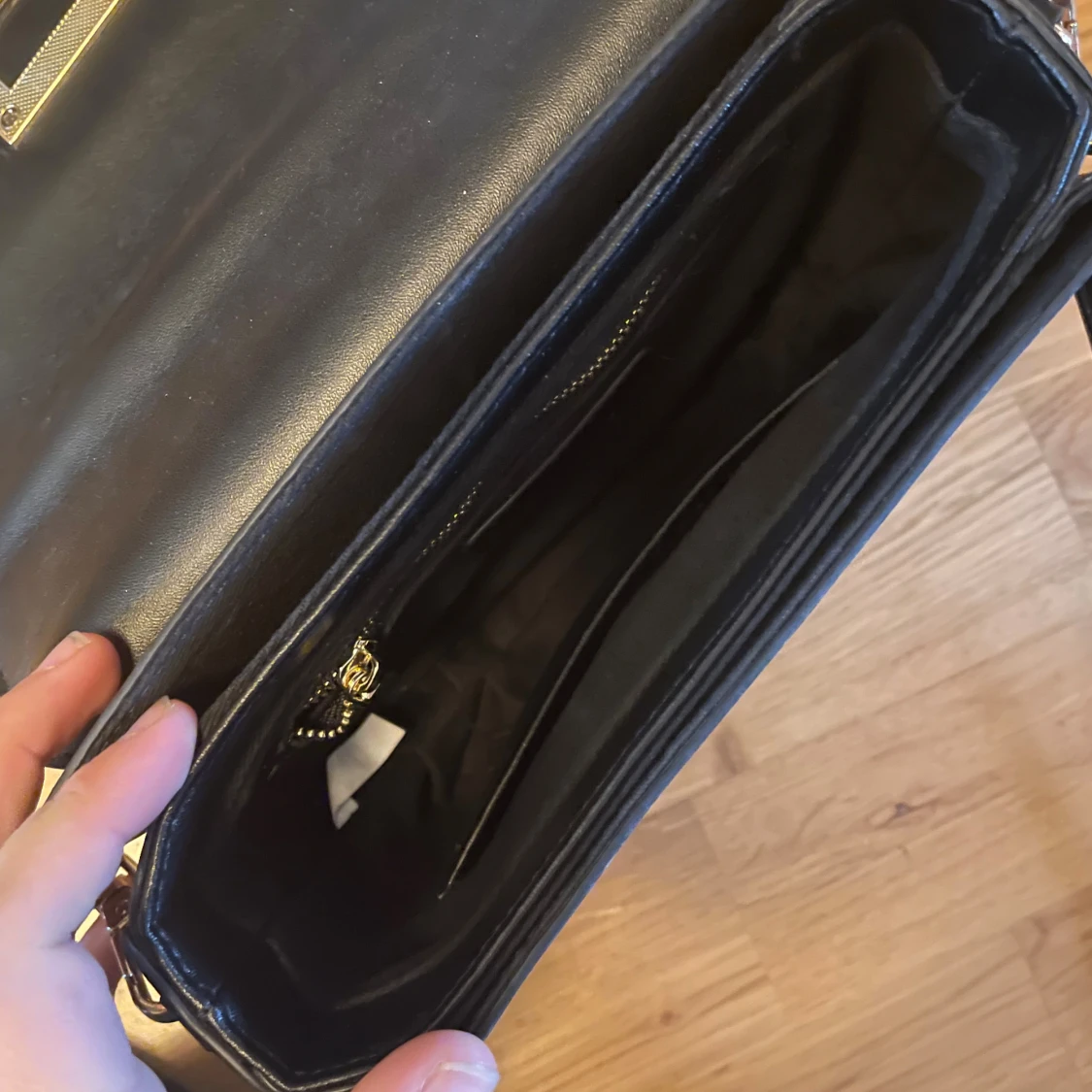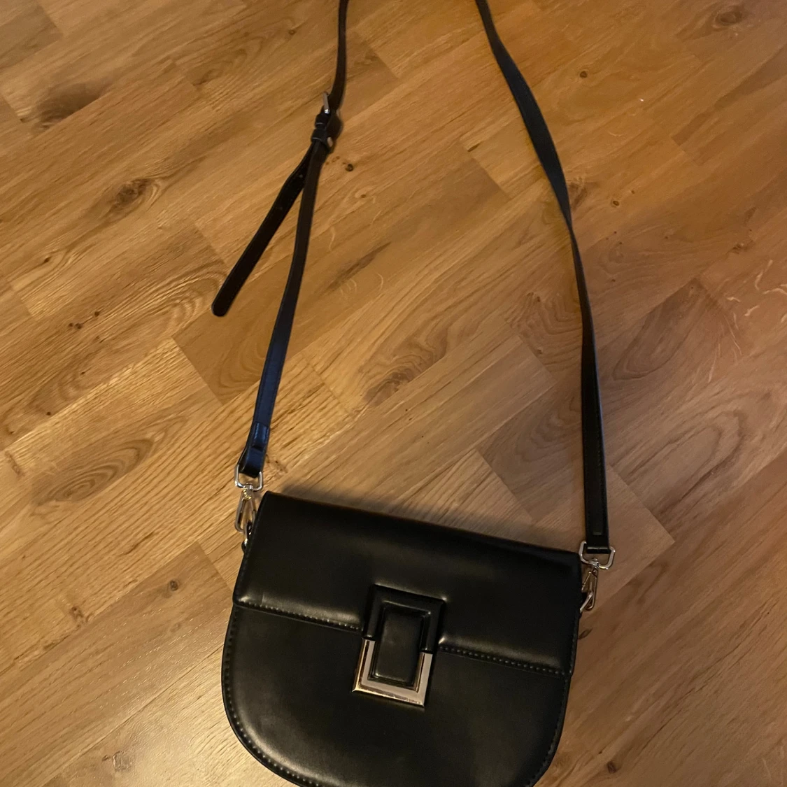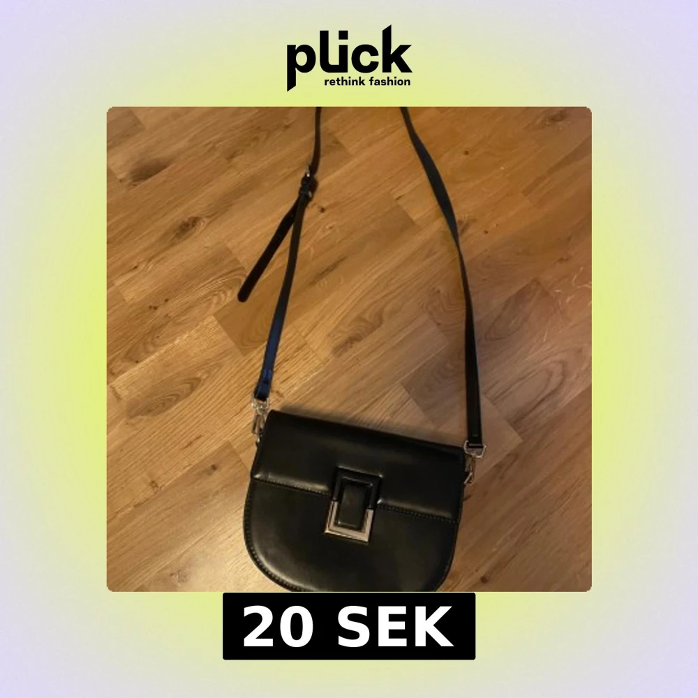 Stilren svart axelväska i skinnimitation med justerbar rem och snyggt metallspänne framtill. Remen går också att ta loss om man vill det. Väskan har flera fack inuti, inklusive ett med dragkedja, perfekt för att hålla ordning på dina grejer. Enkel och klassisk design som passar till många outfits. Bredd: 20cm höjd: 16cm. Inte superkvalitet men funkar att använda ändå. Därför lågt pris