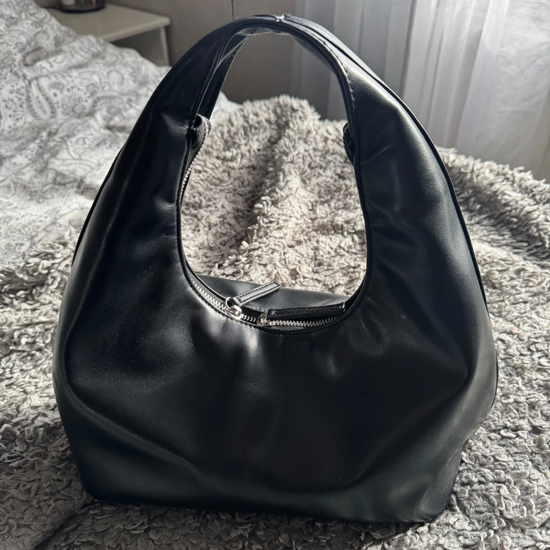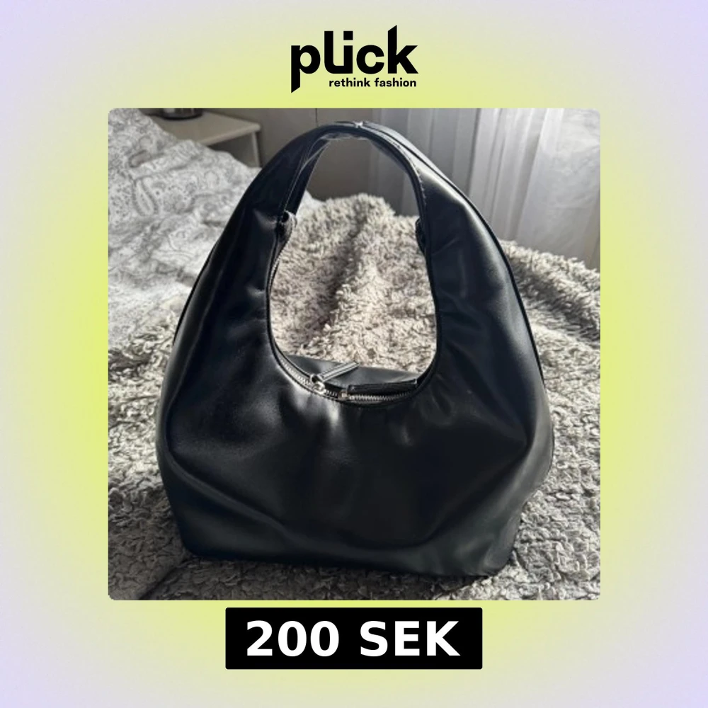 Snygg svart väska med en praktisk dragkedja upptill och en rundad form som ger den ett modernt utseende. Perfekt för att bära dina dagliga nödvändigheter. Väskan är knappt använd så så gott som ny. Nypris 499kr💞