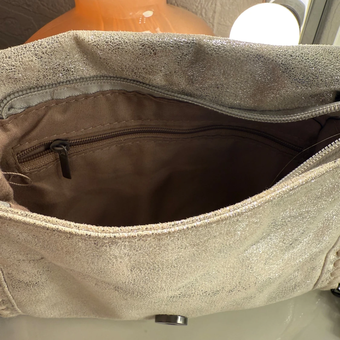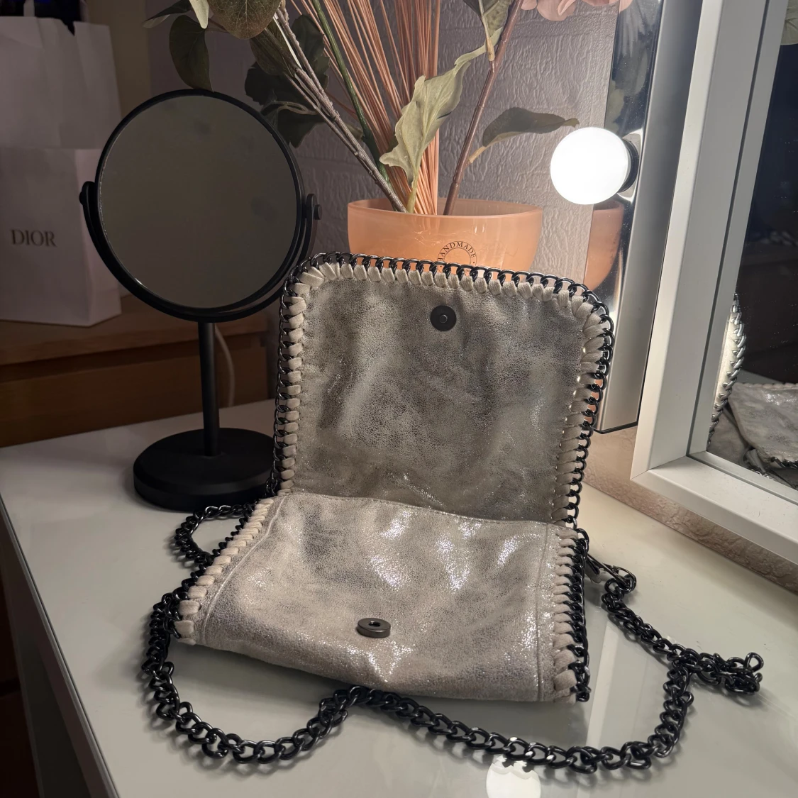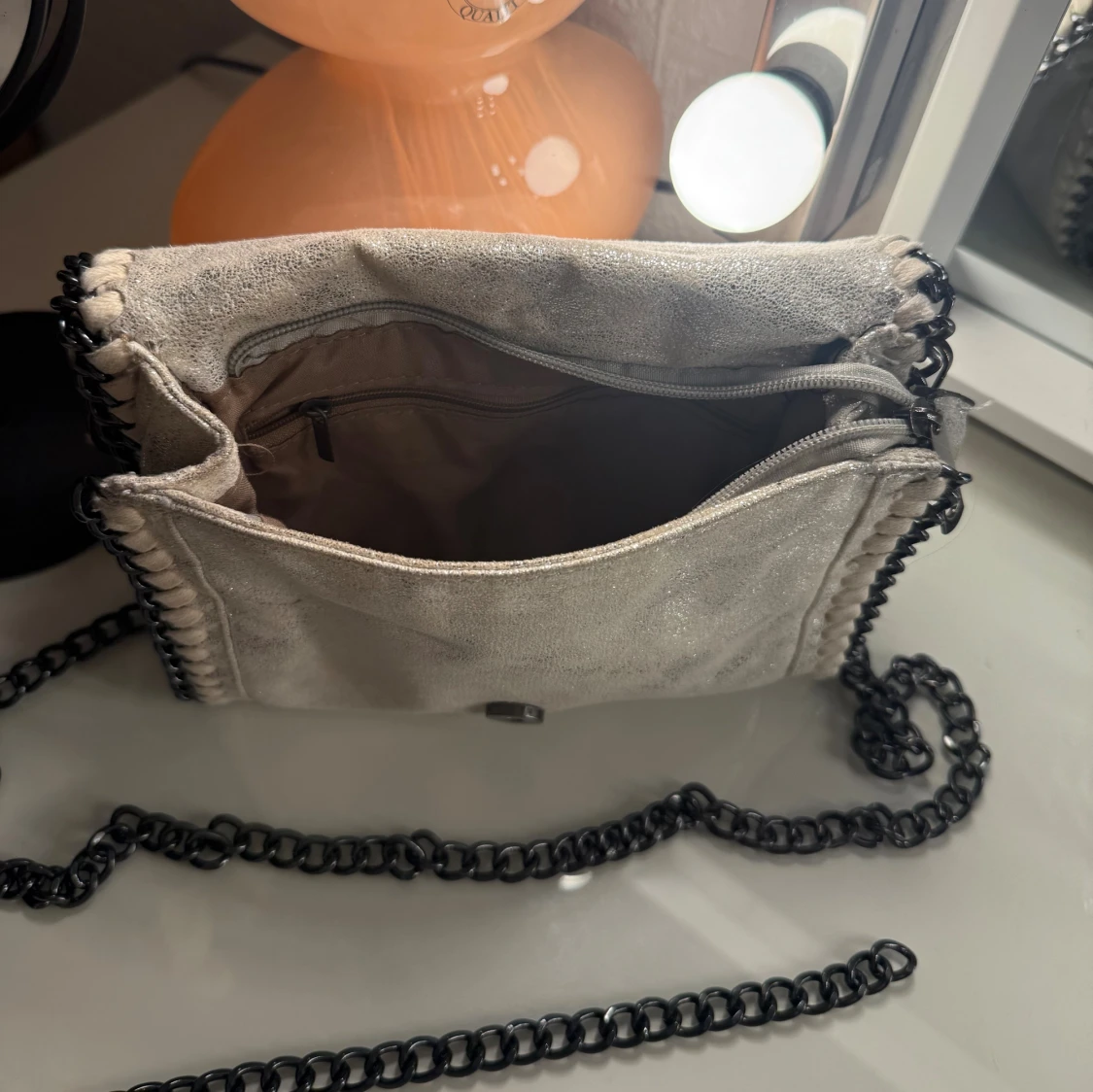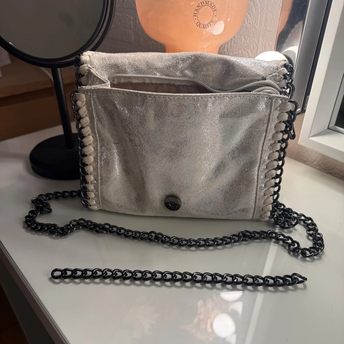 Snygg axelväska med grov svart kedja som axelrem. 🥰Väskan har ett lock med magnetknapp, dekorativa sömmar längs kanterna och ett innerfack med dragkedja. 😍Perfekt för dig som vill sticka ut med en cool accessoar. Har även en extra kedja som man ser på bild 3, om man vill göra den ännu längre!❤️