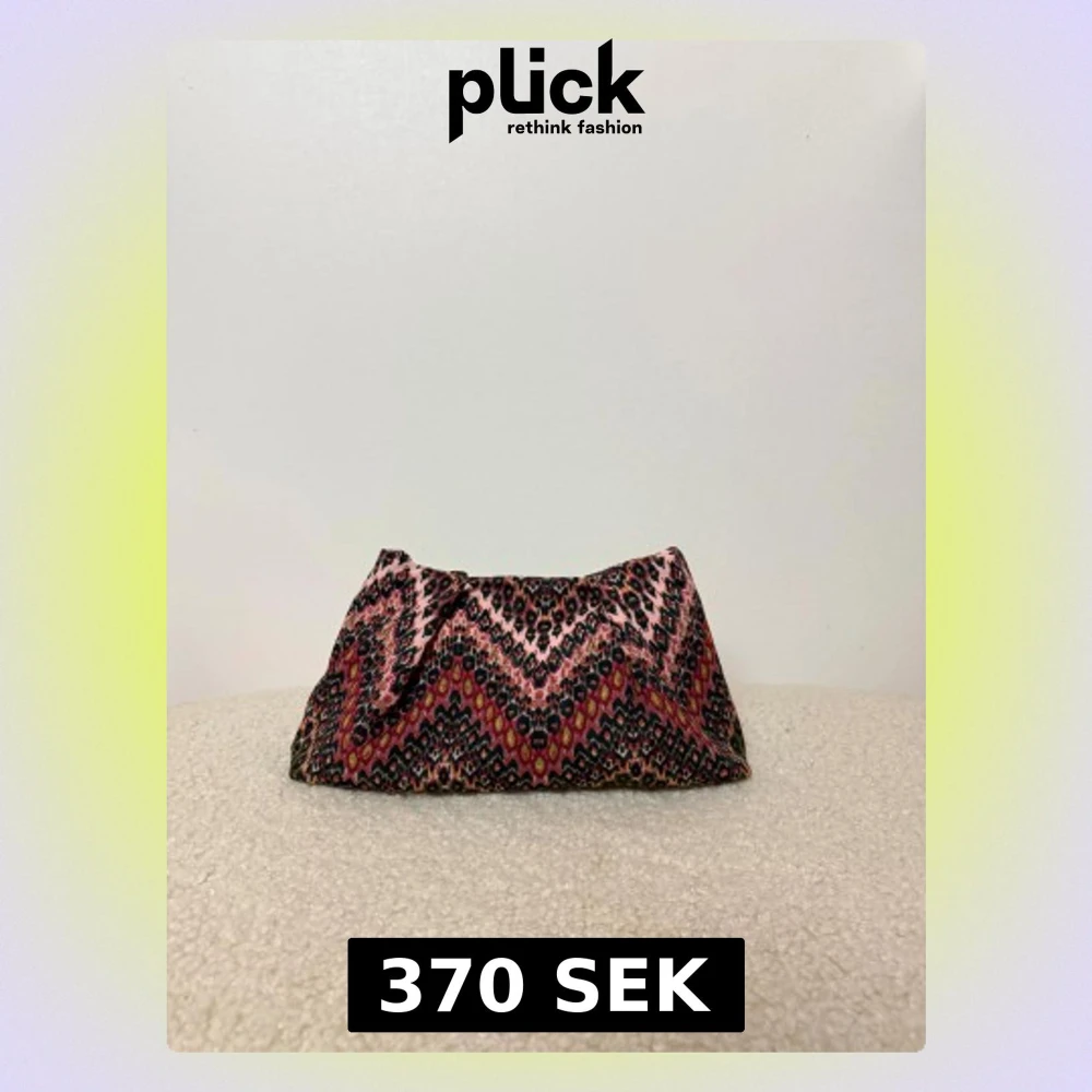 Handgjord clutch-väska med zigzag-mönster i rosa, svart och röda toner. Väskan har en mjuk form och är tillverkad i ett tygmaterial Liknar Becksöndergard väskorna, 26x16 cm🤍