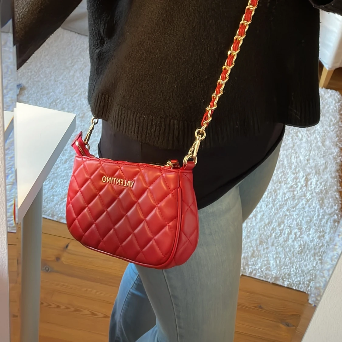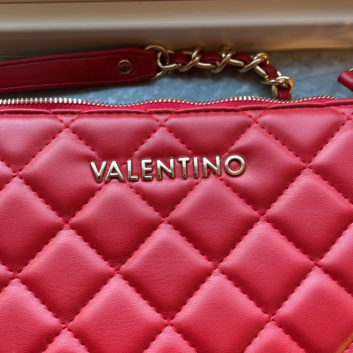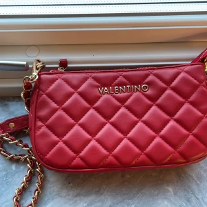 Snygg röd axelväska från Valentino bags med quiltat mönster och guldfärgade detaljer. Väskan har en kedjerem och dragkedja upptill. Perfekt för att ge en färgklick till din outfit. Aldrig använd, nypris 1249 ( med tillhörande mindre väska )