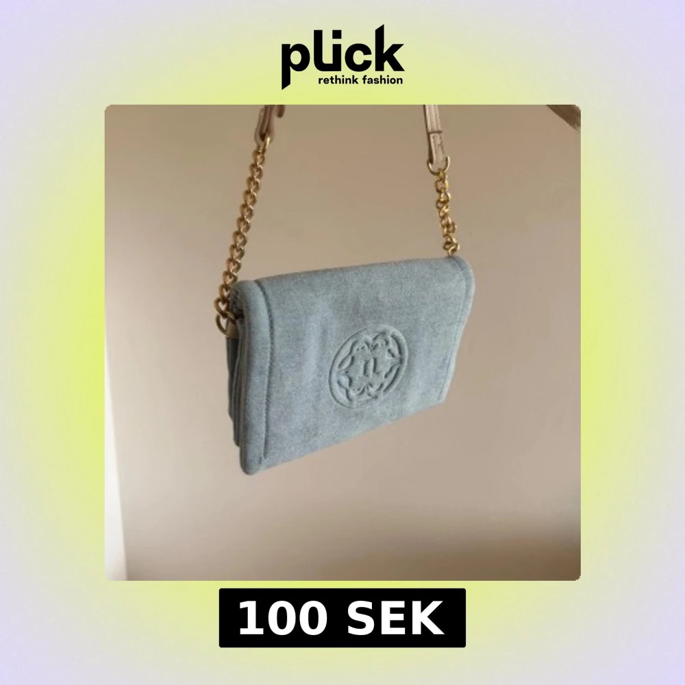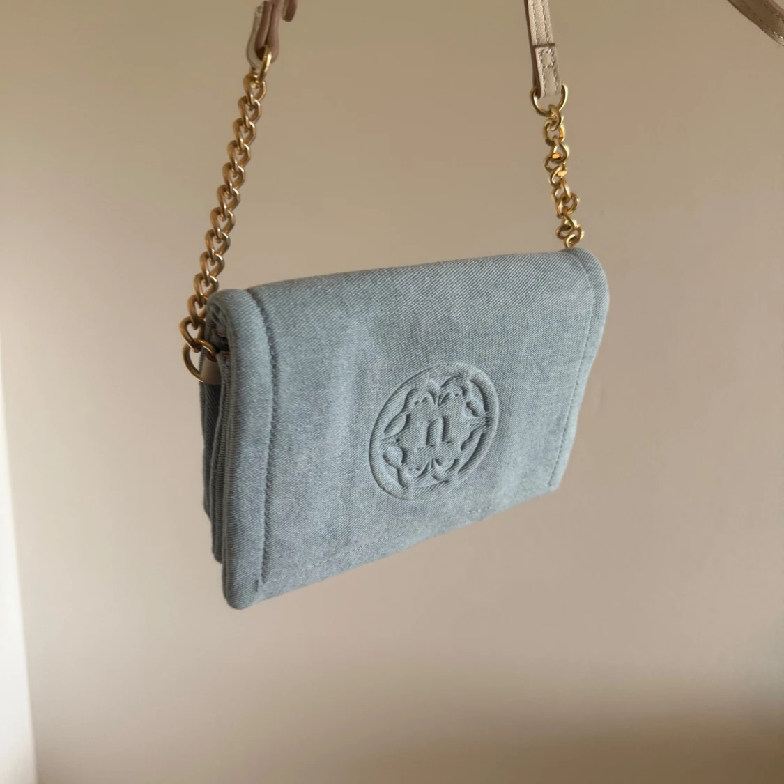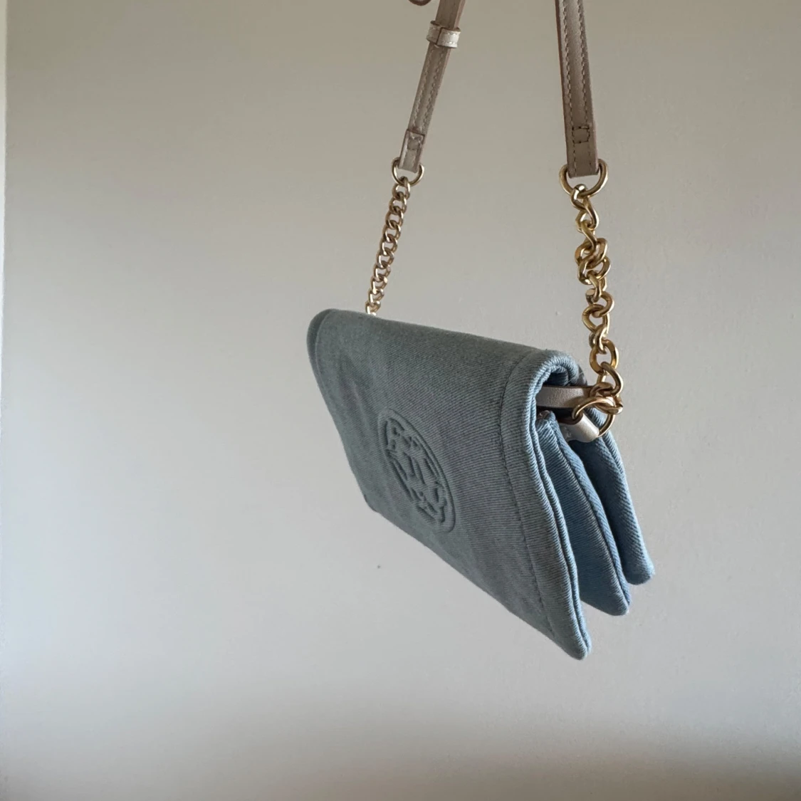 Säljer en ljusblå axelväska med broderad logga på framsidan. Väskan har en guldfärgad kedja och justerbart axelband i beige. Köpt i USA men aldrig använd✨