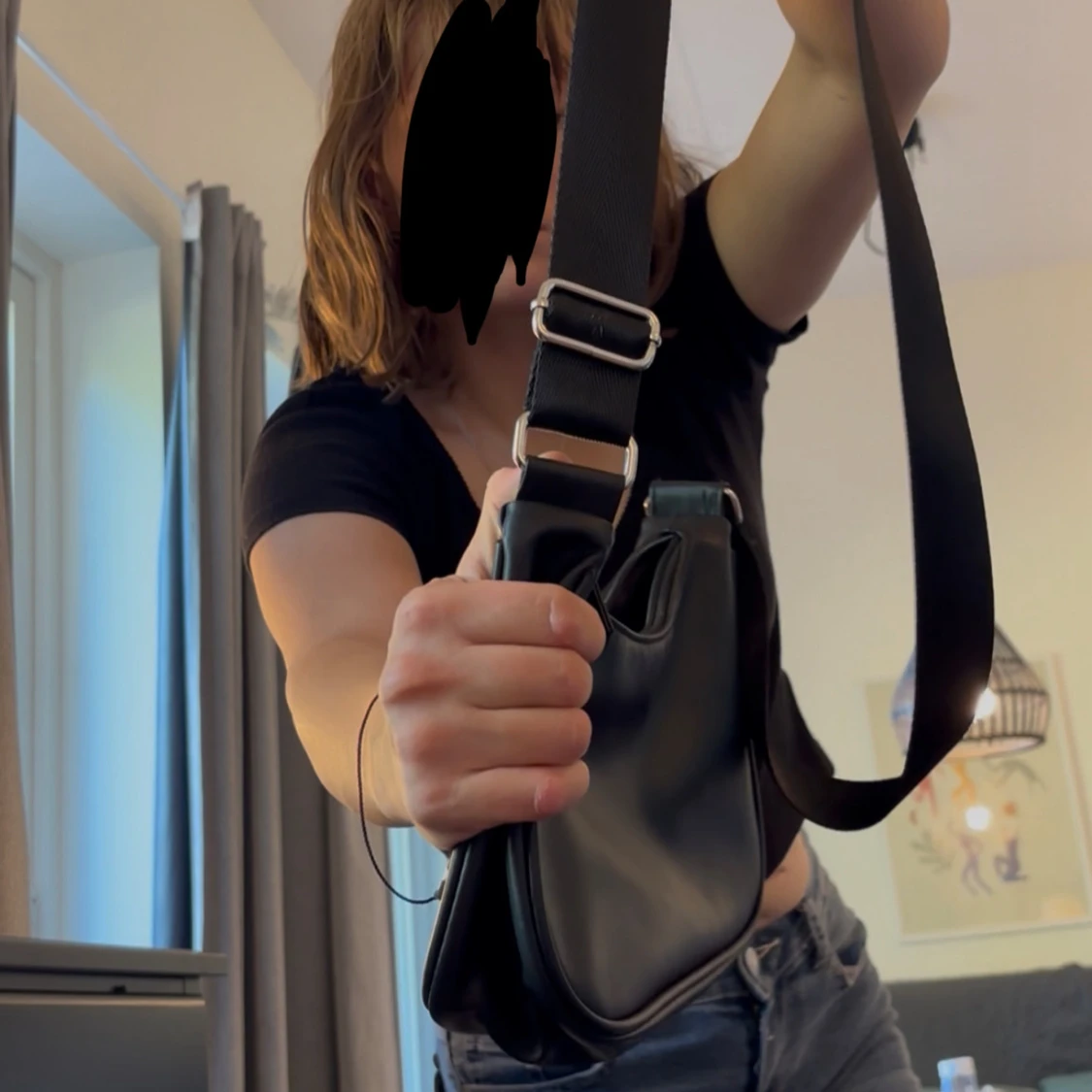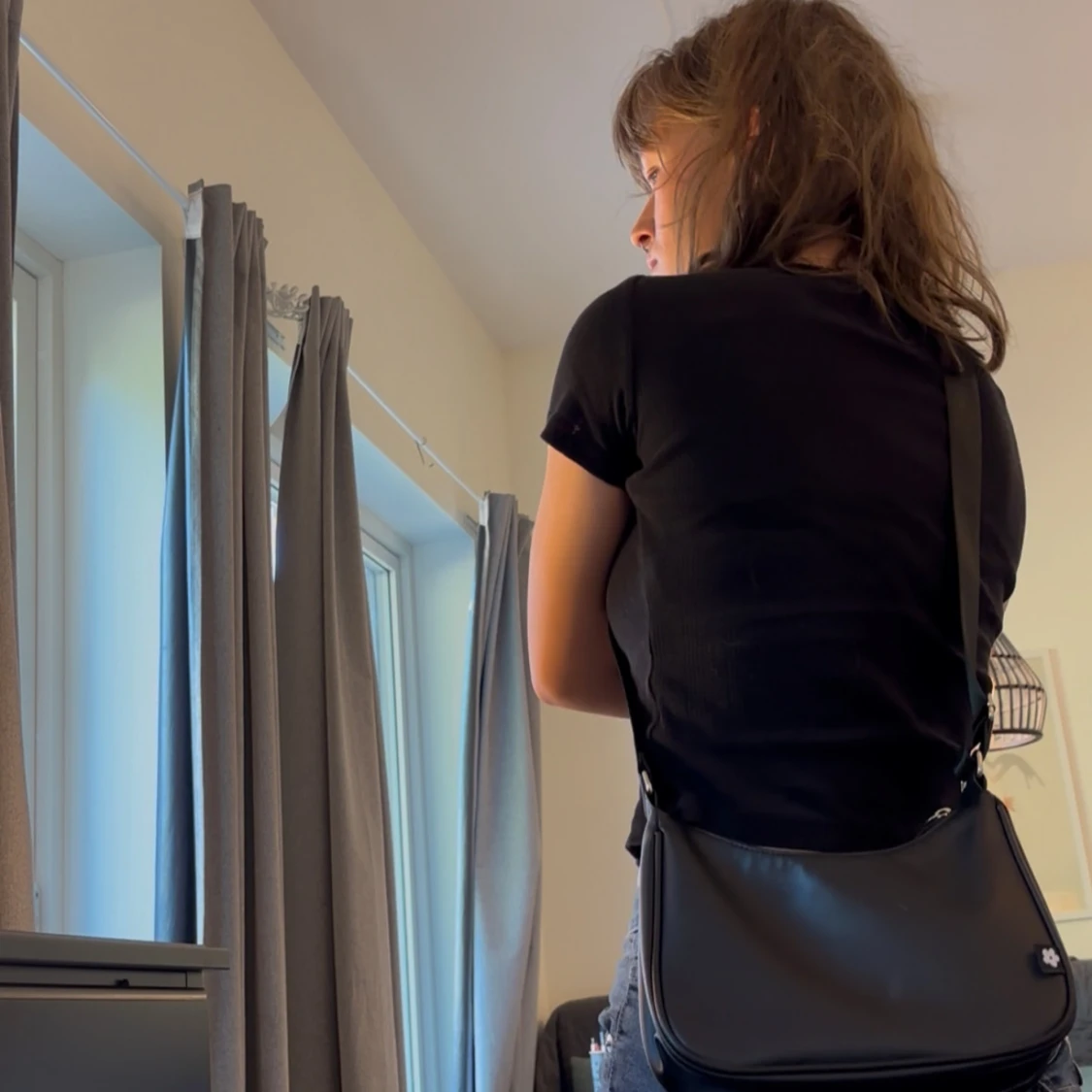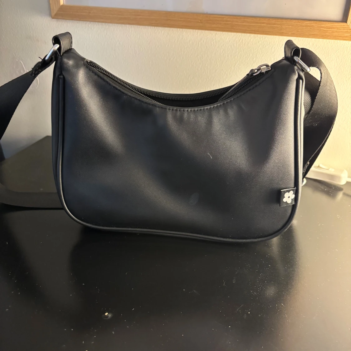 Snygg svart axelväska med stilren design och justerbart axelband. Väskan har en mjuk, slät yta i skinnimitation och en liten blomdetalj framtill. Perfekt storlek för mobil, plånbok och andra essentials. Har en fläck på ena sidan som inte stör något vid användning.