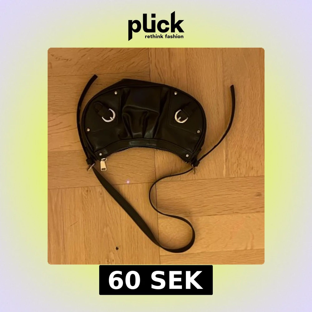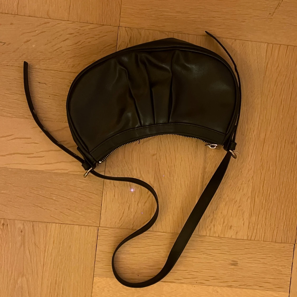 Cool svart axelväska i skinn med unik halvmåneform, silverfärgade metalldetaljer och justerbar rem. Väskan har dragkedja och snygga spännen framtill som ger en edgy vibe. Perfekt för dig som vill sticka ut med en stilren men ändå annorlunda accessoar.