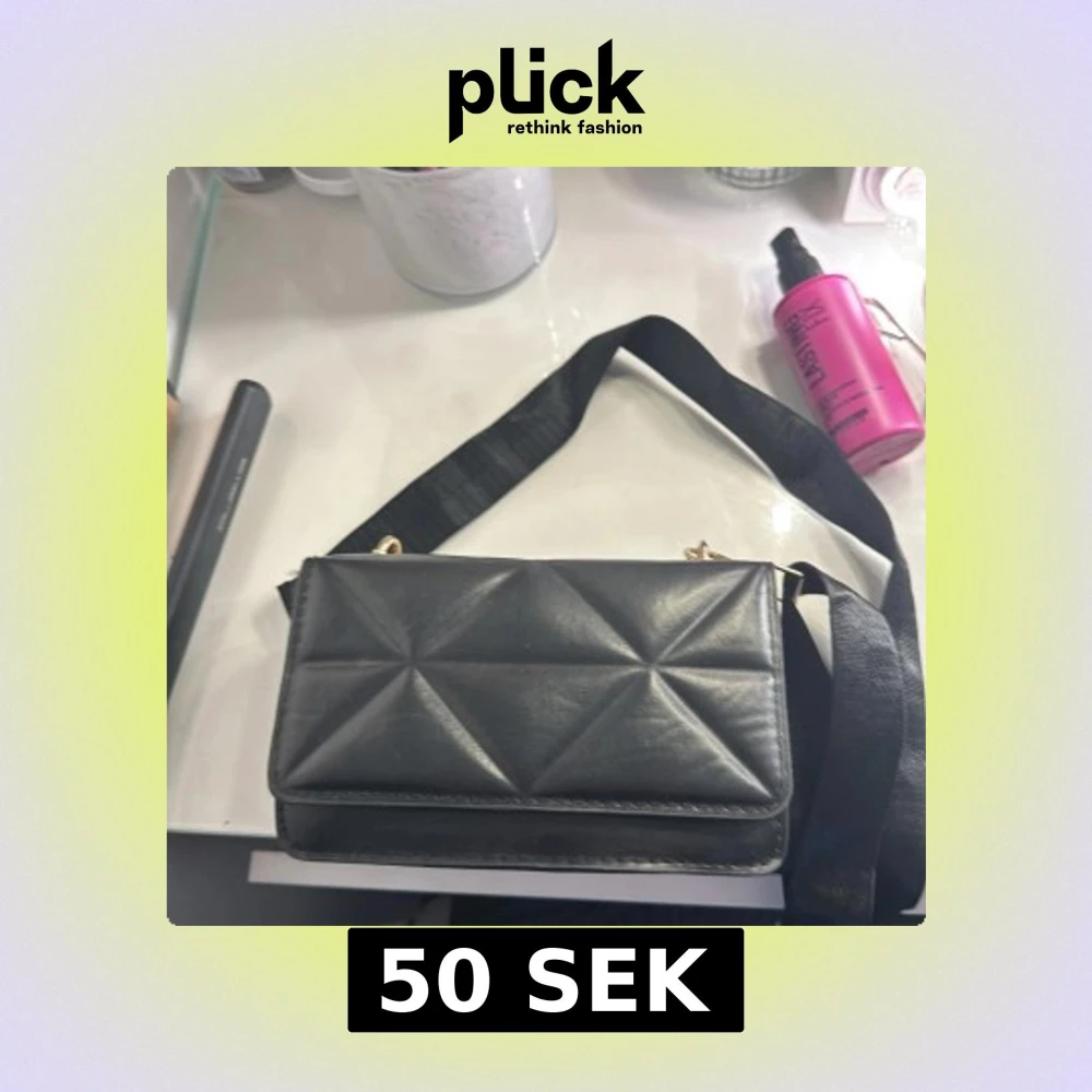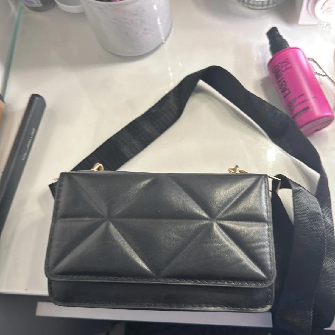 Snygg svart axelväska med quiltad framsida i geometriskt mönster. Väskan har en bred, justerbar rem med guldfärgade detaljer och spänne. Perfekt storlek för det viktigaste och ger en cool vibe till din outfit.