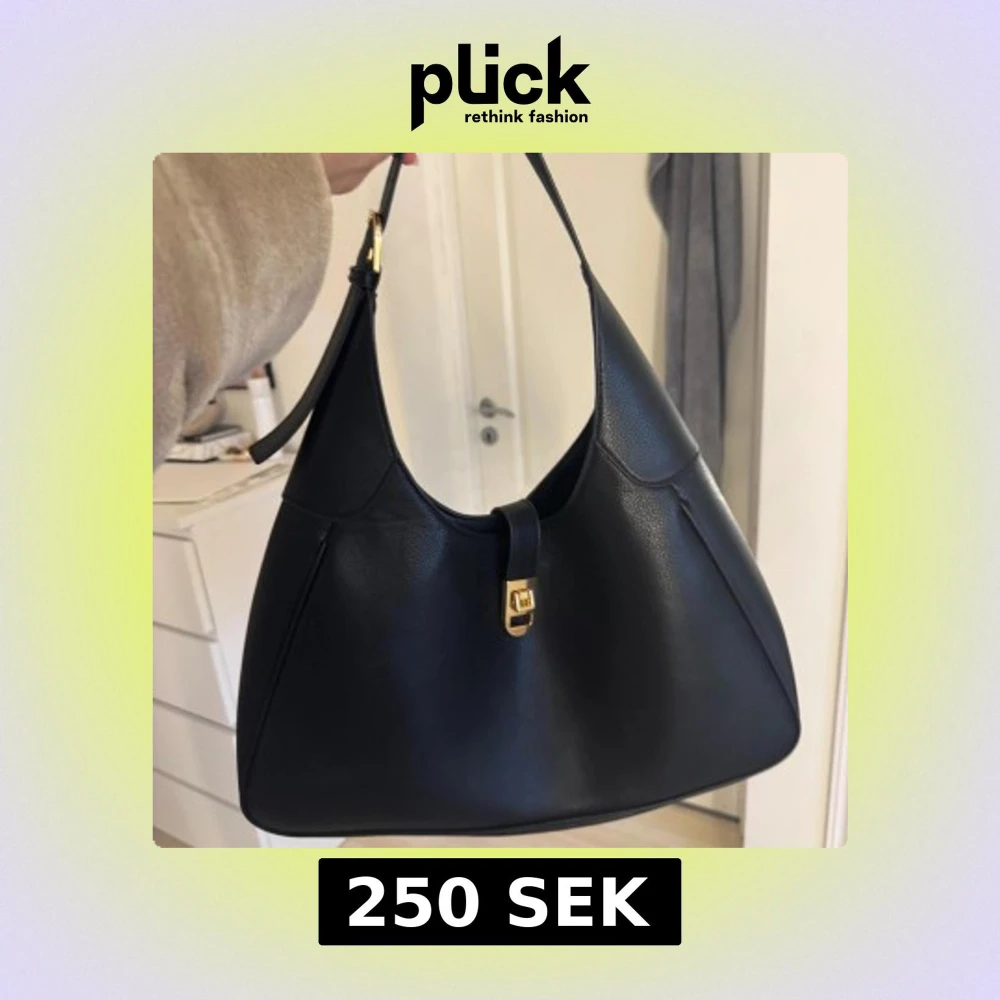 Snygg svart axelväska i skinn med stilren design och guldfärgat spänne framtill. Väskan har en klassisk form och ett brett axelband som gör den bekväm att bära. Perfekt för att lyfta vilken outfit som helst.