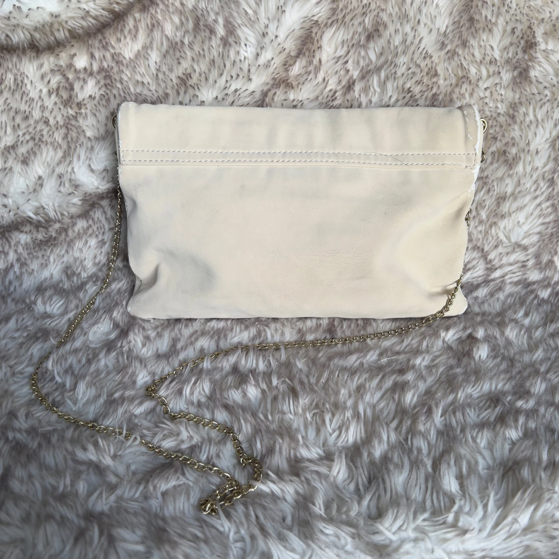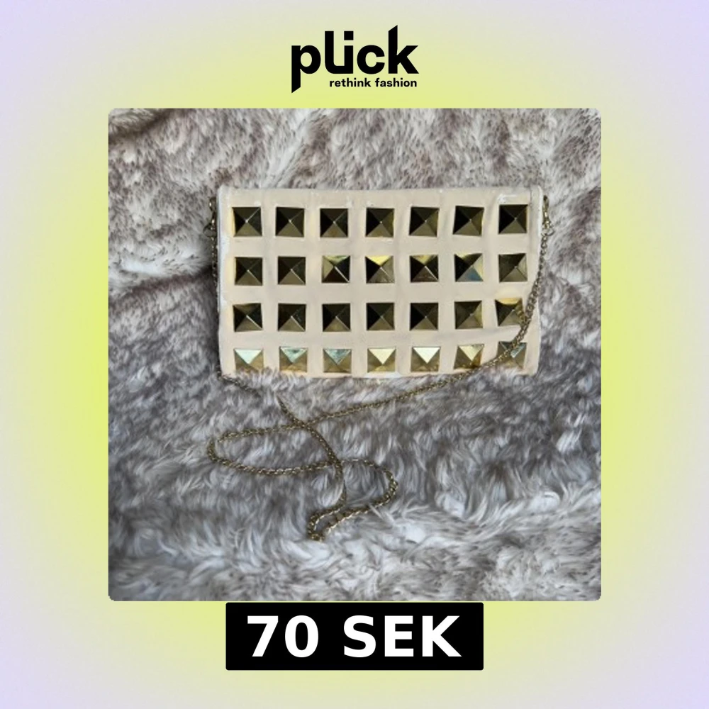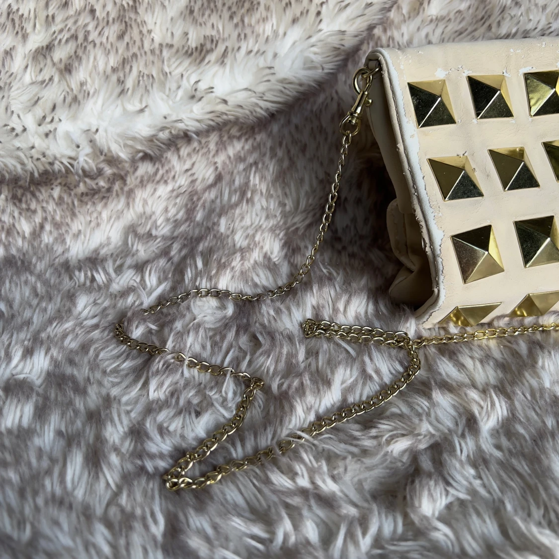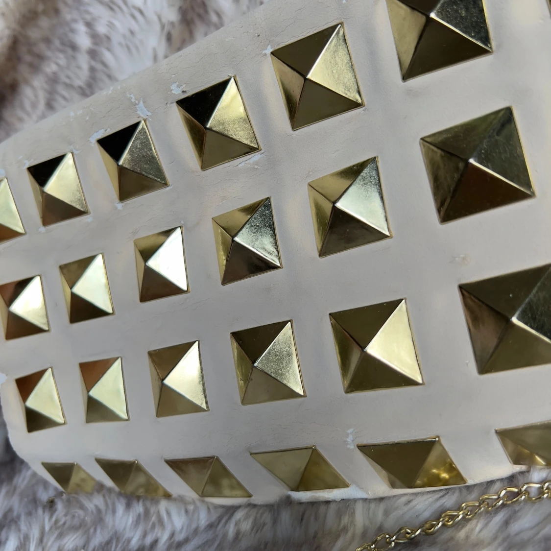 Kuvertväska i beige mocka med stora fyrkantiga guldnitar på framsidan och en tunn guldfärgad kedja som axelrem. Väskan har en stilren och edgy look, perfekt för att lyfta din outfit. Ingen synlig logga eller märke. Fodret har väldigt mycket sminkfläckar.