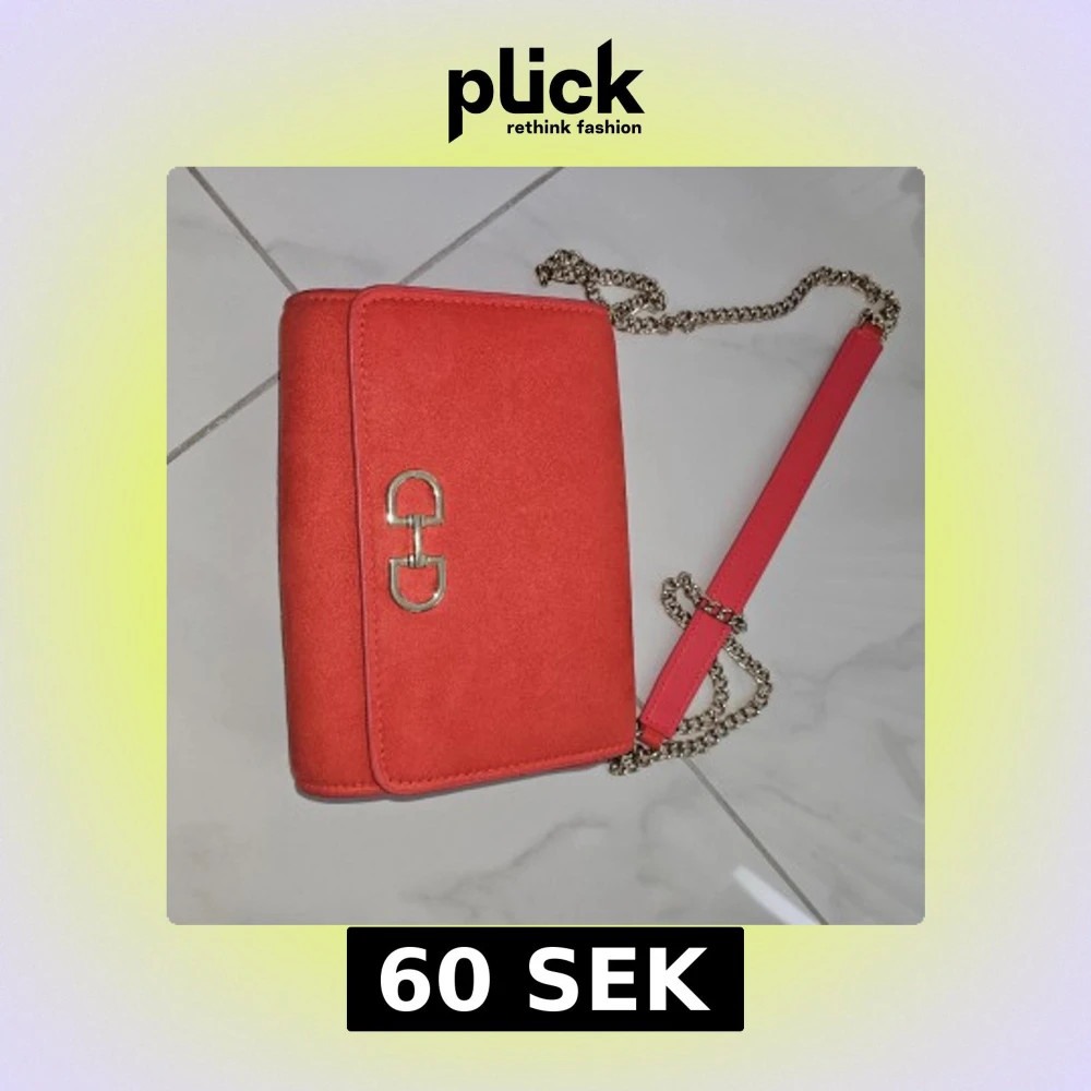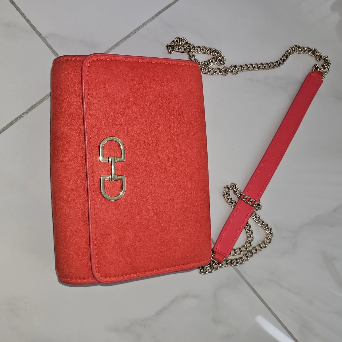 Snygg röd axelväska med guldfärgad kedja och metallspänne framtill. Väskan har en stilren, rektangulär form och är gjord i mocka med detaljer i skinn. Perfekt för att lyfta din outfit med en pop av färg.