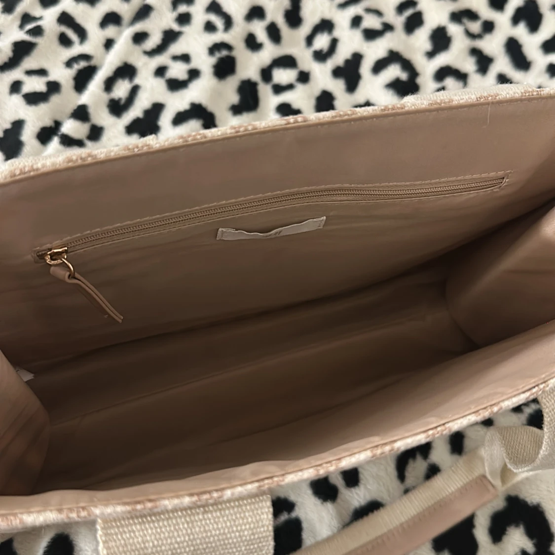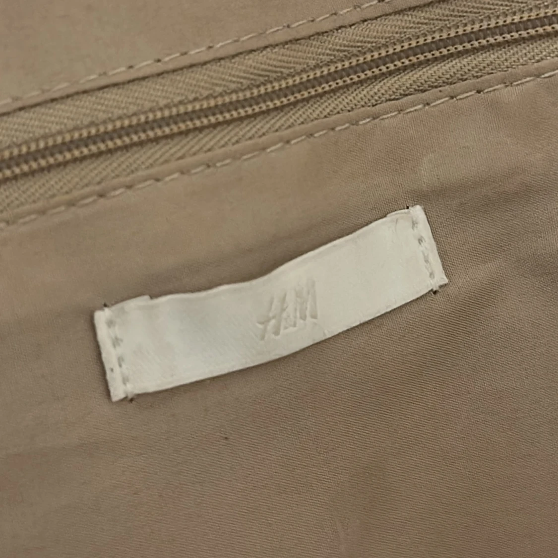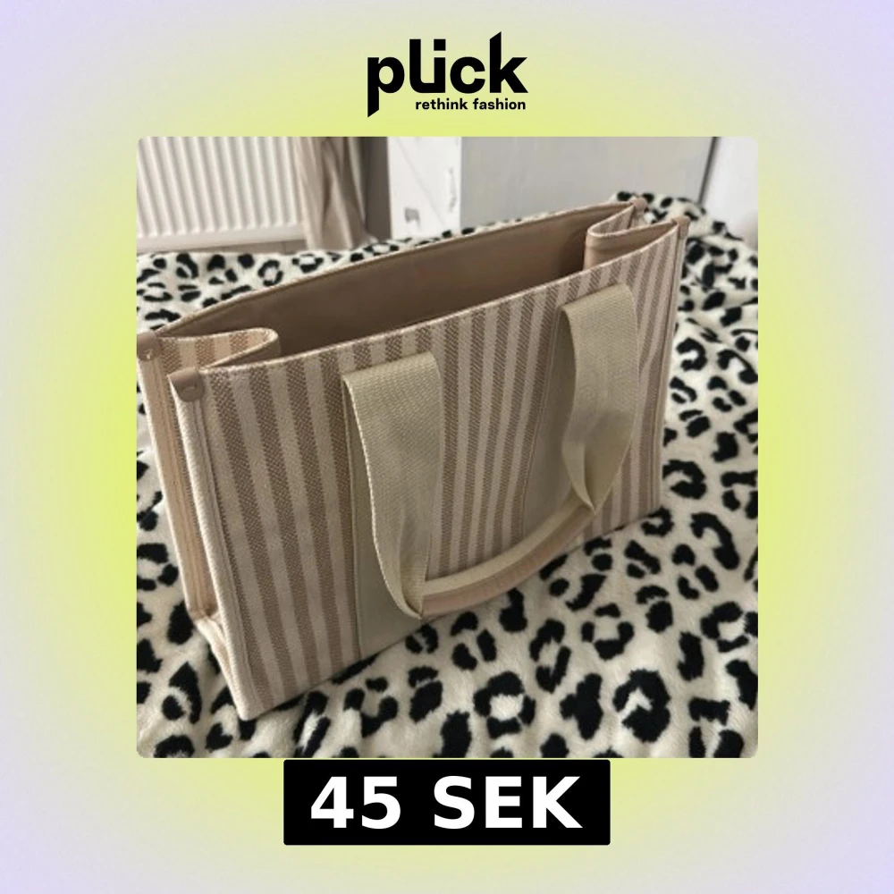 Snygg handväska från H&M i beige och ljusbrun med vertikala ränder. Väskan har rejäla handtag och ett rymligt fack med dragkedja på insidan. Tillverkad i bomullsmaterial med stilren, boxig form som gör den perfekt för att bära med sig allt man behöver.