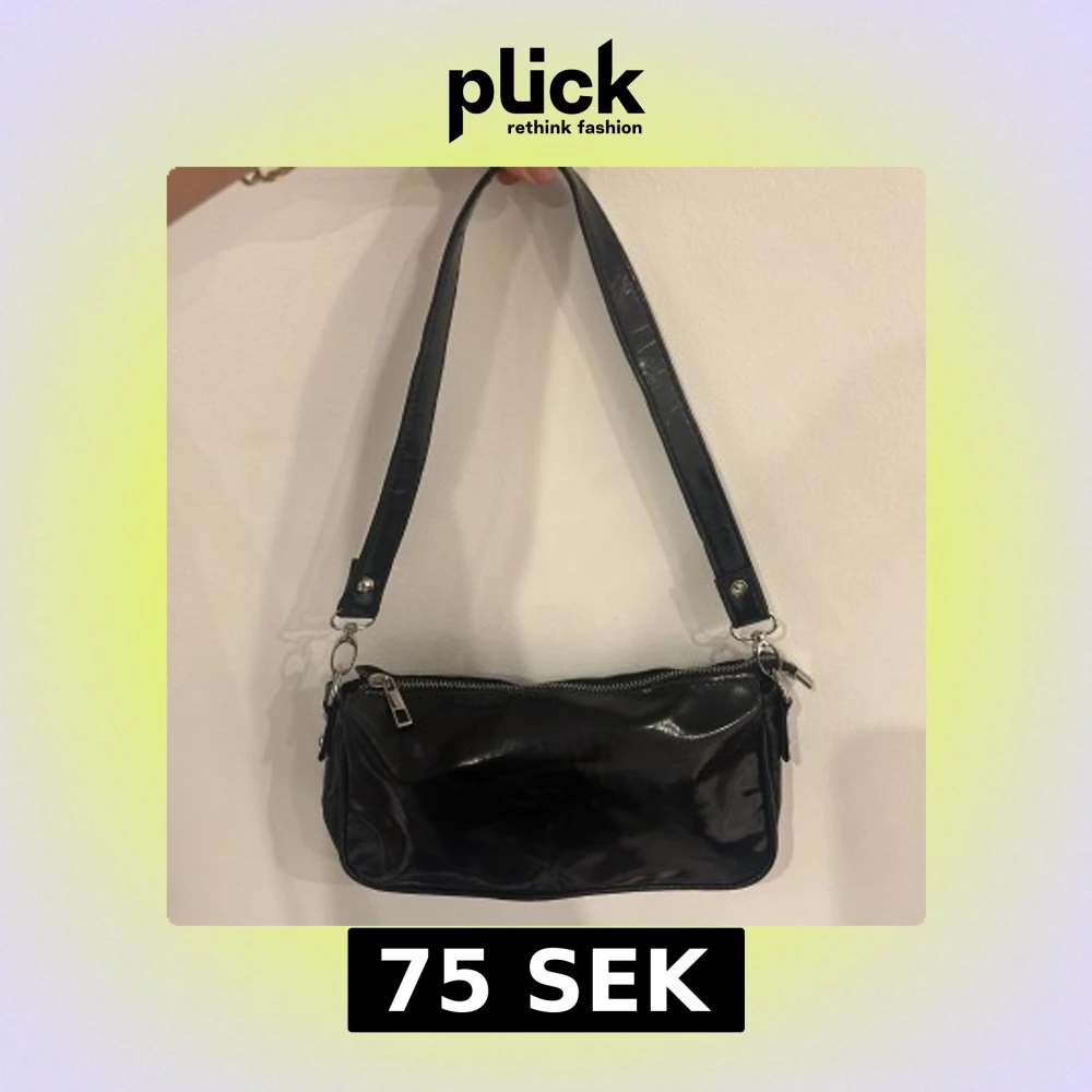 Snygg svart axelväska i glansigt syntetmaterial med dragkedja upptill. Perfekt för att bära dina nödvändigheter med stil. Enkel och elegant design som passar till många tillfällen.🪩