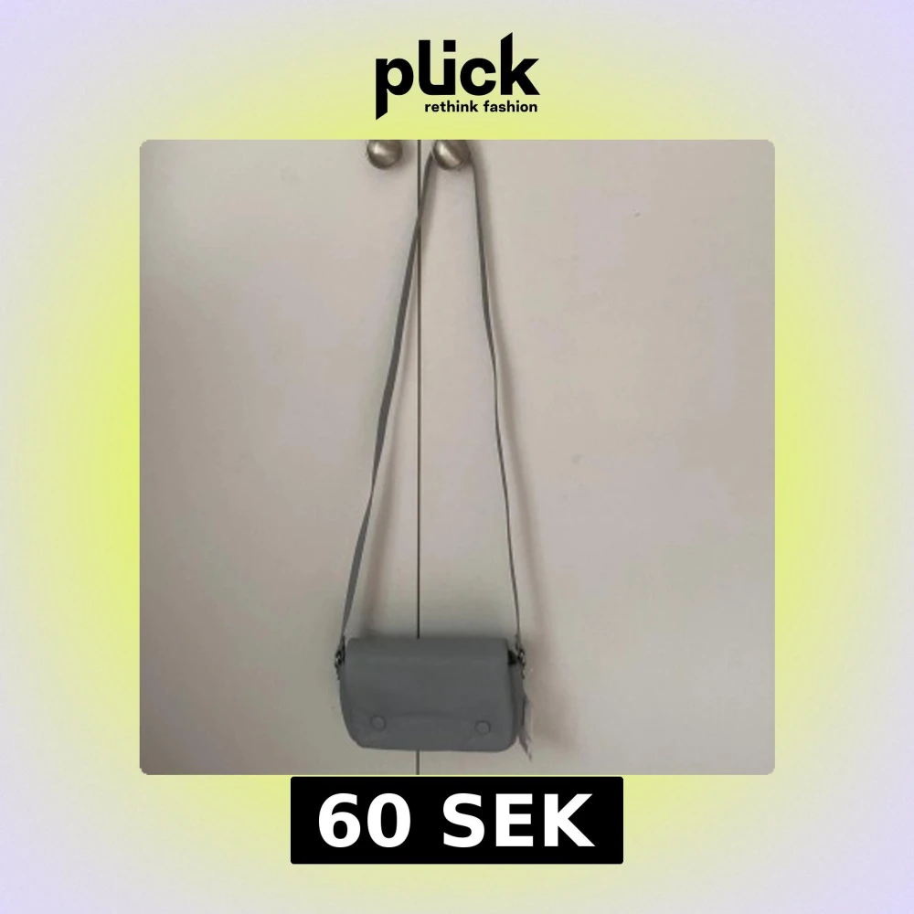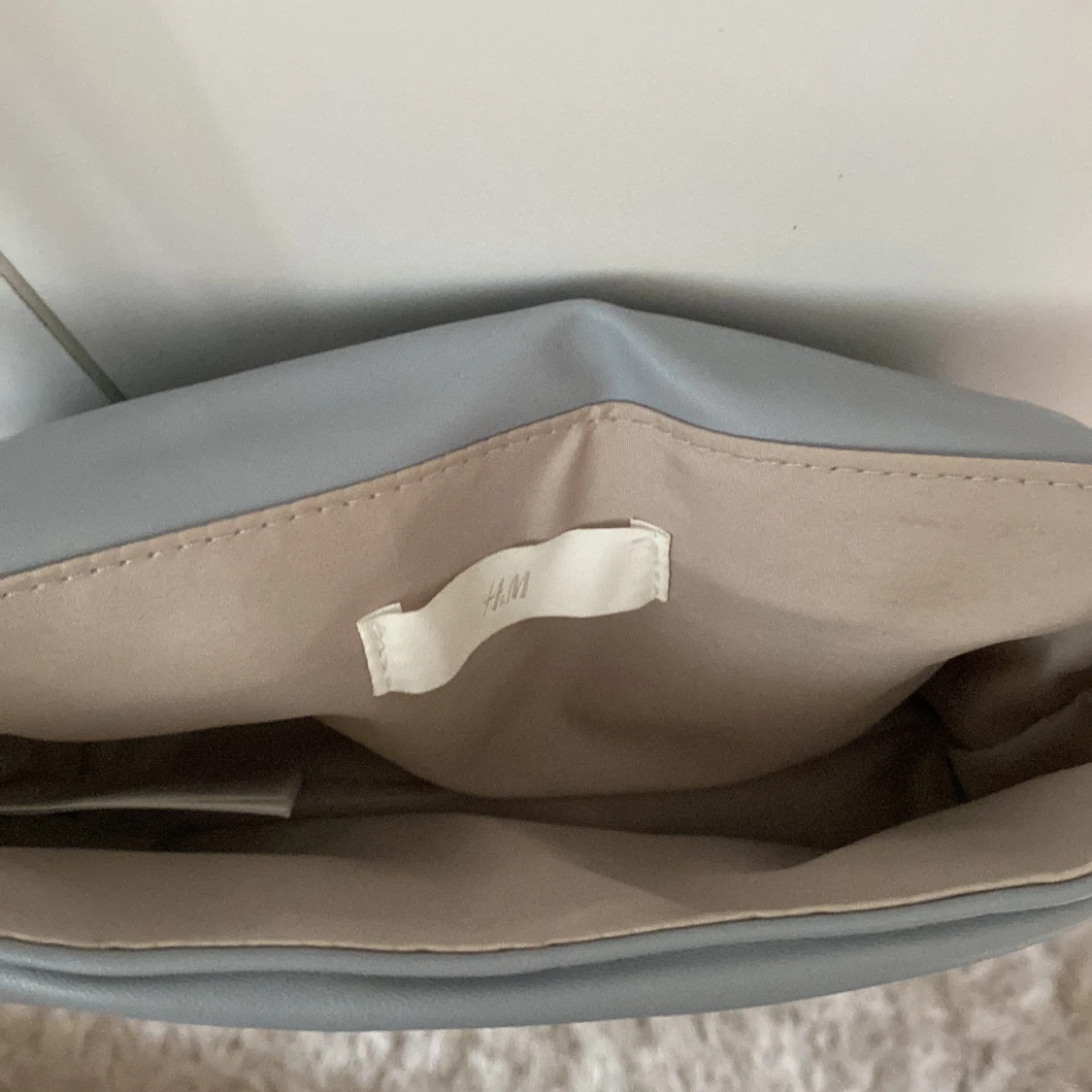 Snygg blågrå axelväska från H&M med stilren design och mjukt syntetmaterial. Väskan har ett lock med två dekorativa knappar framtill. Insidan är beige. ALDRIG ANDVÄND PRISLAPP ÄR KVAR!