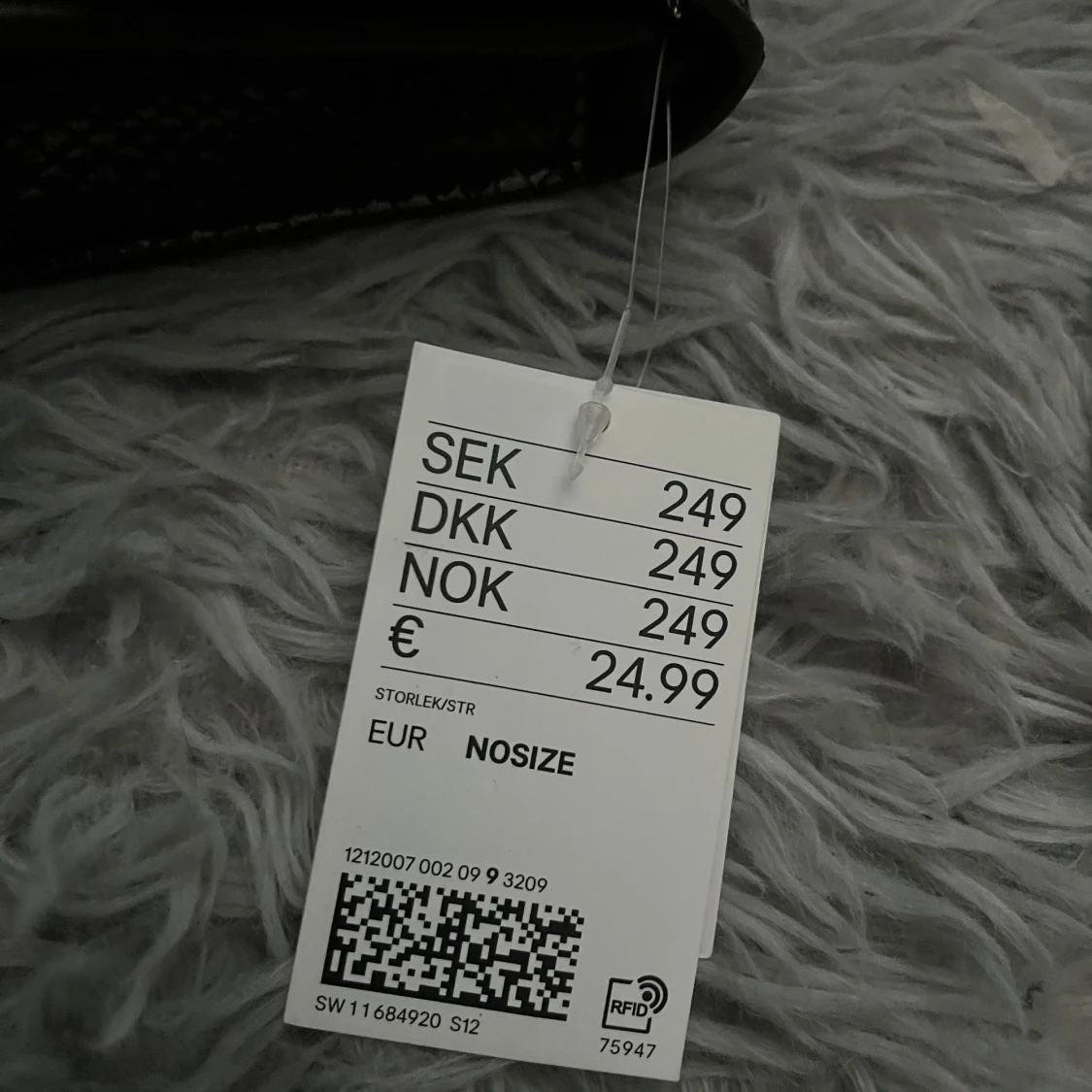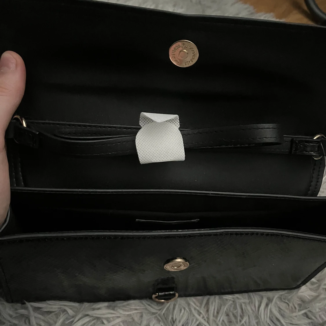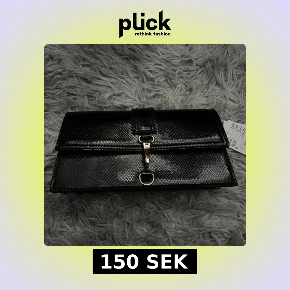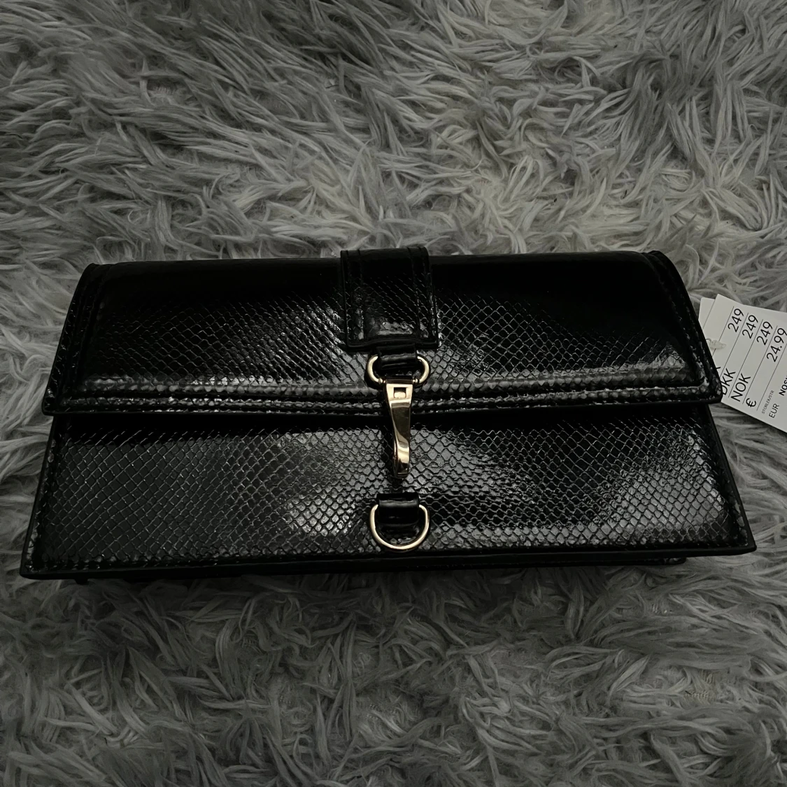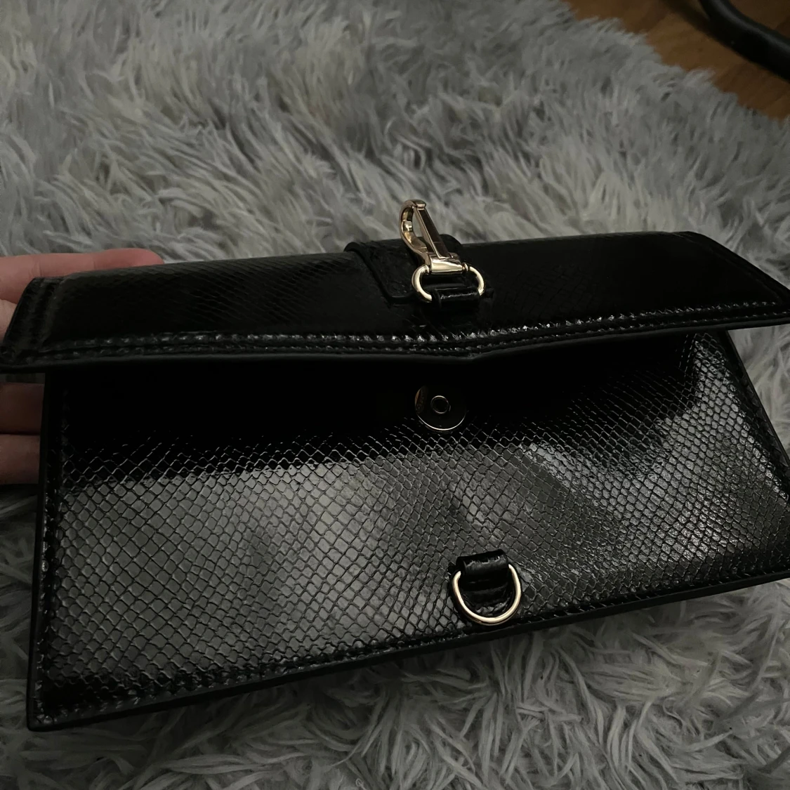 Snygg svart axelväska i syntetmaterial med ormskinnsmönster och guldfärgade metalldetaljer. Väskan har ett lock med spänne och magnetknapp samt justerbar axelrem. Helt oanvänd med prislappen kvar, tyvärr inte med originalförpackningen.