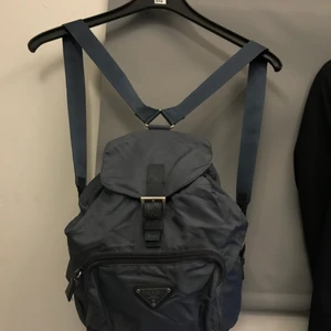 Tja säljer en skit snygg vintage prada nylon ryggsäck Blå/grå Höjd: 32cm Bredd: 35cm 3 fack Lite fading framme syns på bilderna. Inge og +frakt 66kr spårbart