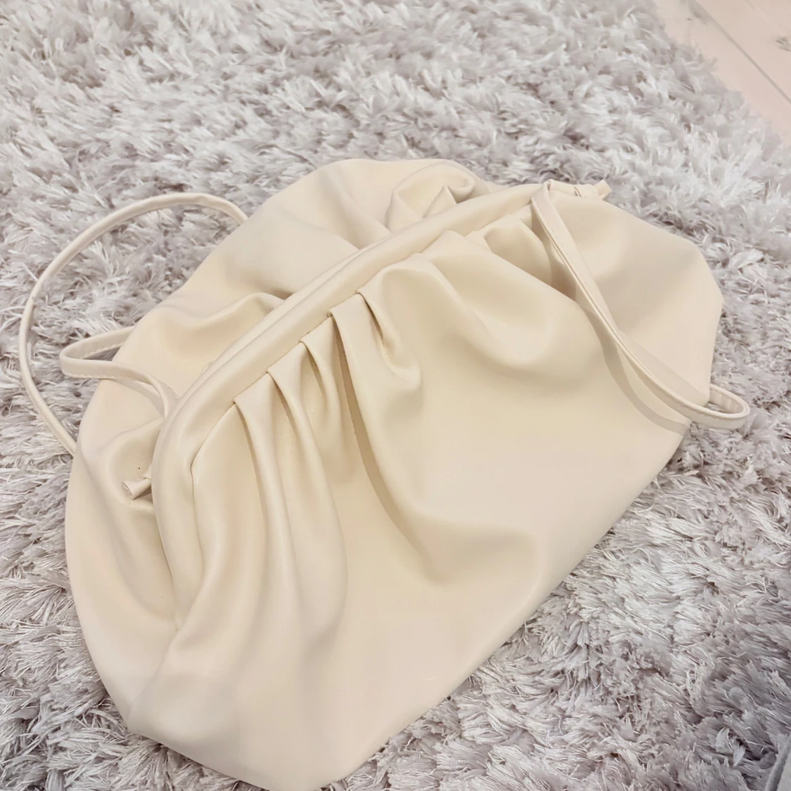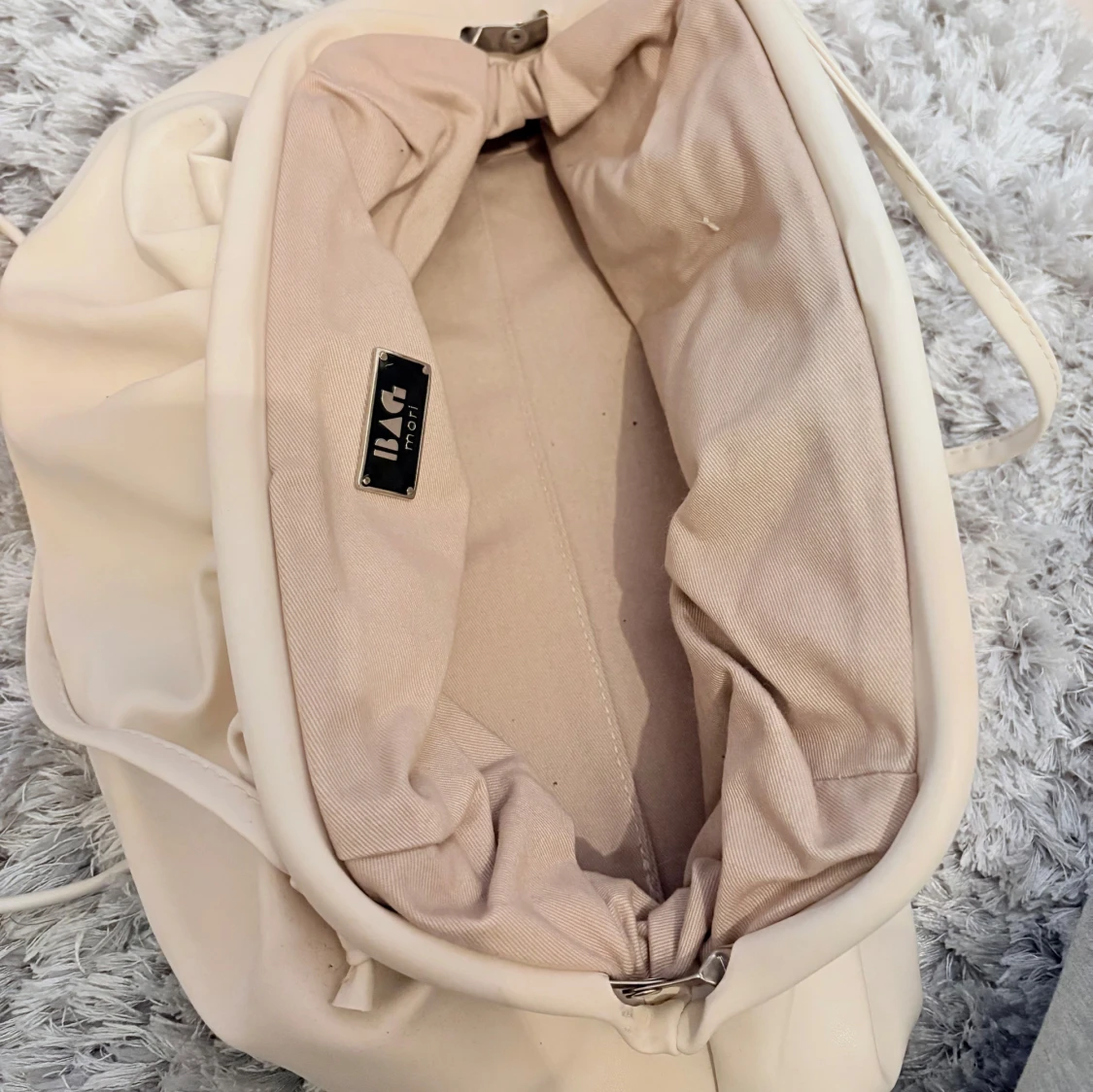Säljer en superfin beige axelväska från BAG mori. Väskan har en mjuk, puffig form med rynkade detaljer upptill och en smal axelrem. Tillverkad i syntetmaterial med tygfoder inuti. Perfekt för dig som gillar stilrena och trendiga accessoarer.
