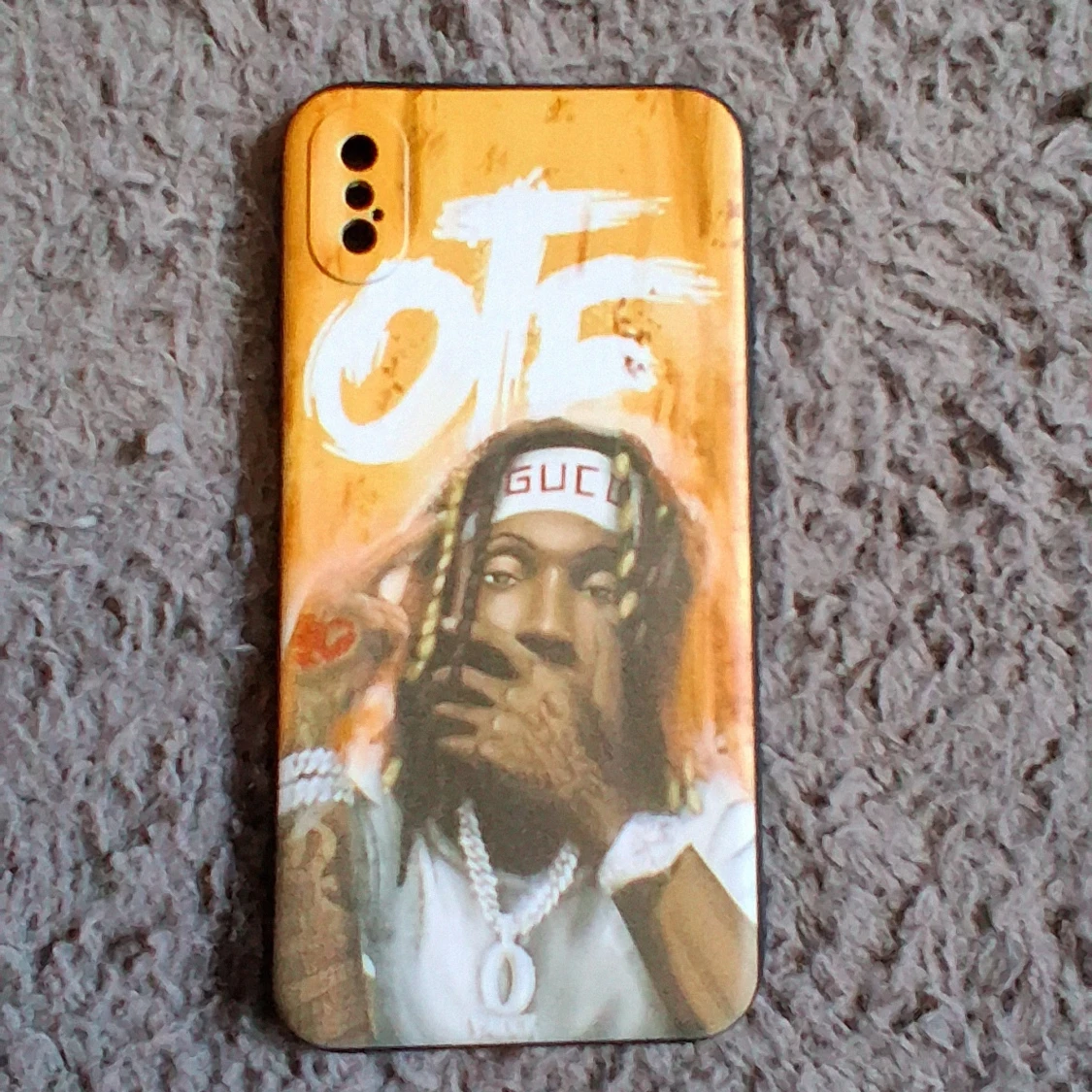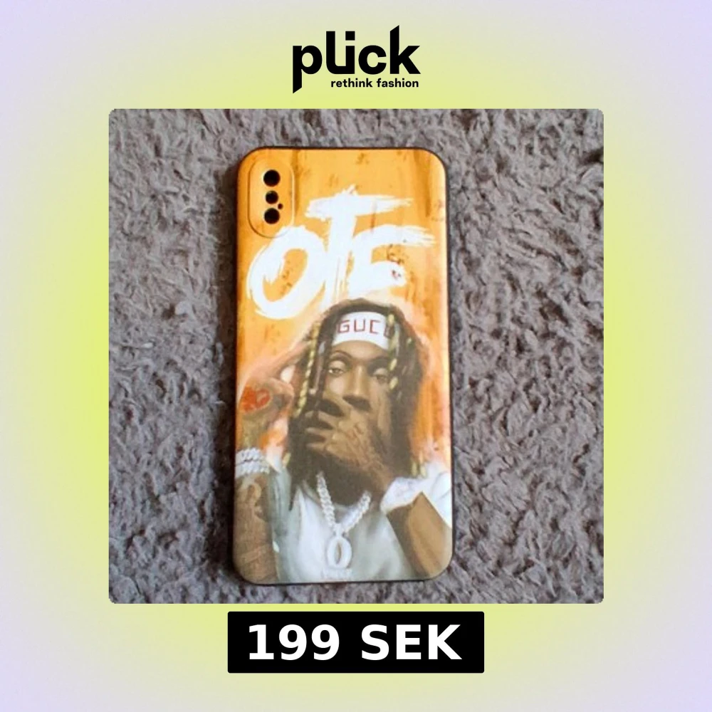 Säljer ett unikt mobilskal med OTF-tryck och coolt motiv på baksidan. Skalet har en gul-orange bakgrund och detaljer i vitt och svart. Passar till mobil med dubbla kameror. Materialet är troligtvis syntet och skalet är lätt och smidigt.