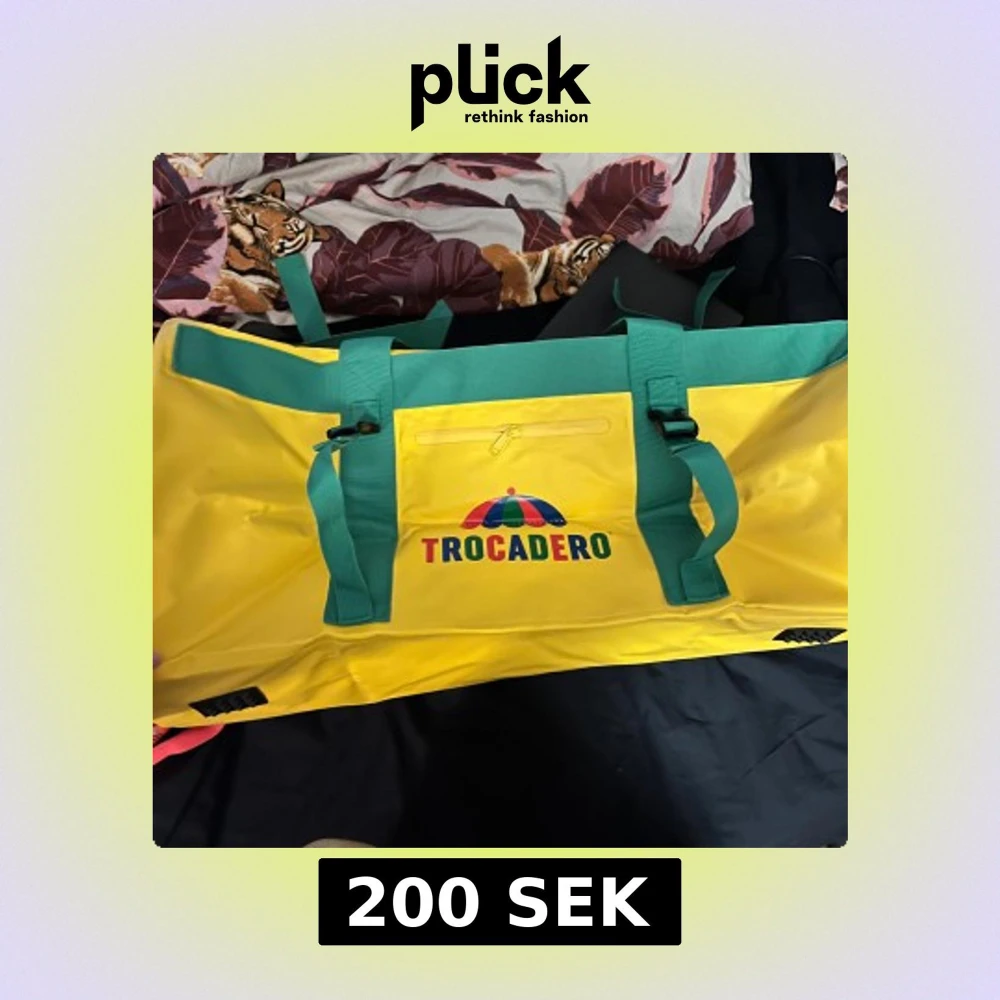 Säljer en färgglad gul och grön väska från Trocadero. Väskan har ett stort fack med dragkedja och justerbara axelremmar. Perfekt för att bära med sig allt man behöver. Den har även ett tryck med Trocadero-loggan i flera färger. Den är sprillans ny priset kan diskuteras
