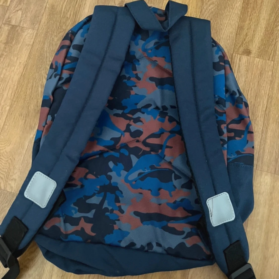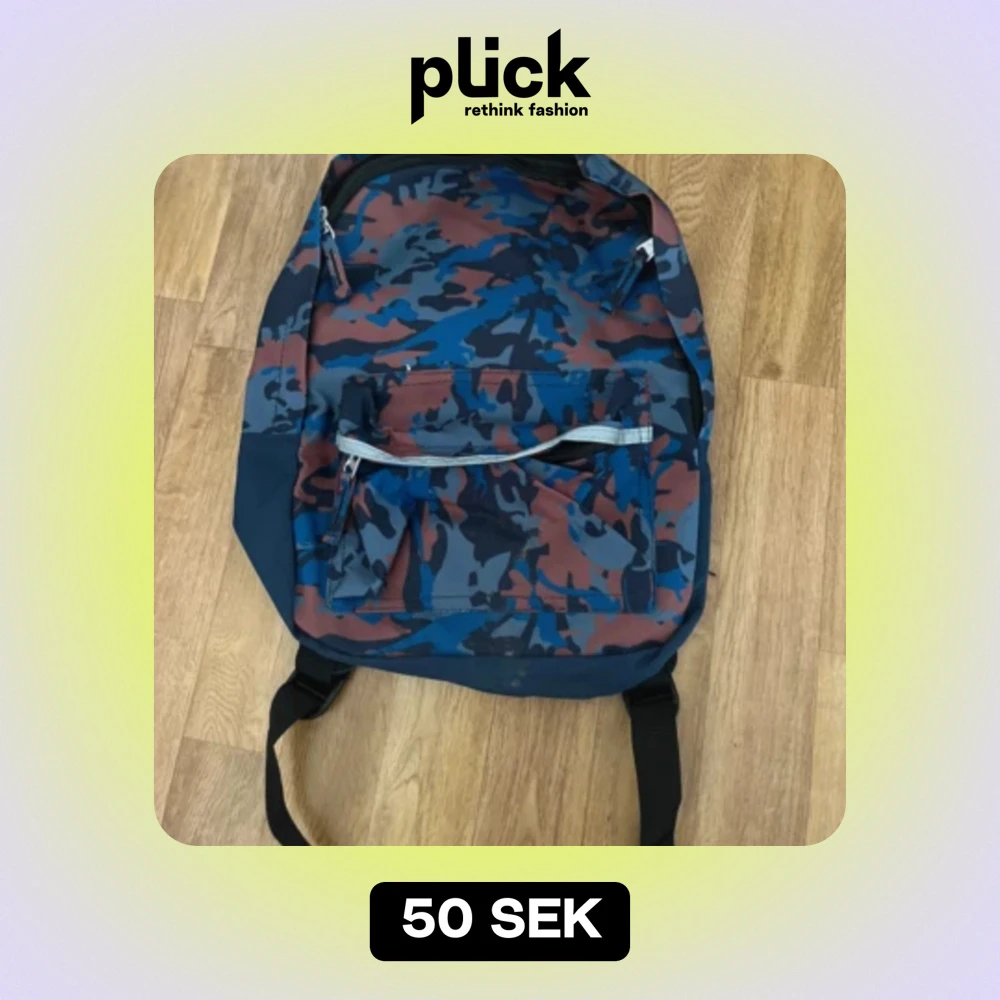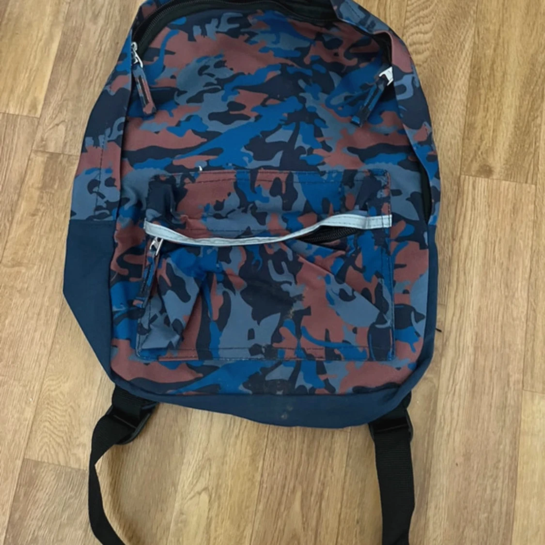 En ryggsäck med kamouflagemönster i blått, brunt och svart. Ryggsäcken har flera dragkedjeförsedda fack och justerbara axelremmar.