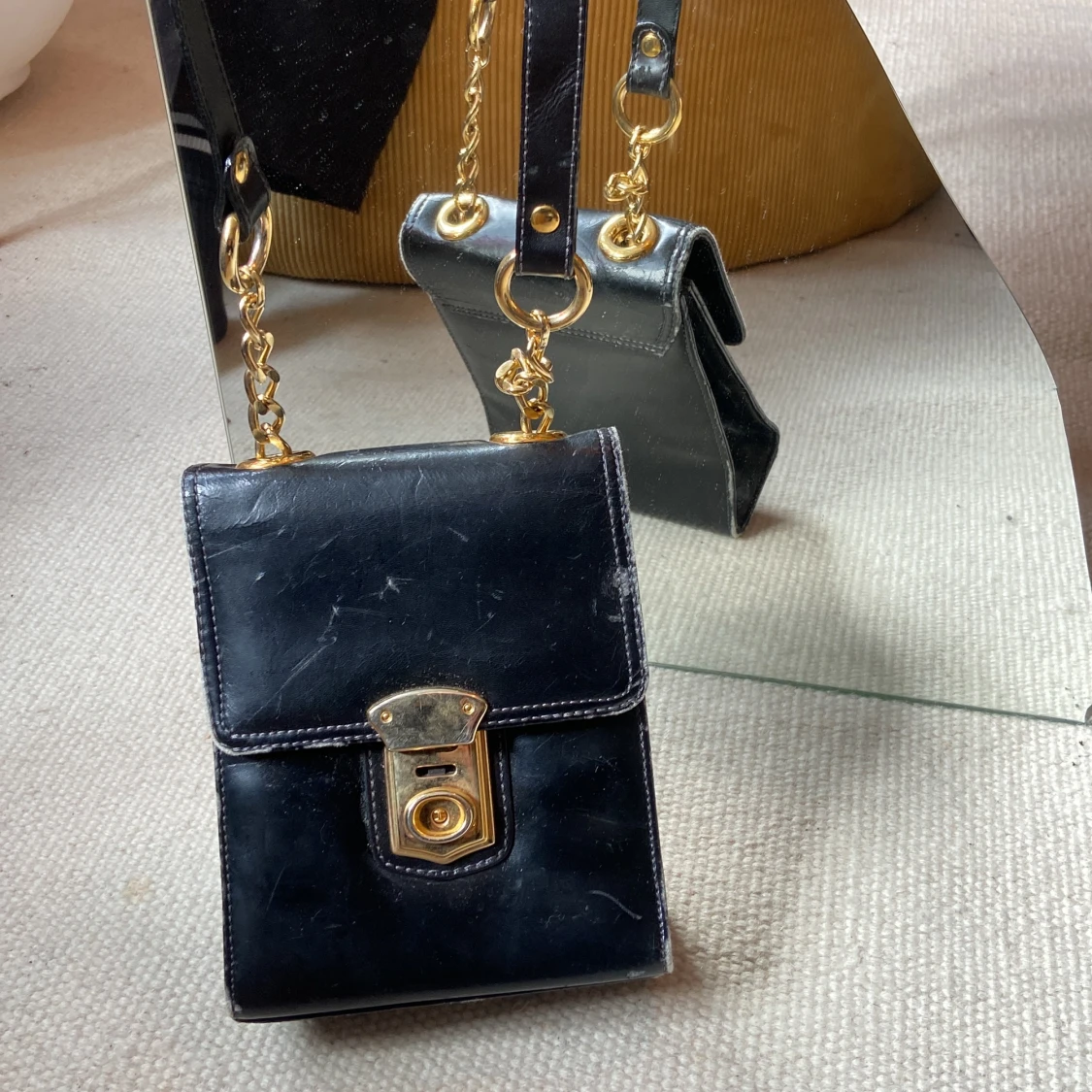 Vintage väska i svart fake läder med gulddetaljer. Justerbar axelrem, tre olika lägen för stängning (om man har mycket saker packat). Och en innerficka med dragkedja.