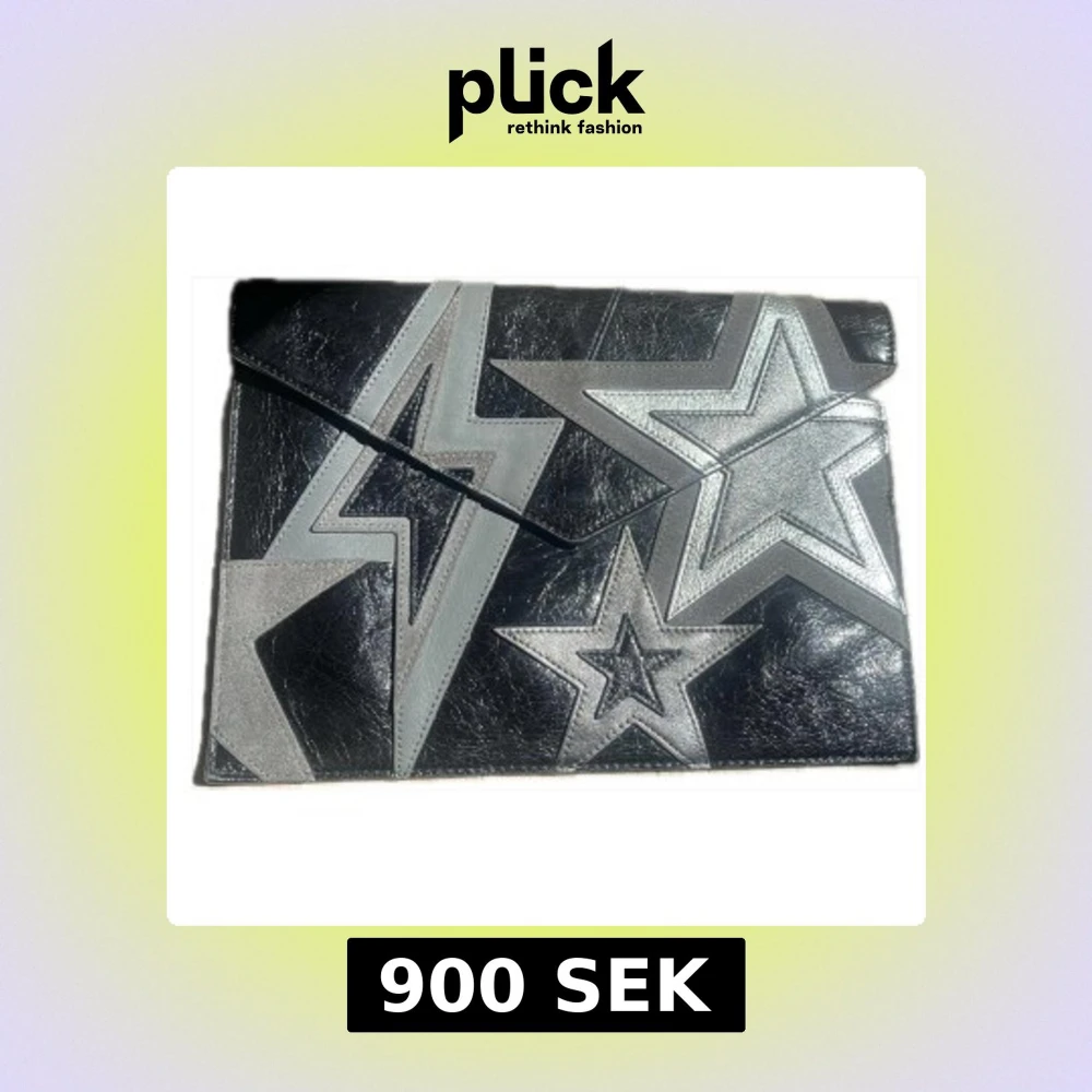 Kuvertväska i svart och silver skinn med stora stjärn- och blixtdetaljer på framsidan. Väskan har ett coolt, grafiskt mönster och stängs med ett lock. Perfekt för dig som vill sticka ut med accessoarer. Från rebecca minkoff, nypris 1895:-