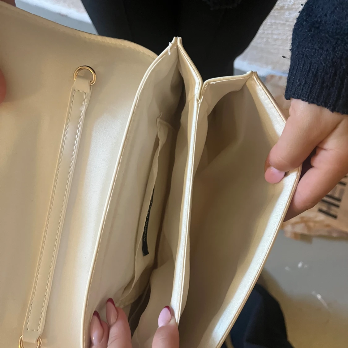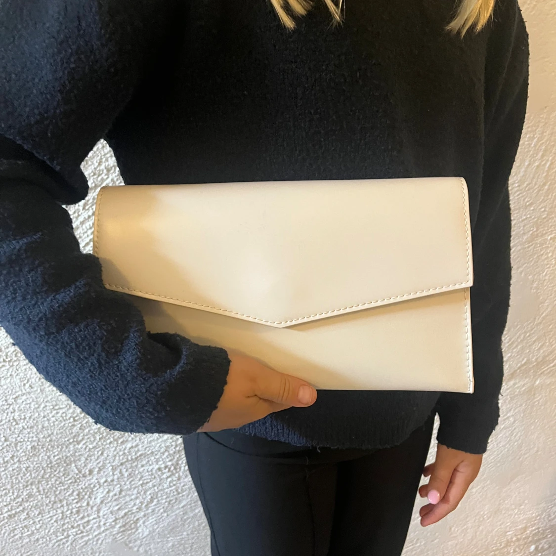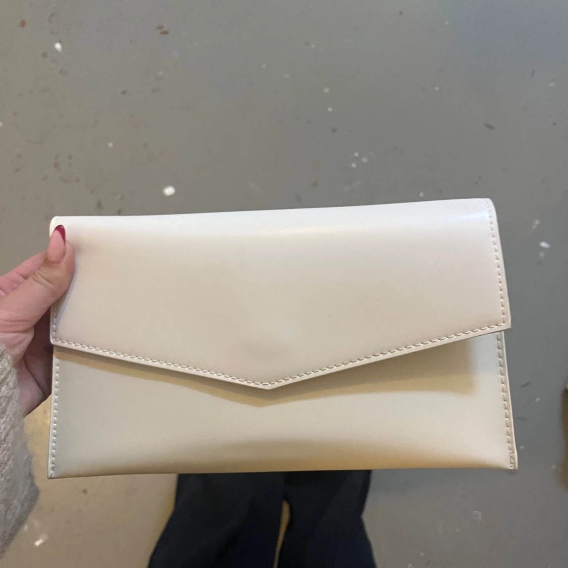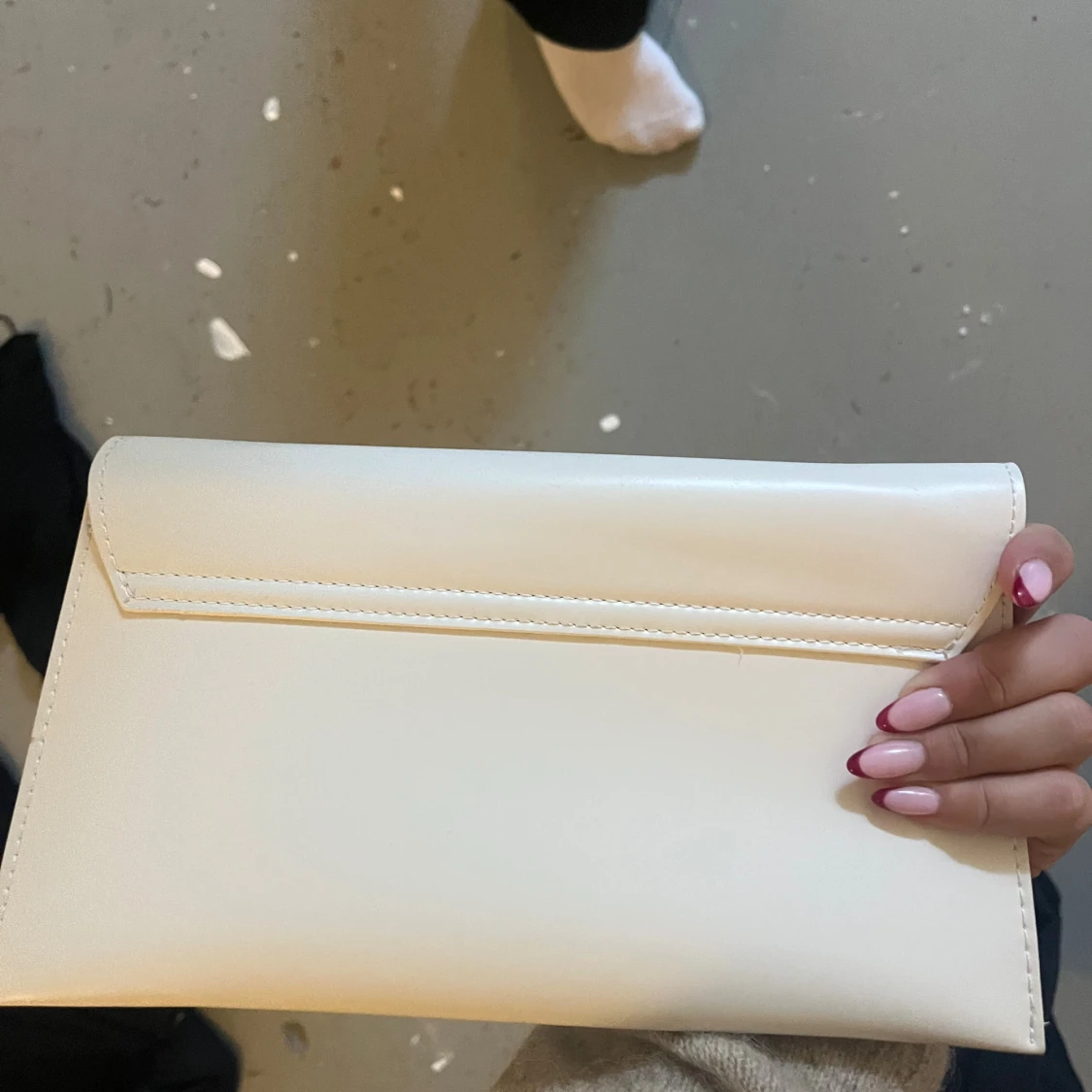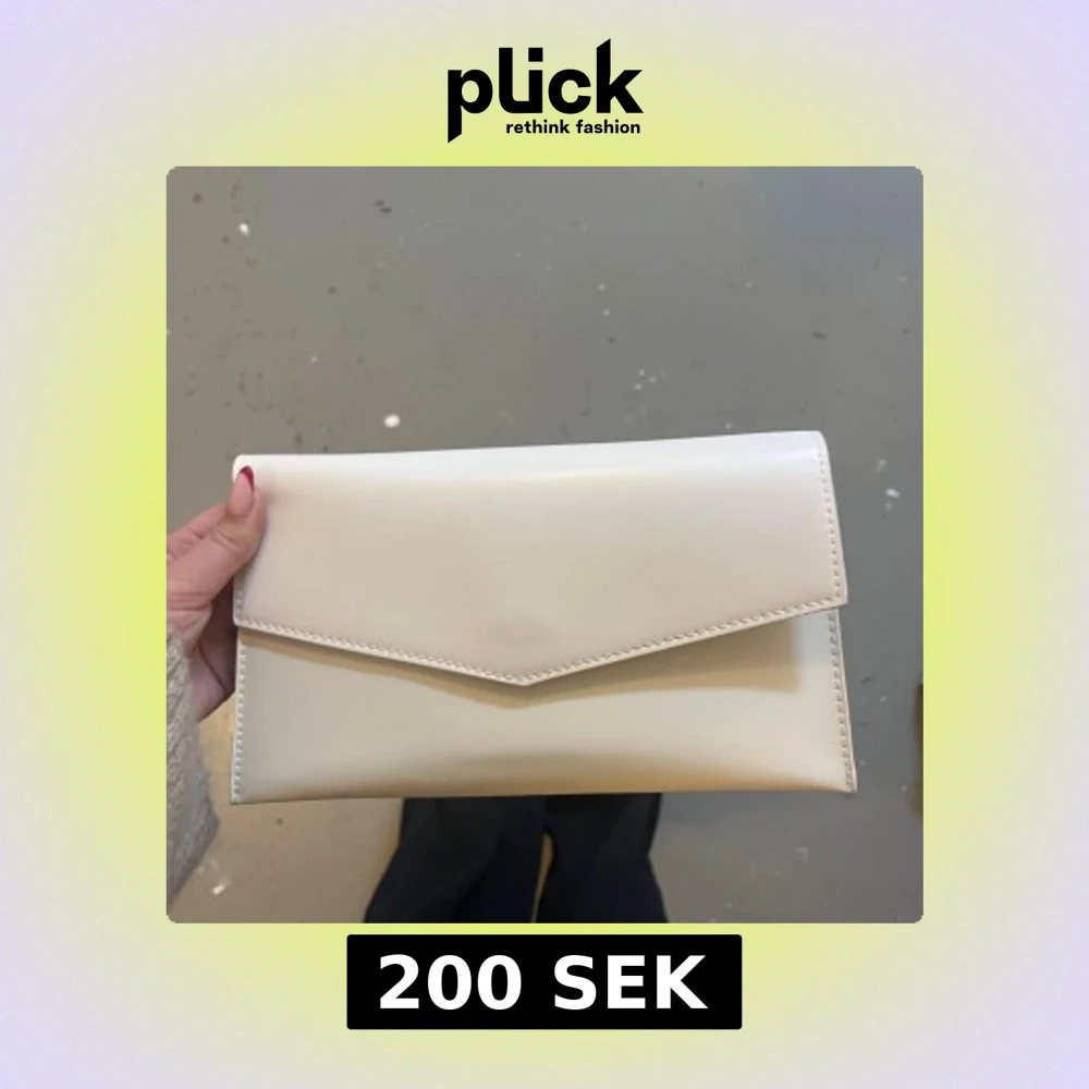 Stilren beige kuvertväska med enkel design och praktiskt innerfack. Väskan har ett klassiskt kuvertlock och stängs med magnet. Perfekt storlek för det viktigaste och lätt att bära i handen. Passar perfekt till bal! Använd en gång endast på bal så jättefint skick