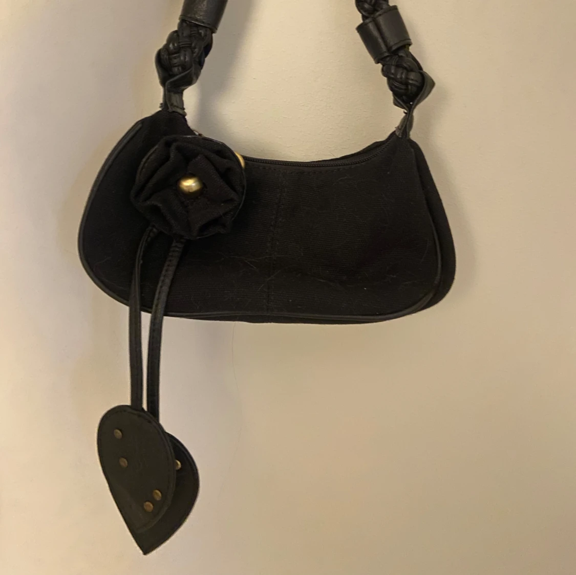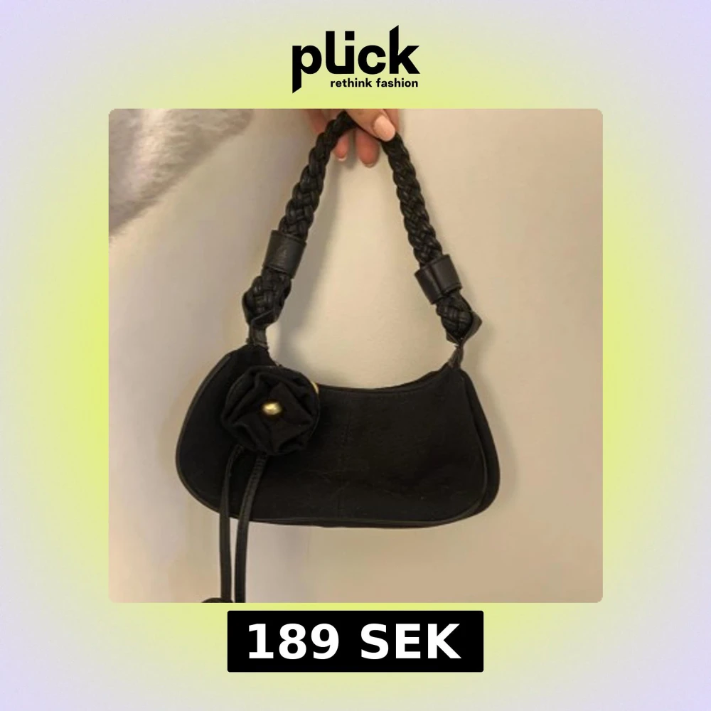 Jätt jättenygg svart vintage axelväska med flätat handtag och superfin blomdetalj framtill. Liten och perfekt att ta med på t.ex konserter med väskförbud, men stor nog att få plats med min stora mobil plus mycket mer! Den har såå fina detaljer💕