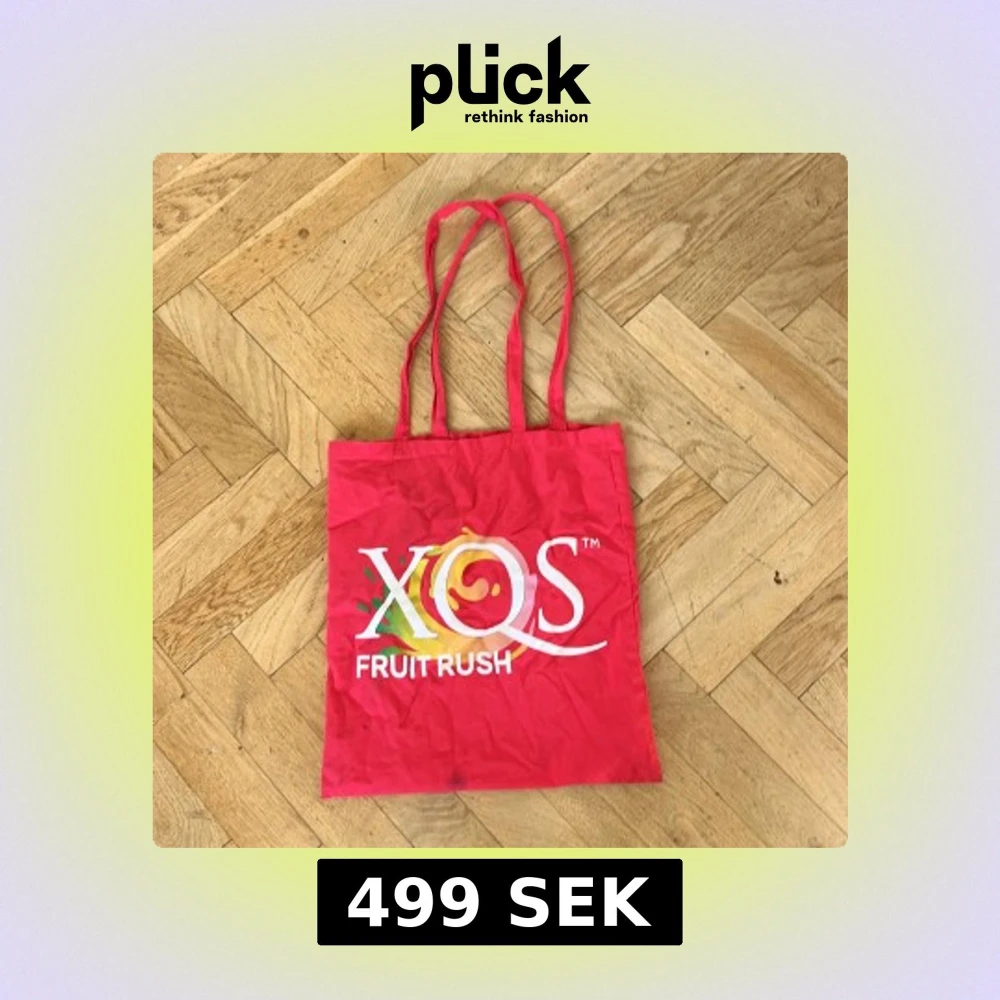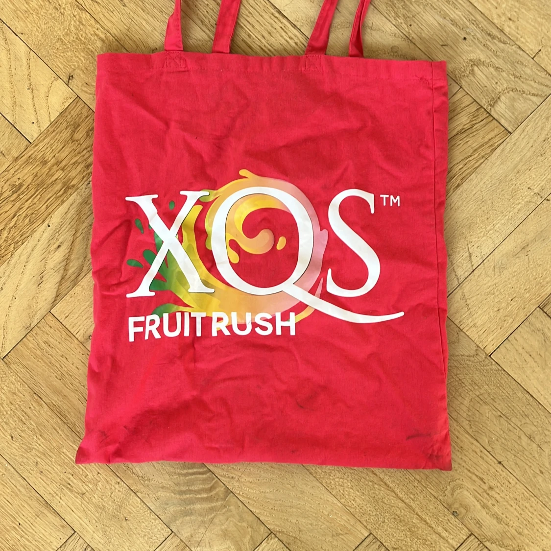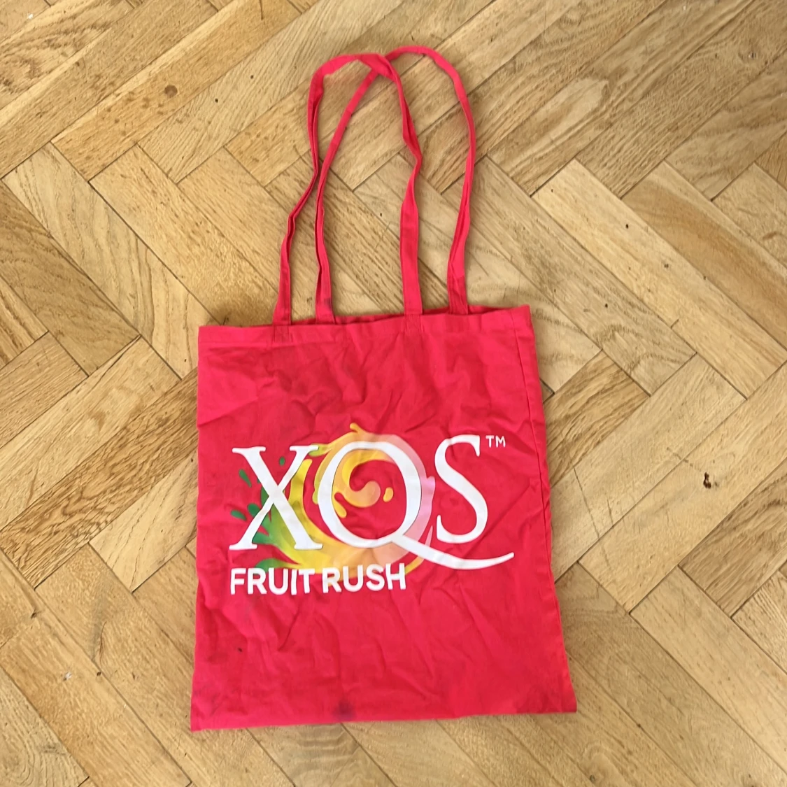 Säljer en röd shoppingväska från XQS med trycket 'Fruit Rush' i vitt och färgglada detaljer. Väskan har långa handtag och är tillverkad i bomull, perfekt för att bära med sig till skolan eller stan. Enkel och snygg design med stor logga på framsidan.